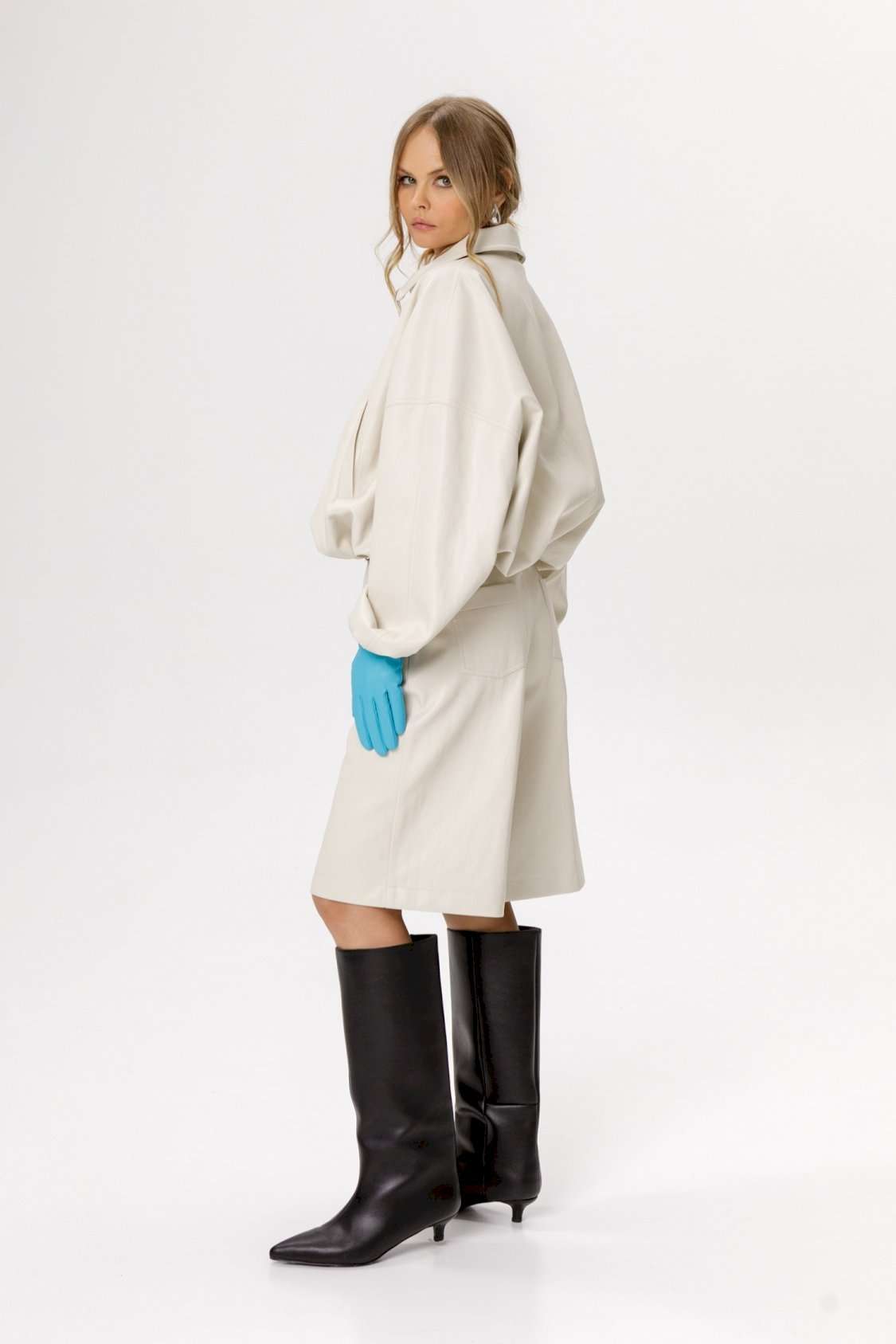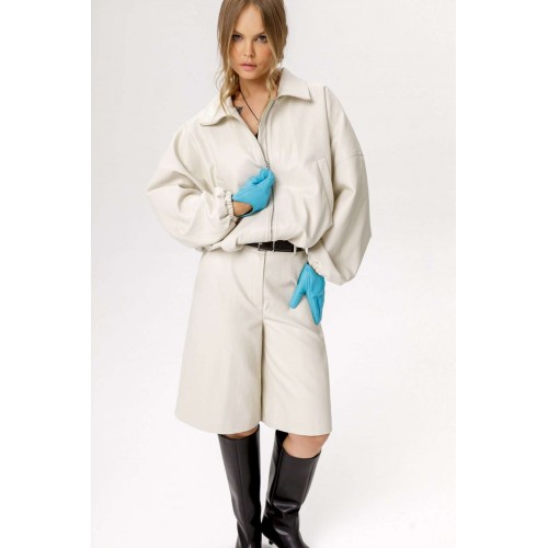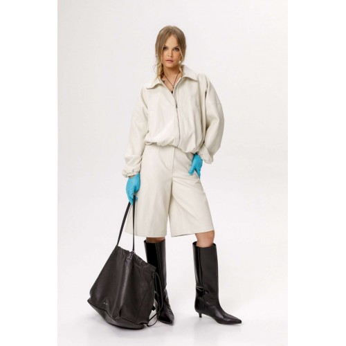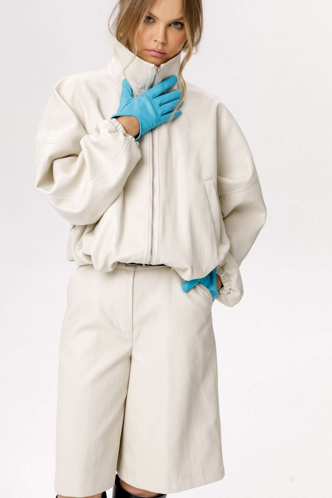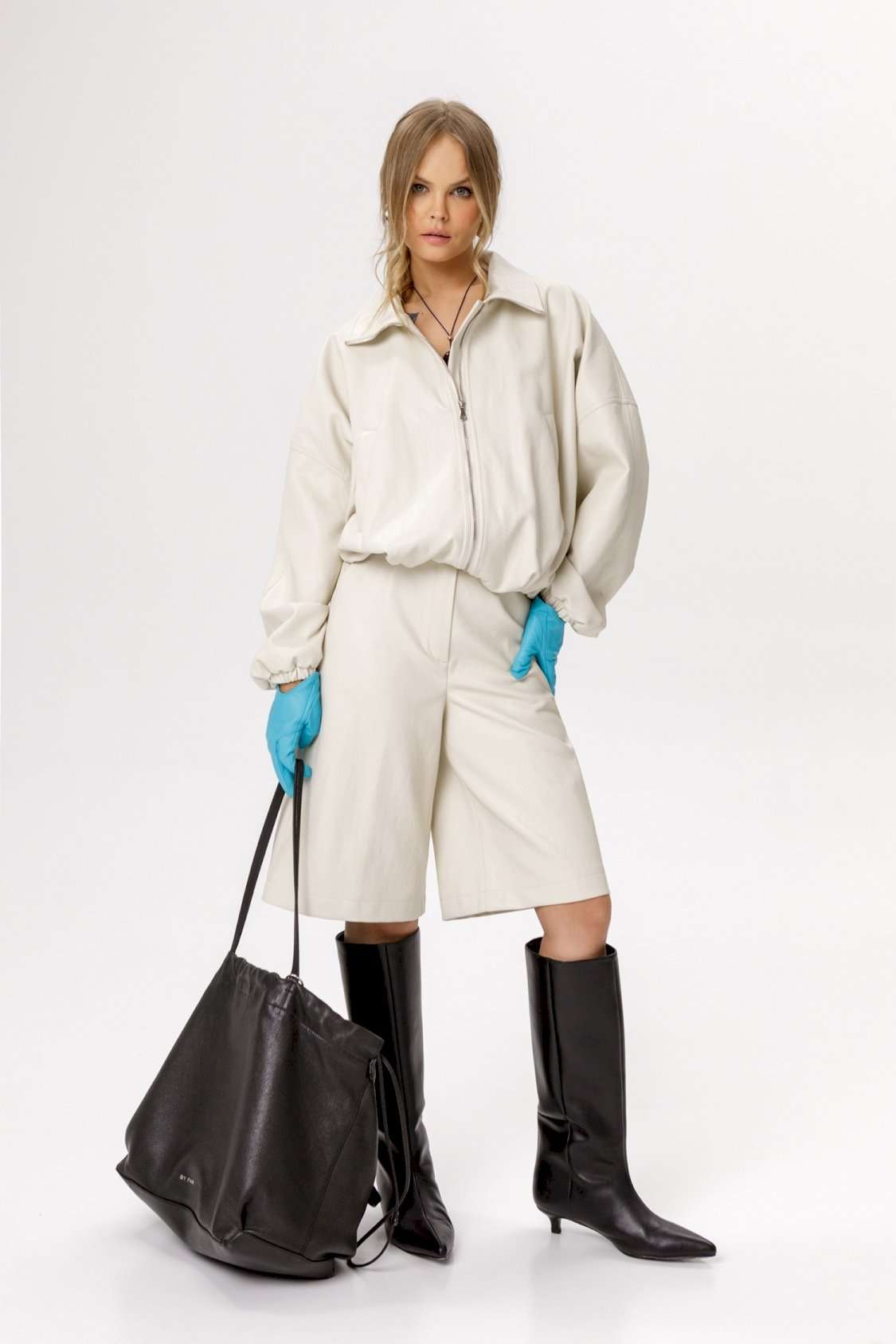 Шорты-бермуды до колена из экокожи (приобрести бомбер с фото можно по арт. 6633). Детали: широкие бермуды, притачной пояс со шлёвками, застёжка на молнию и кнопку, перед с наклонными карманы, спинка с кокеткой и двумя накладными карманами. Длина по боковому шву с поясом около 60 см в размерах 40-52. Длина по внутреннему шву около 31 см в размерах 40-52. (приобрести бомбер с фото можно по арт. 6633)