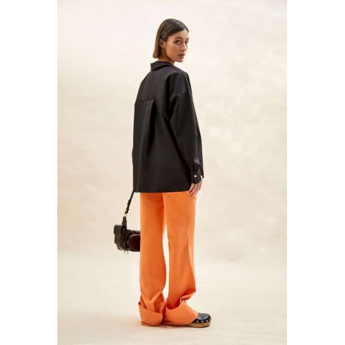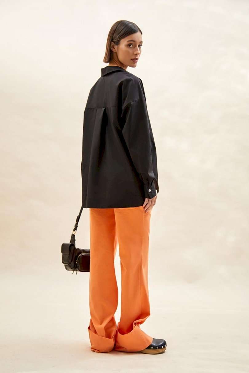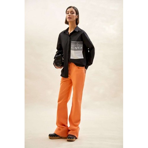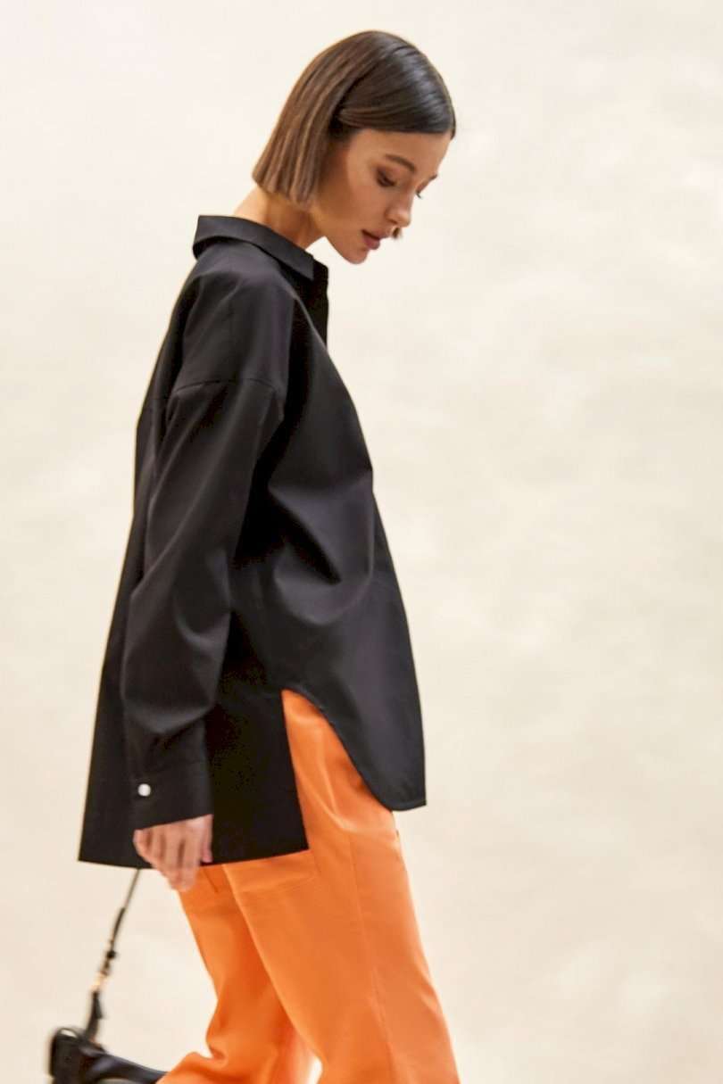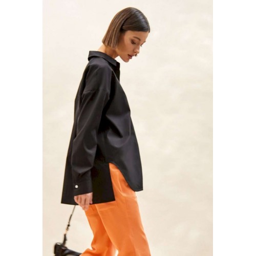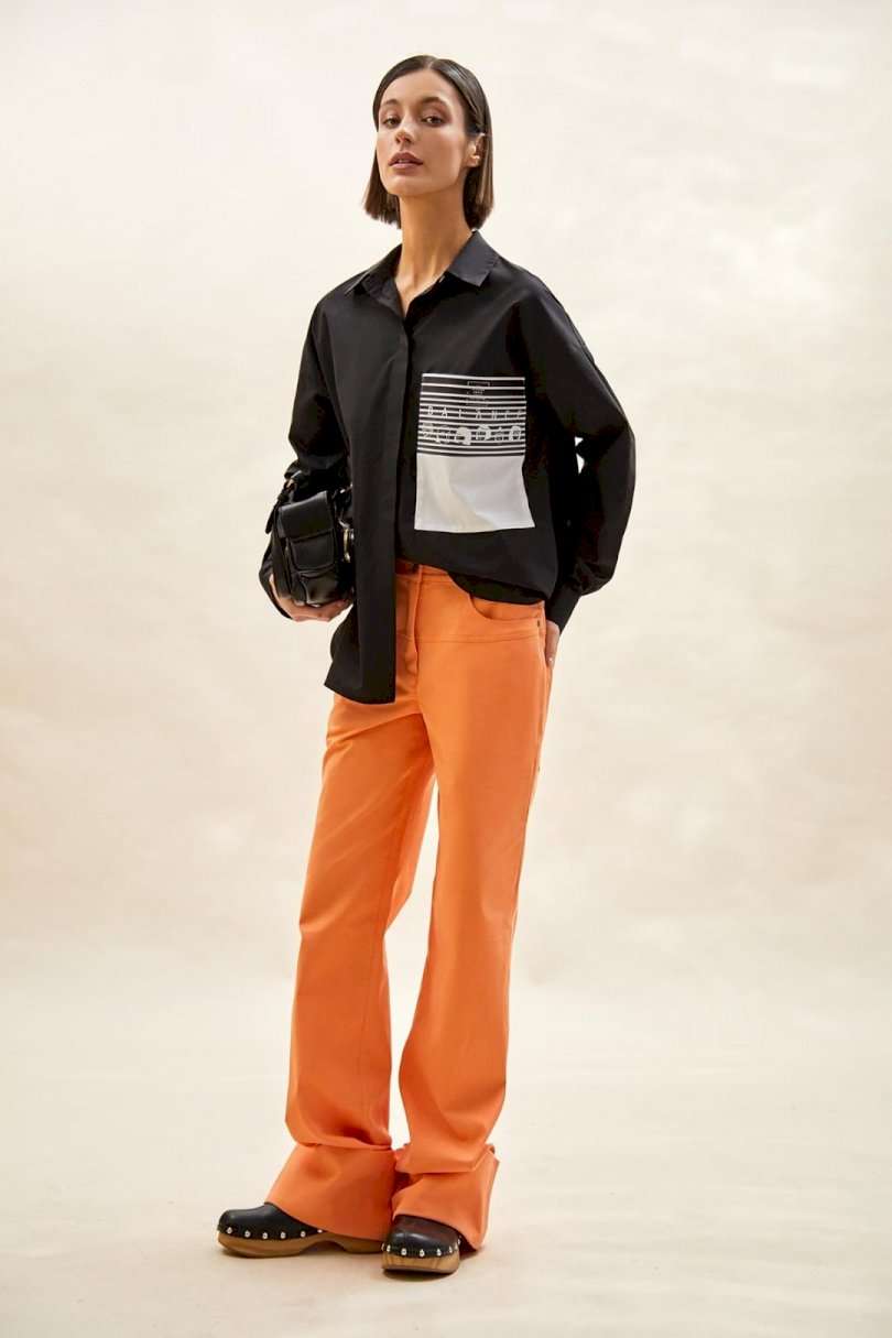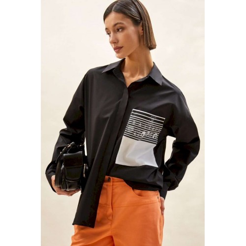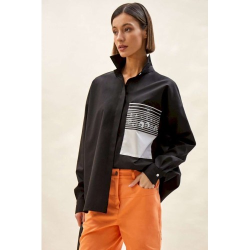 Блуза: - прямой силуэт; - спущенная линия плеча; - застежка на потайную планку с пуговицами; - слева накладной карман контрастного цвета с принтом и брошкой; - воротник рубашечный; - на спинке кокетка и бантовая складка; - спереди линия низа фигурная, сзади - прямая; - на стойке и манжетах пуговицы контрастного цвета.