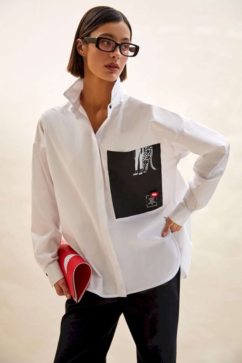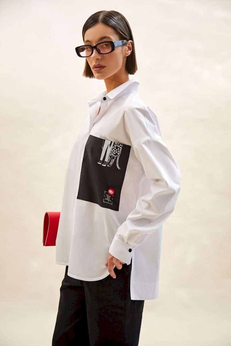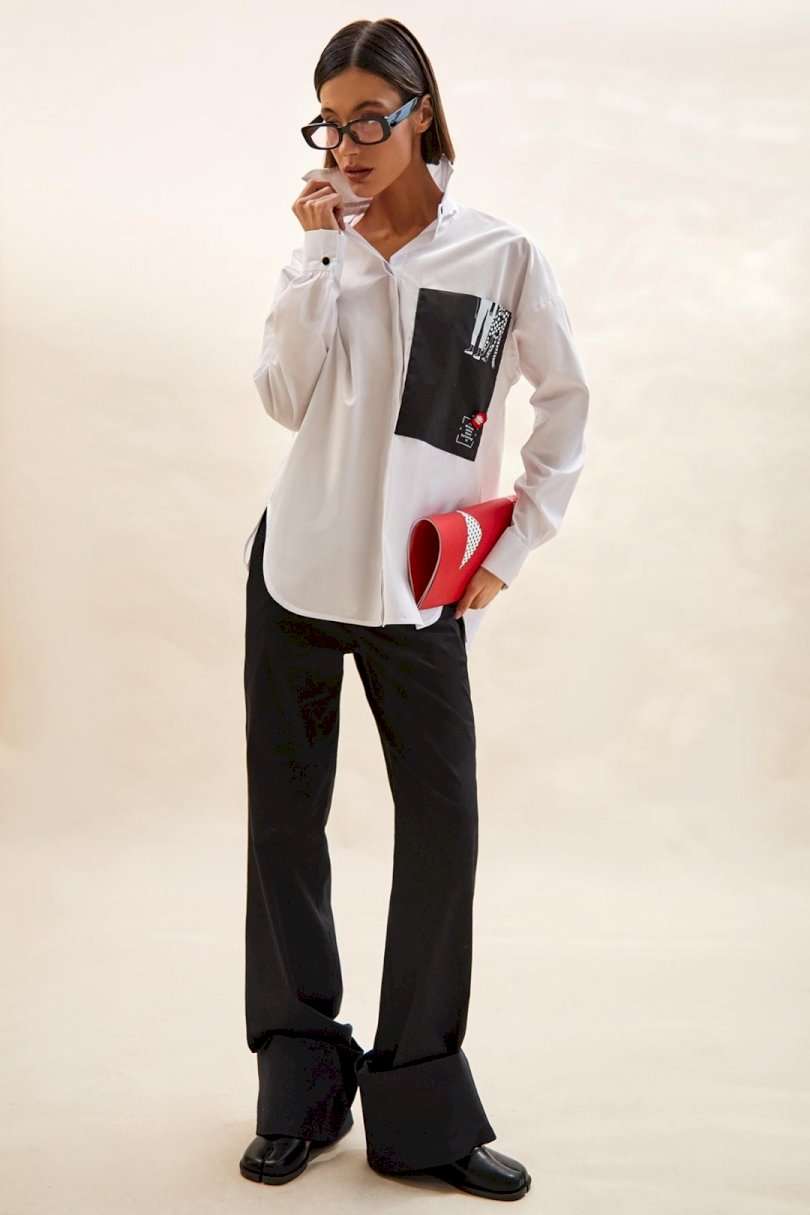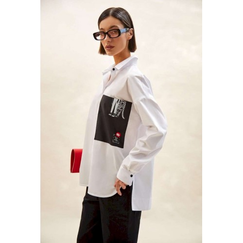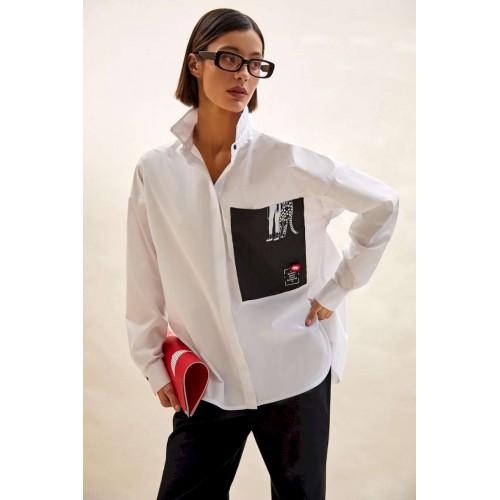 Блуза: - прямой силуэт; - спущенная линия плеча; - застежка на потайную планку с пуговицами; - слева накладной карман контрастного цвета с принтом и брошкой; - воротник рубашечный; - на спинке кокетка и бантовая складка; - спереди линия низа фигурная, сзади - прямая; - на стойке и манжетах пуговицы контрастного цвета.