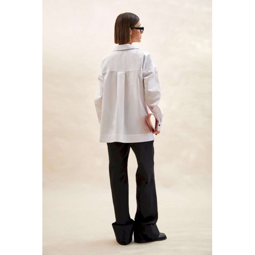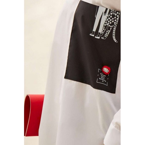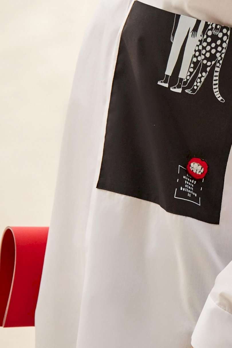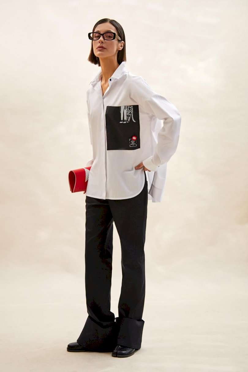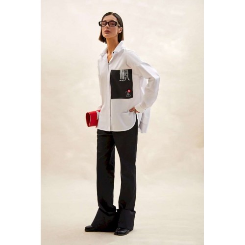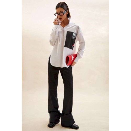 Блуза: - прямой силуэт; - спущенная линия плеча; - застежка на потайную планку с пуговицами; - слева накладной карман контрастного цвета с принтом и брошкой; - воротник рубашечный; - на спинке кокетка и бантовая складка; - спереди линия низа фигурная, сзади - прямая; - на стойке и манжетах пуговицы контрастного цвета.