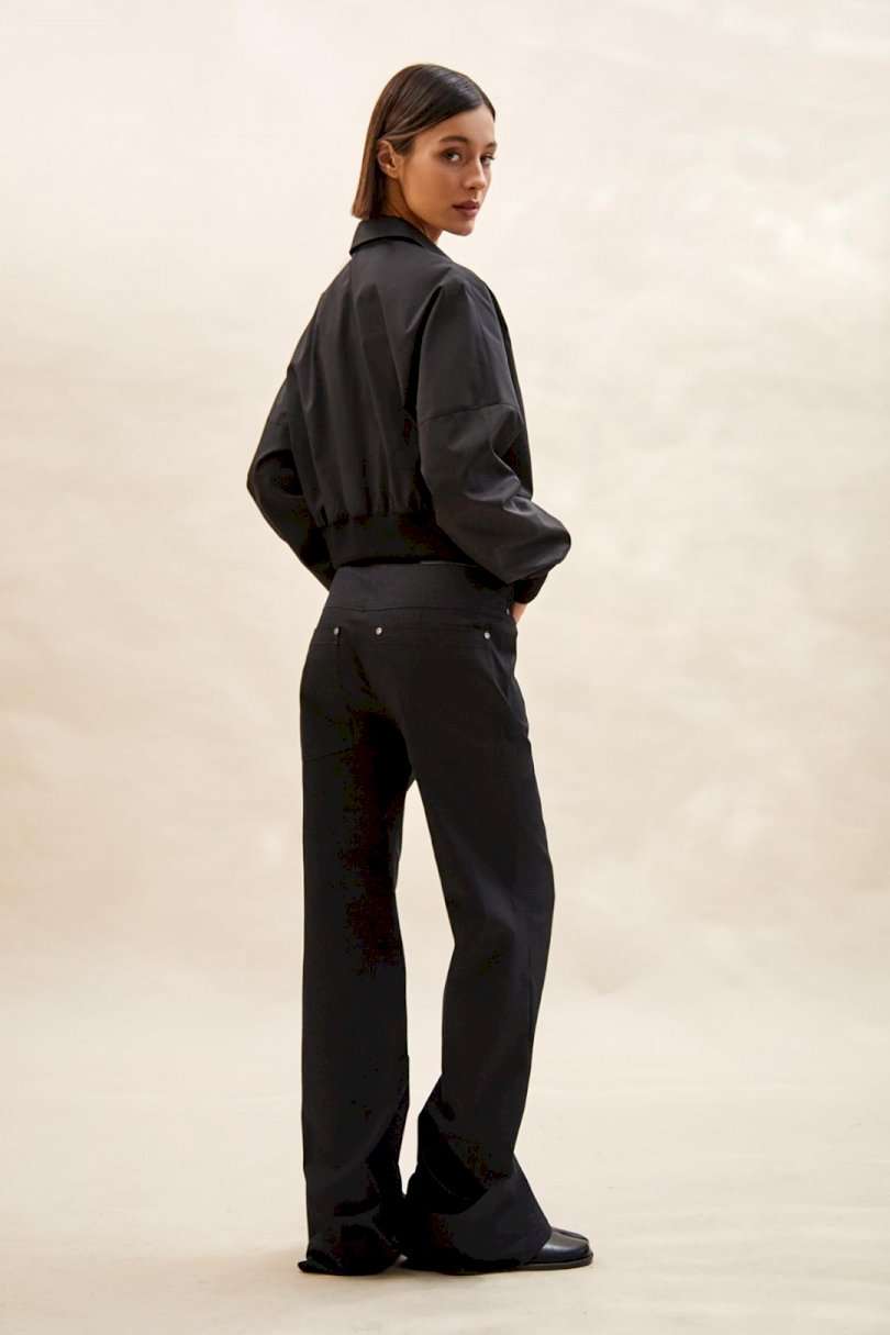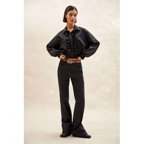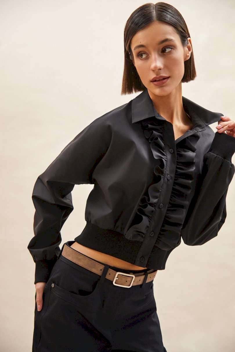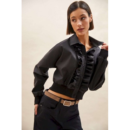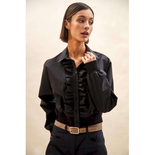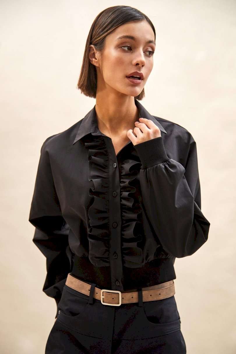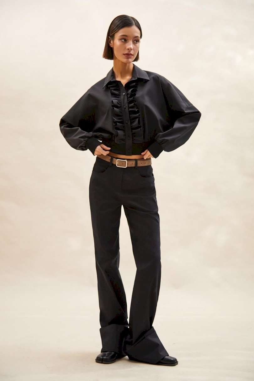 Блуза: - О-силуэт; - спущенная линия плеча; - застежка на планку с пуговицами и двумя оборками вдоль планки; - воротник рубашечный; - манжета и низ блузки из трикотажной резинки в рубчик (кашкорсе).