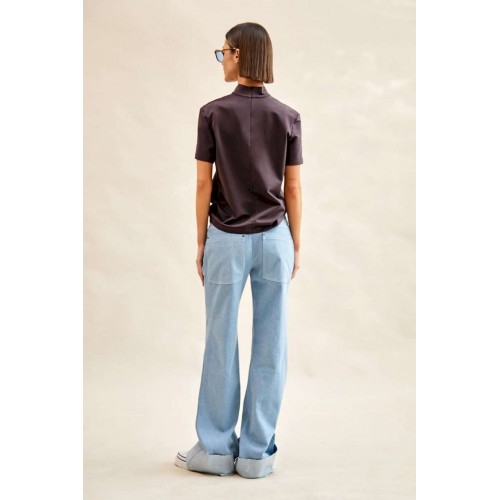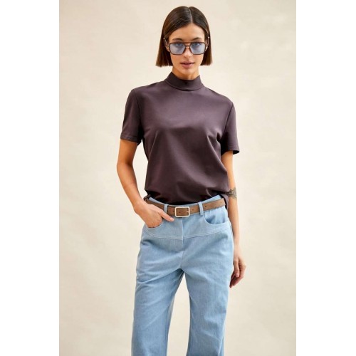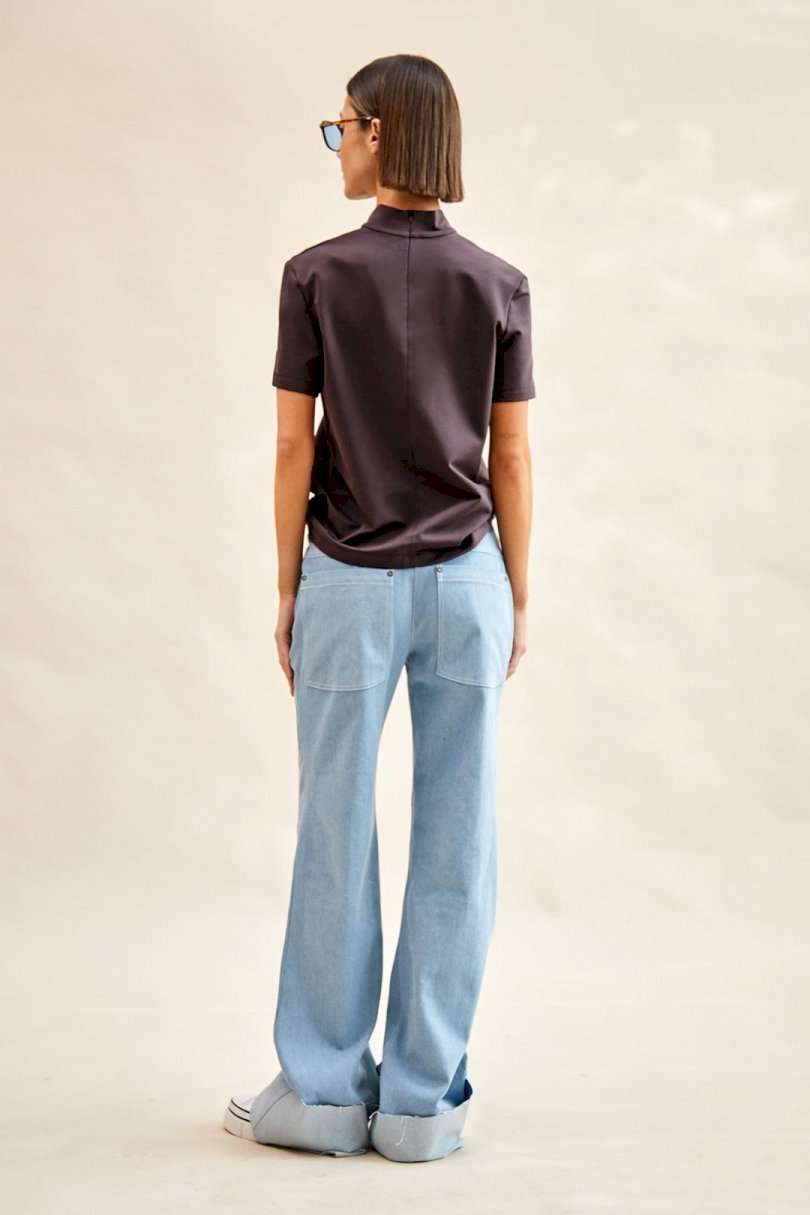Топ со стойкой: - ткань - футер двухнитка; - силуэт прямой; - рукав короткий втачной; - воротник стойка; - застежка на потайную молнию в среднем шве спинки.
