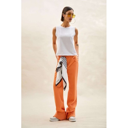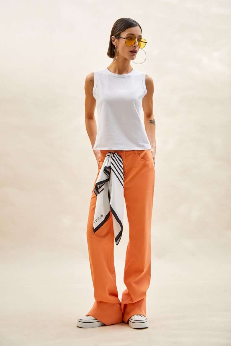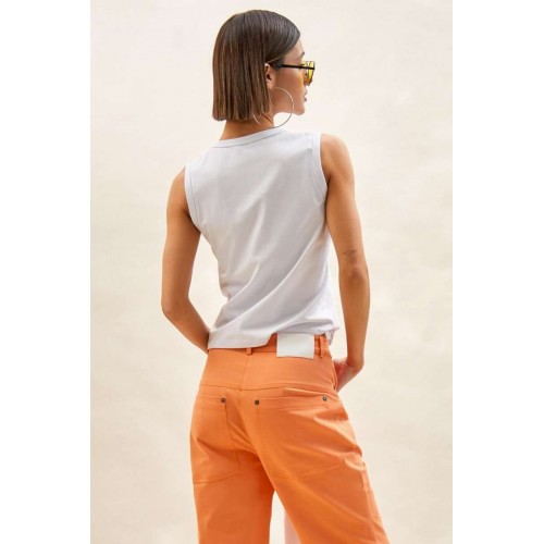 Топ: - прилегающий силуэт; - круглый вырез горловины; - окантовка по горловине и проймам; - укороченная линия плеча.