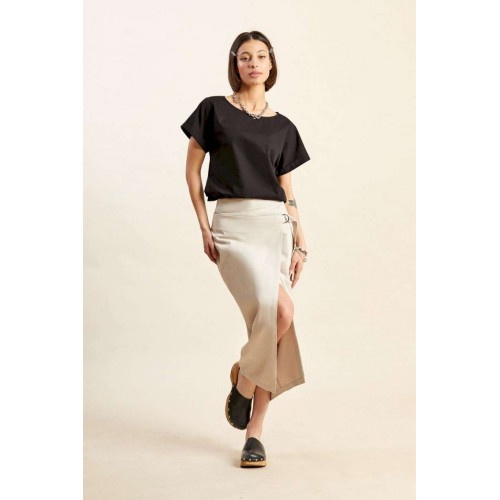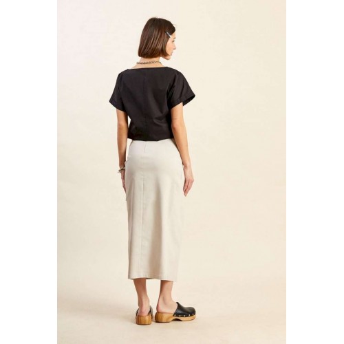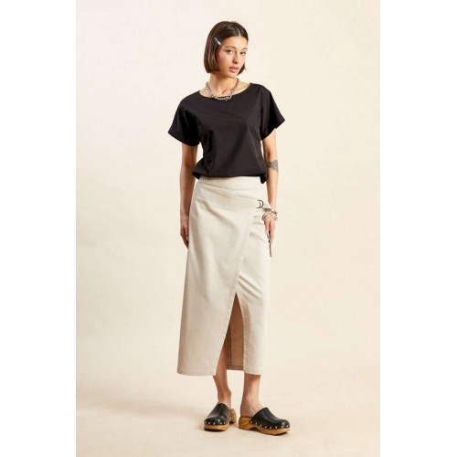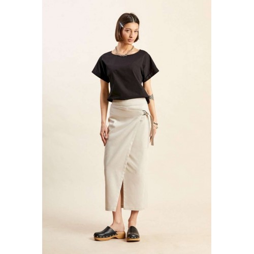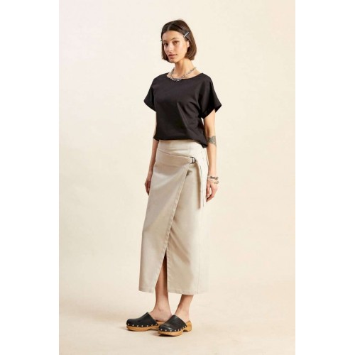 Юбка: - силуэт прямой; - длина миди; - спереди левая часть с высоким вырезом, а правая на запах, с застёжкой на пряжку-полукольца и пояс; - застёжка на потайную молнию в среднем шве сзади; - спереди и сзади вытачки; - слегка заниженная талия, с поясом, входящим в молнию.