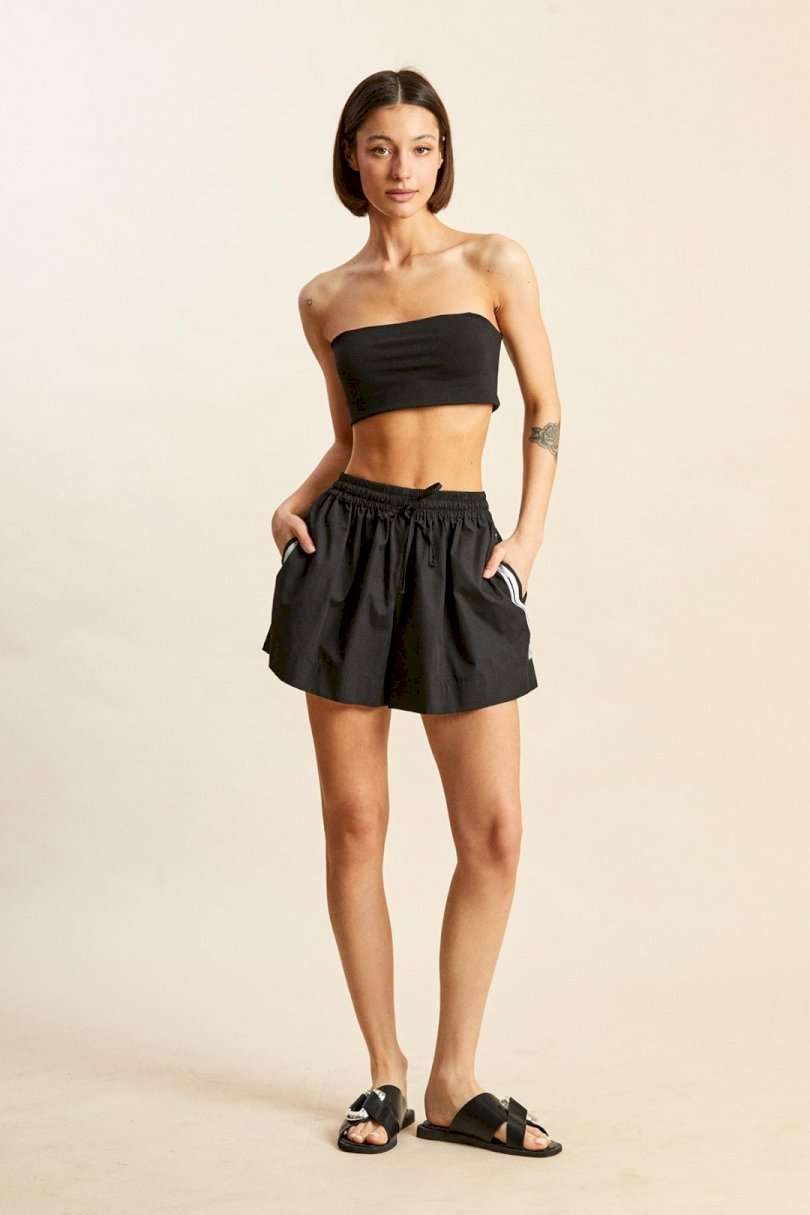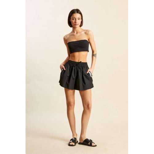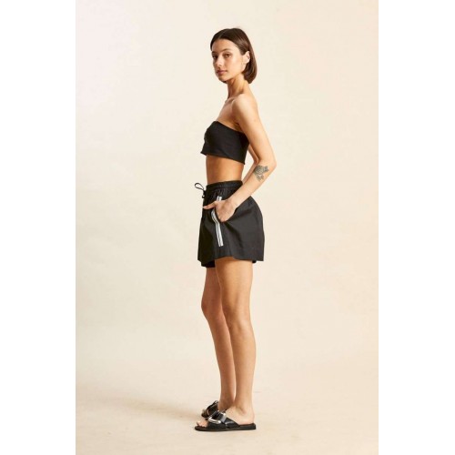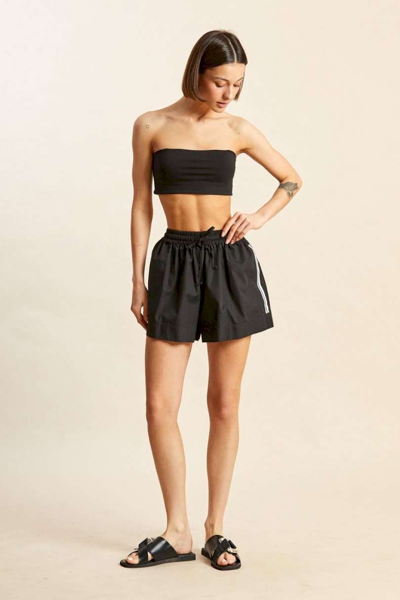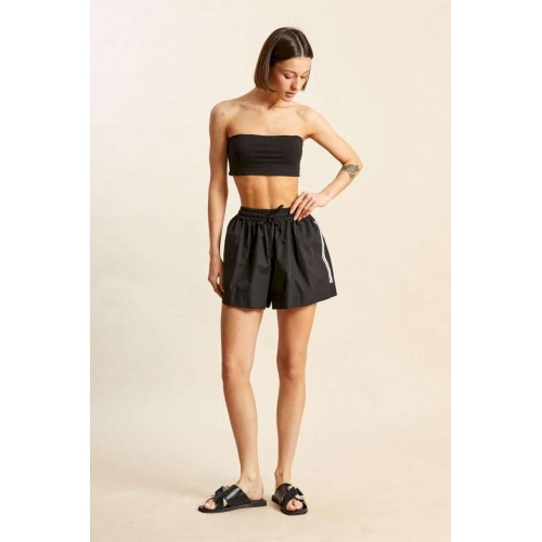 Шорты: - прямой силуэт; - карманы в боковых швах; - пояс на резинке с завязкой; - широкая подгибка по низу; - по бокам лампас.