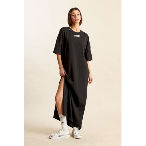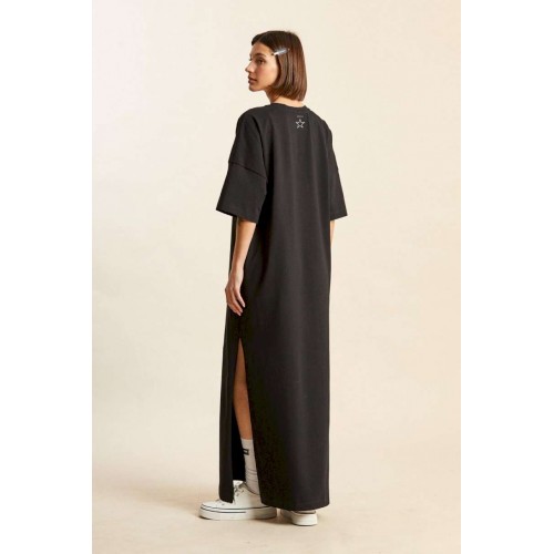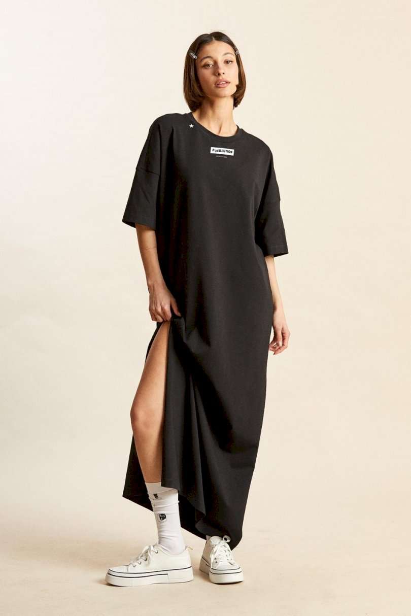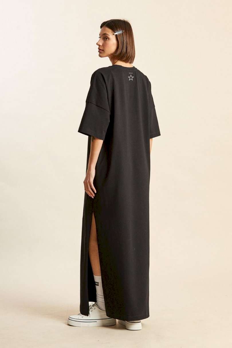 Платье-майка: - свободный силуэт; - длина макси; - спущенная линия плеча; - рукава средней длины; - вырез горловины круглый, обработан планкой; - по бокам высокие разрезы; - спереди, на спинке и на рукавах печати.