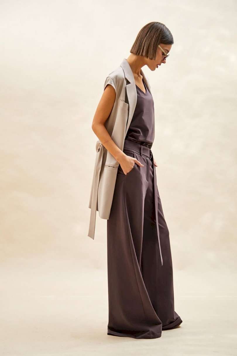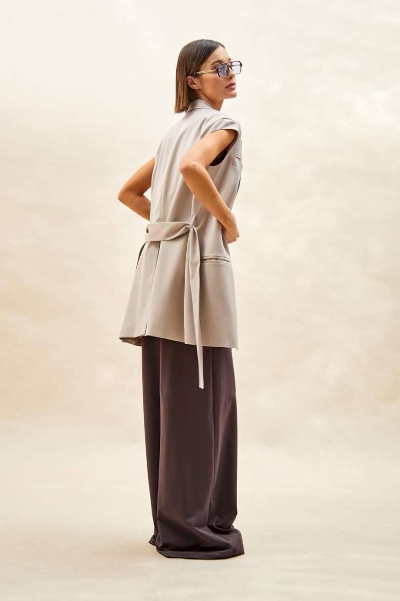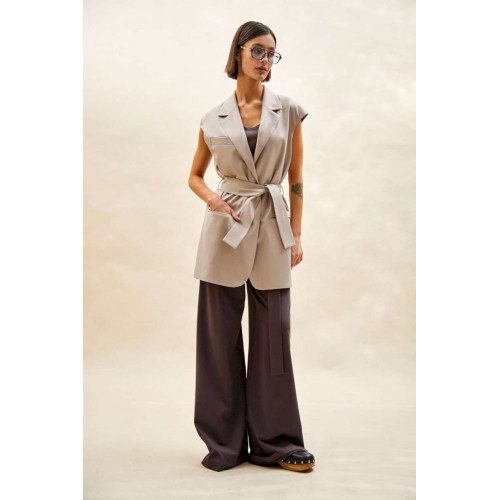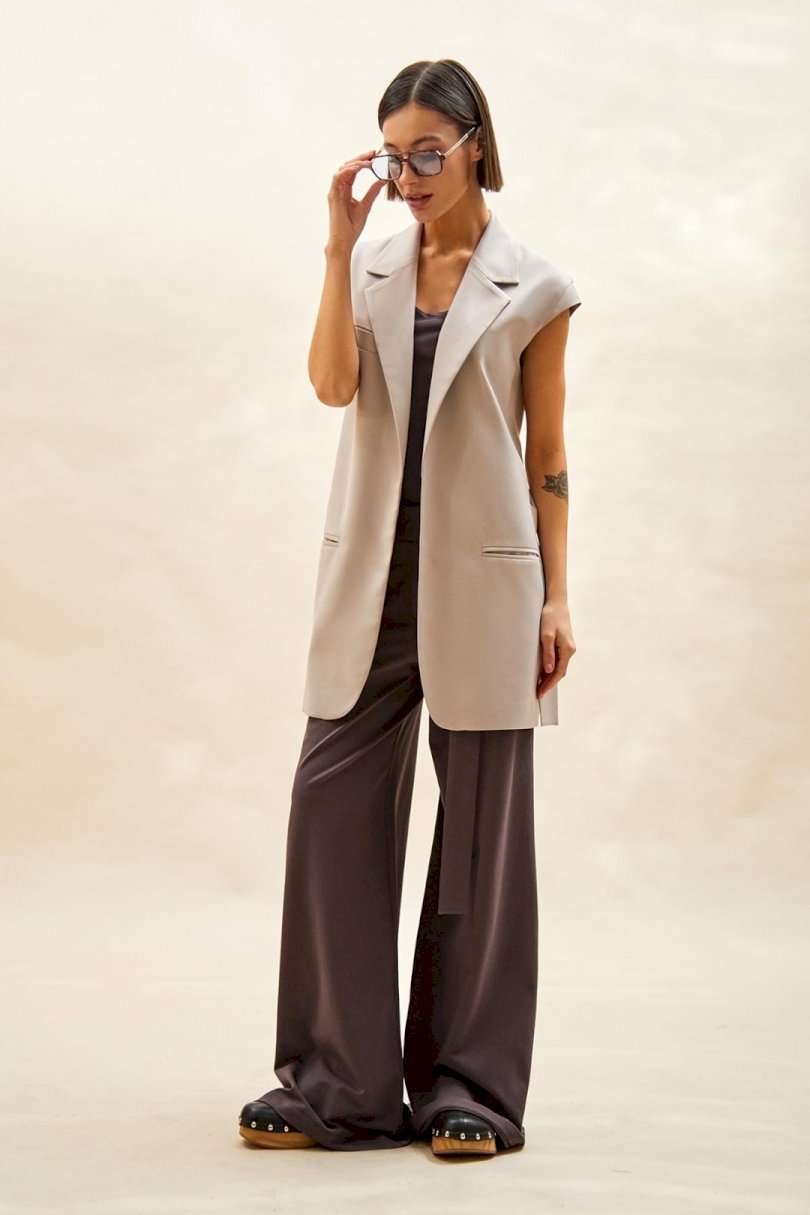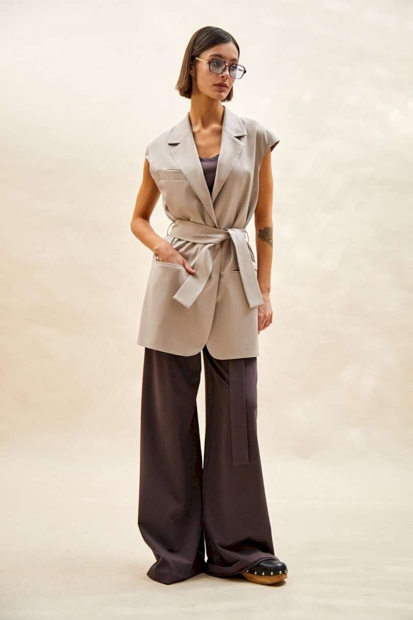 Жилет: - прямой силуэт; - удлиненный; - на подкладке; - воротник пиджачного типа; - спереди прорезные карманы с обтачками и один сверху с листочкой; - проймы сверху дополнены небольшим рукавом-крылышком; - на спинке средний шов со шлицей; - съемный пояс из основной ткани с пряжкой- прямоугольными рамками.