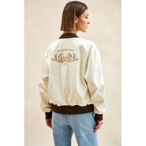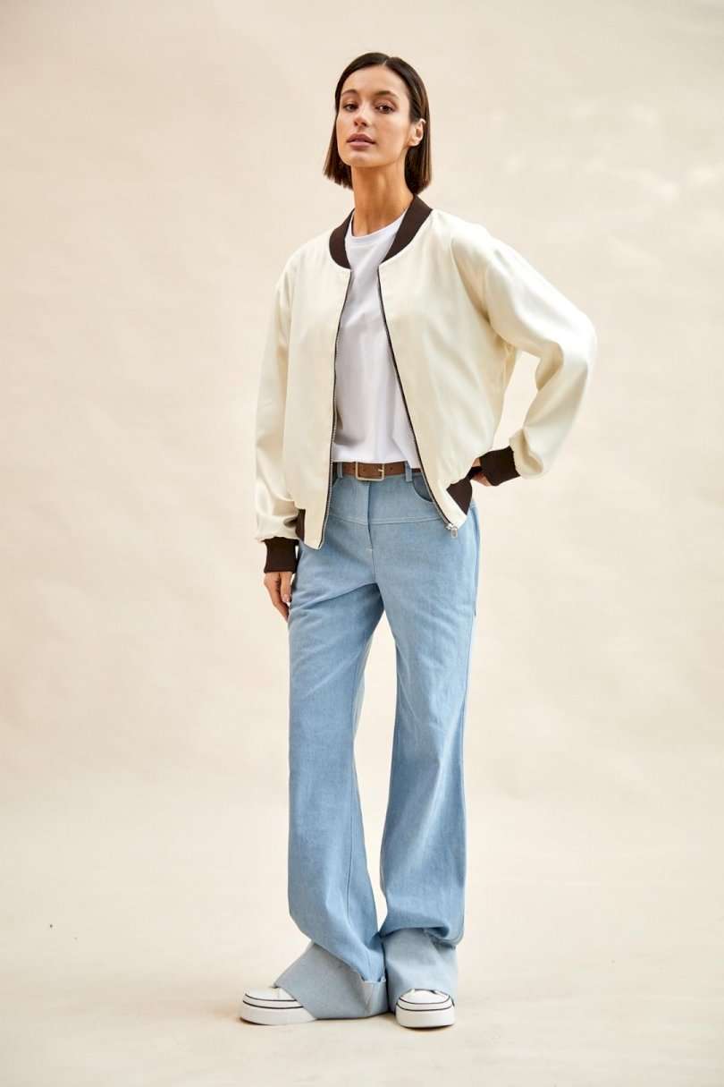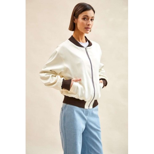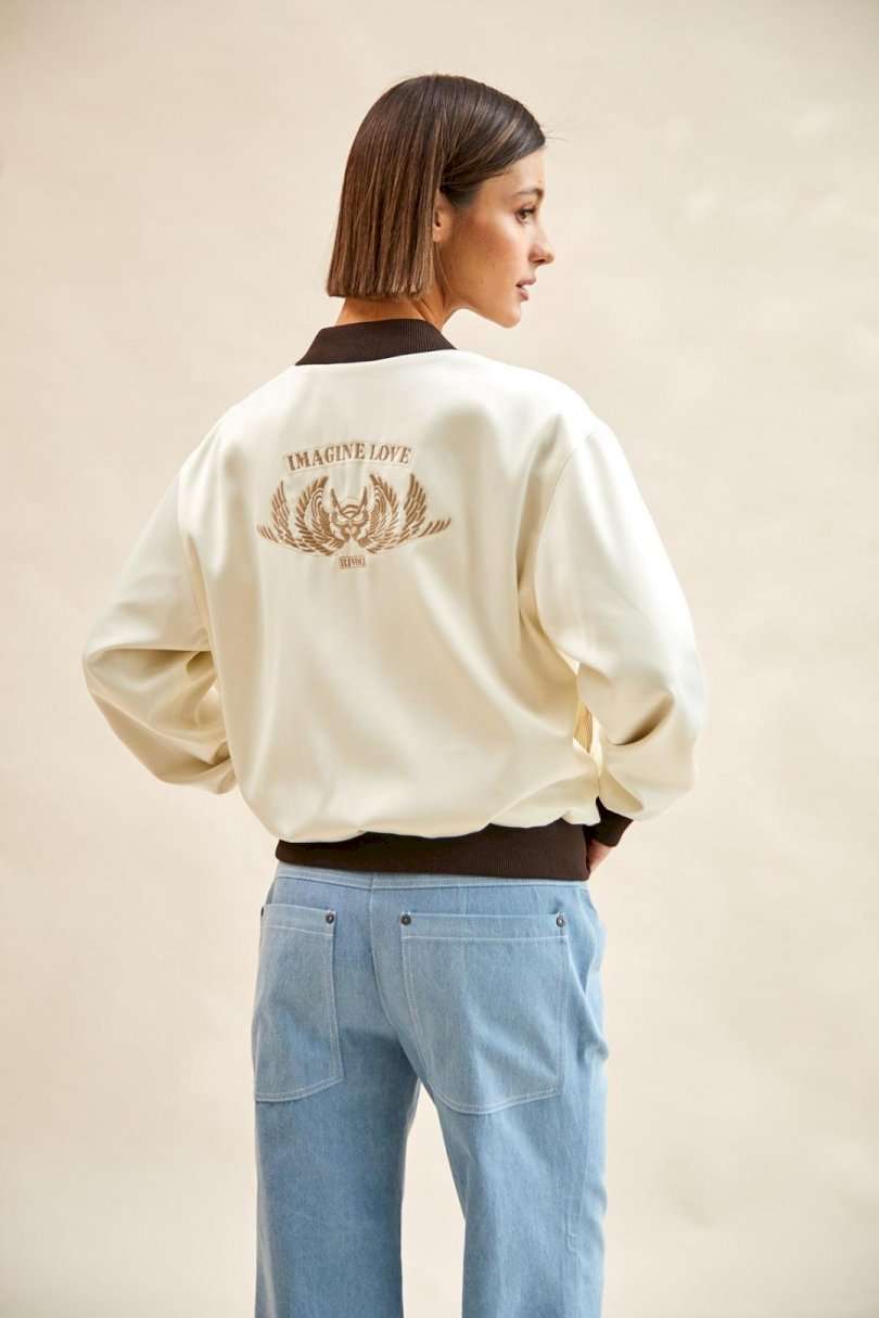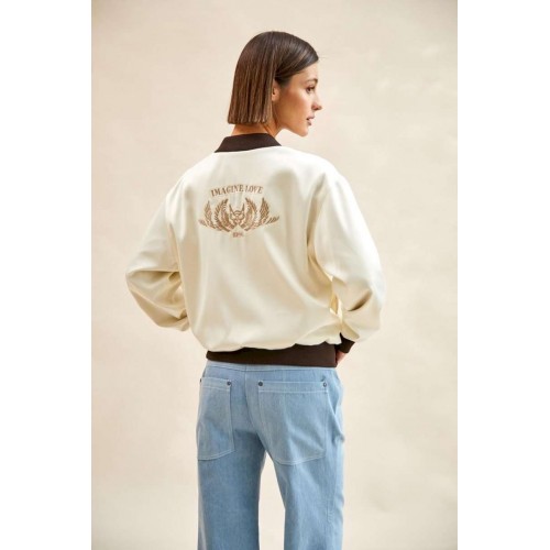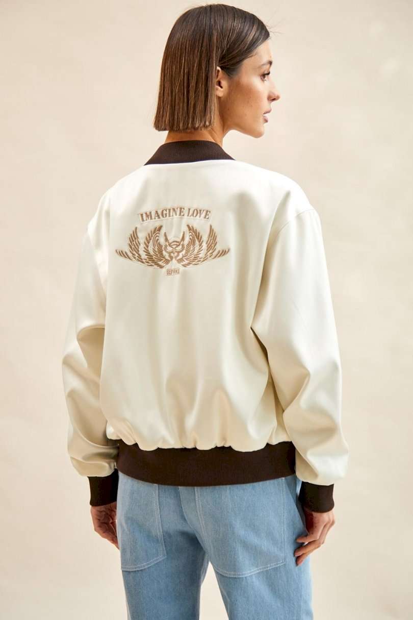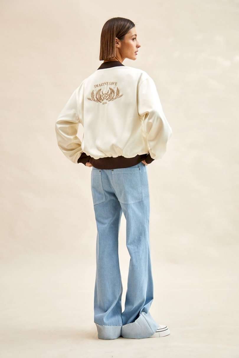 Бомбер атласный: - О-силуэт; - на подкладке; - спущенная линия плеча; - на спинке вышивка; - спереди карманы с листочкой; - застежка на металлическую молнию; - воротник-стойка со скругленными концами; - низ изделия и рукавов - манжеты из трикотажа в рубчик (кашкорсе).