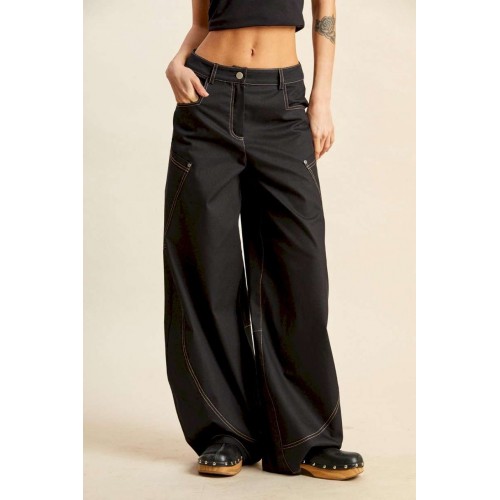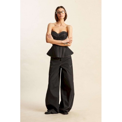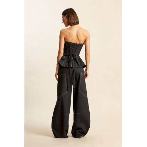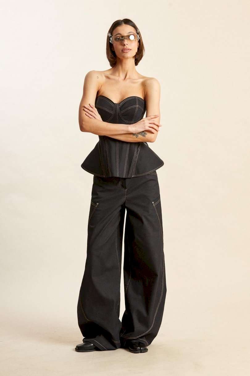 Комплект женский Корсет: - по талии прилегающий, к низу расширен; - сзади и спереди по два рельефных шва с каждой стороны, а также боковые и средний шов переда усилены корсетными косточками; - чашки отрезные, составные из 4 частей; - застёжка в среднем шве спинки на разъёмную металлическую молнию; - по бокам внизу баска фигурной формы; - в центральных рельефах спинки по 6 навесных петель, через которые проходит завязка для шнуровки / дополнительной утяжки; - все швы с декоративной двойной отстрочкой. Брюки из тонкого джинса: - О- силуэт; - пояс притачной со шлёвками и застёжкой на кнопку; - спереди застёжка на молнию; - в боковых швах спереди карманы угольной формы; - спереди рельефные швы округлой формы; - сзади кокетка и большие накладные карманы, заходящие на перед; - на участке под коленями горизонтальные вытачки; - все отделочные швы с одинарной и двойной отстрочкой.