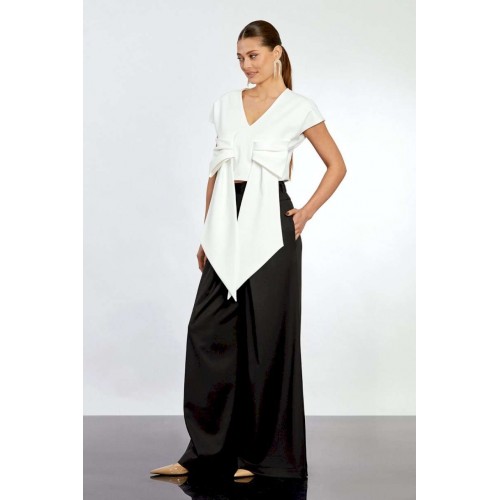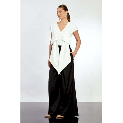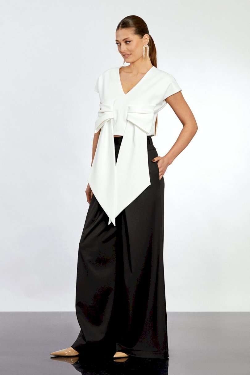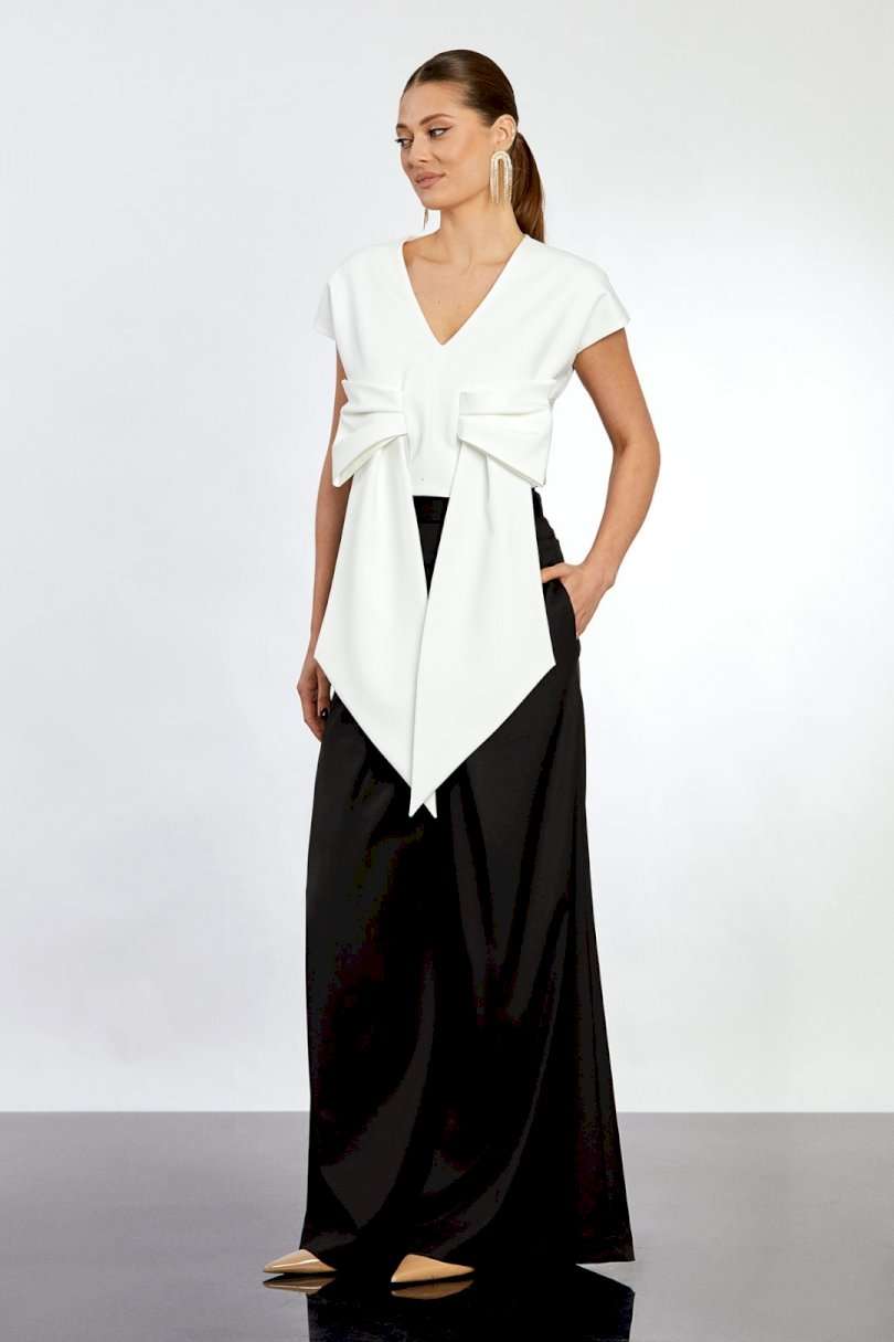 Топ: - прилегающего силуэта - спущенная линия плеча - спереди в фигурные подрезы вставлен бант - сзади в среднем шве застёжка на металлическую молнию - на подкладке