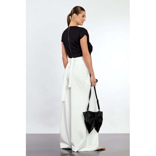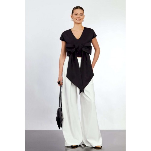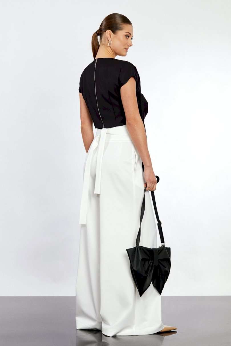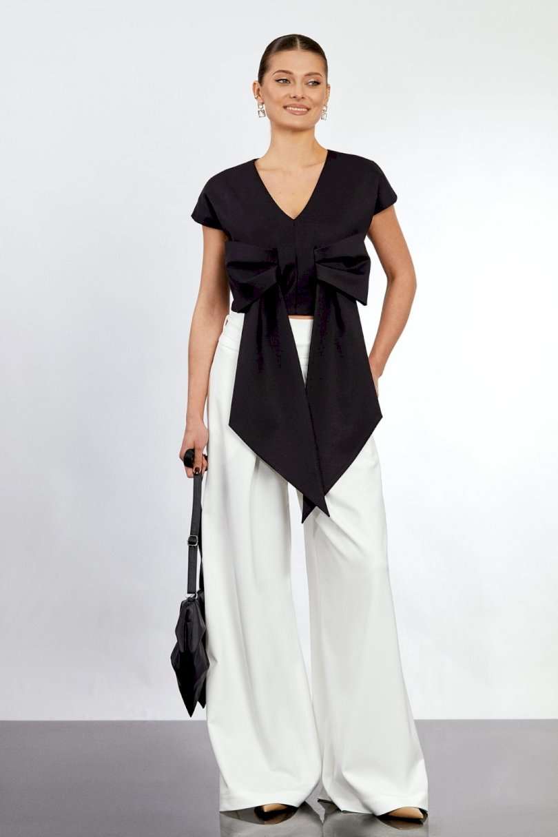 Топ: - прилегающего силуэта - спущенная линия плеча - спереди в фигурные подрезы вставлен бант - сзади в среднем шве застёжка на металлическую молнию - на подкладке