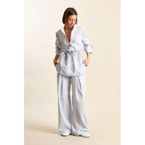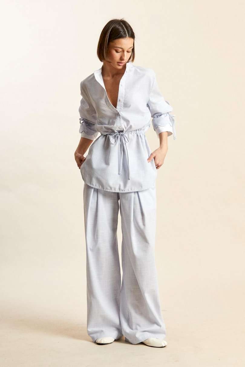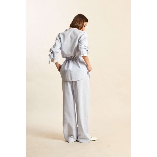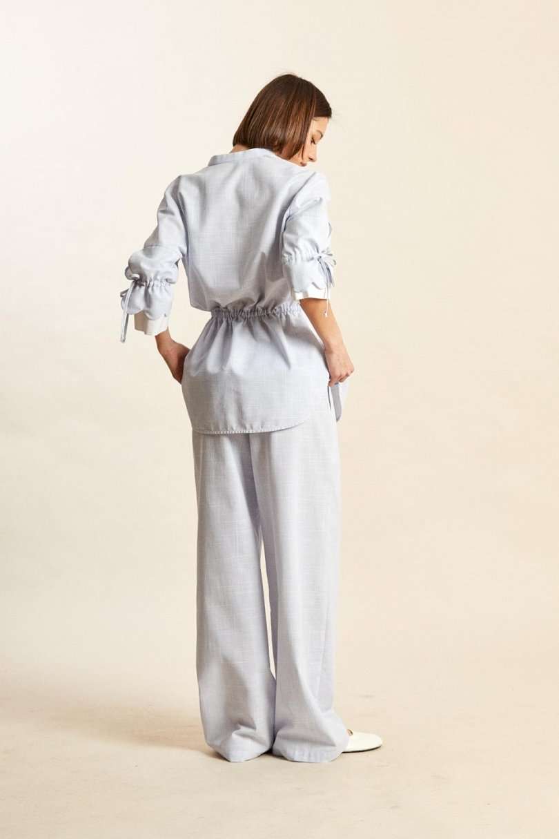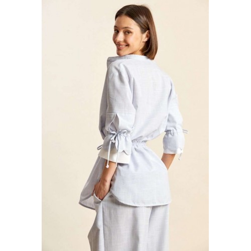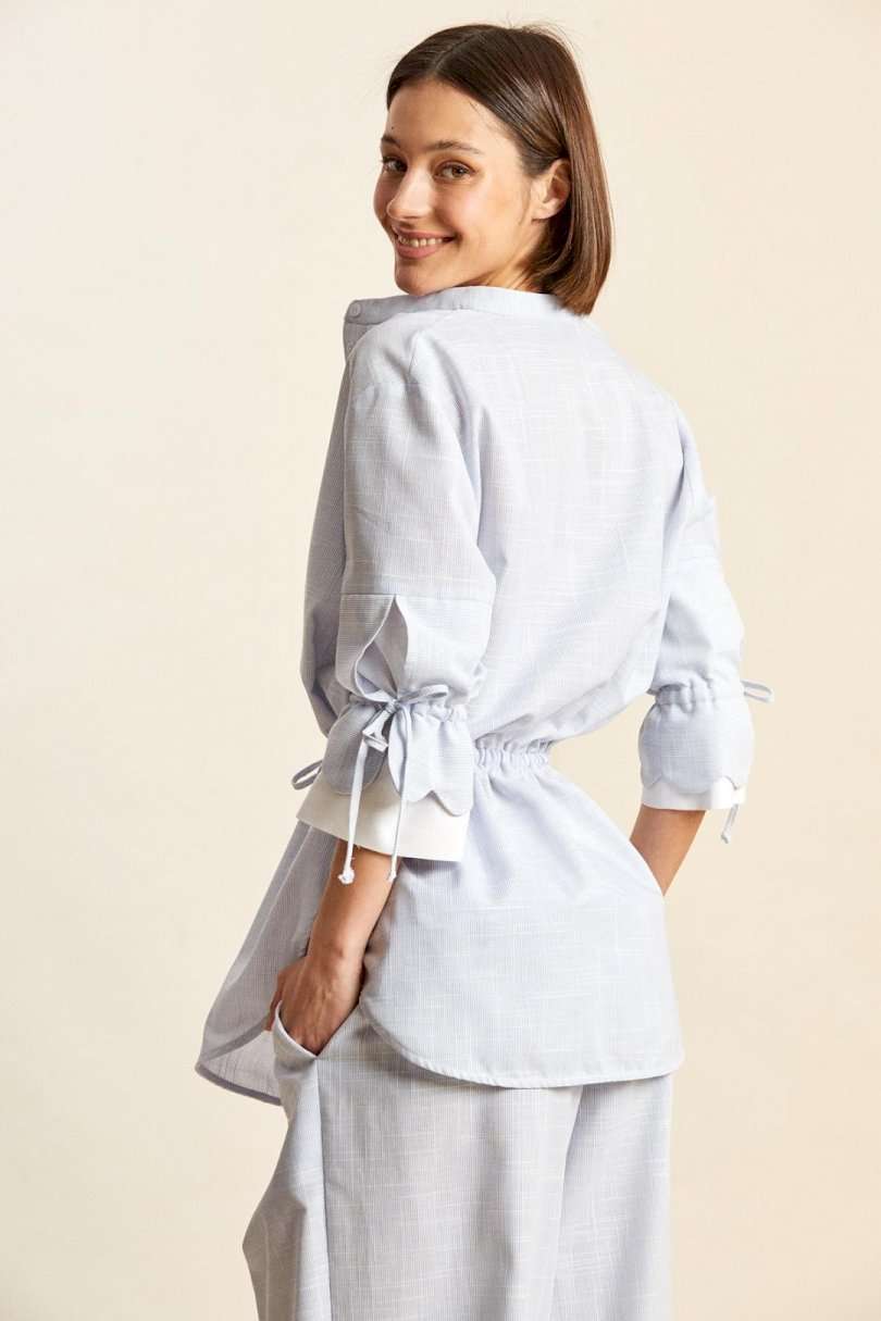 Блуза: - силуэт прямой; - застёжка спереди до талии на планку с пуговицами; - по талии отрезная с кулиской и завязками, линия низа фигурная; - воторник-стойка; - рукава втачные, укороченные, горизонтально отрезные, нижние части двойные; - внутренние выполнены в виде манжет из отделочной ткани, наружные с разрезами, фигурными линиями низа и кулисками с завязками.