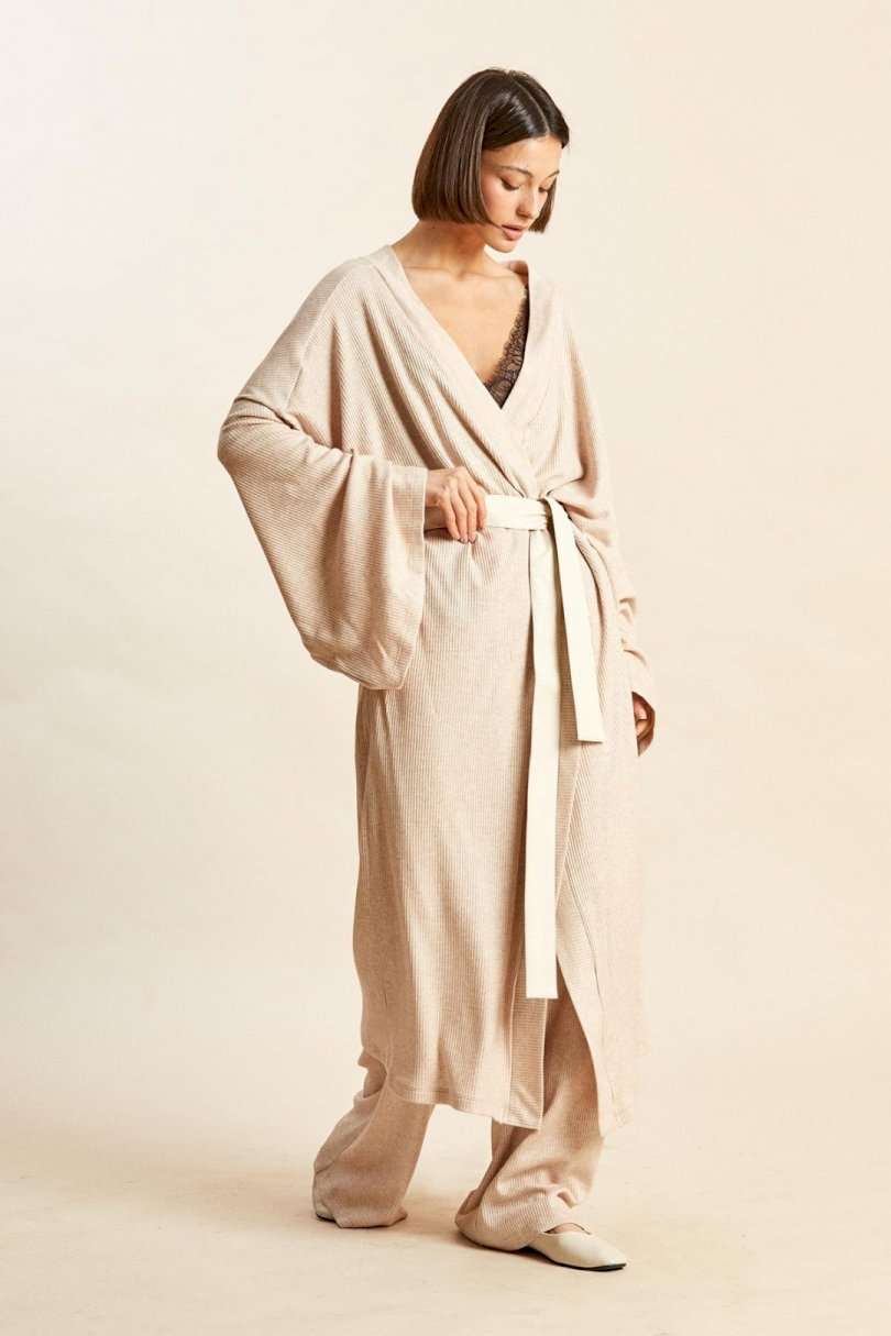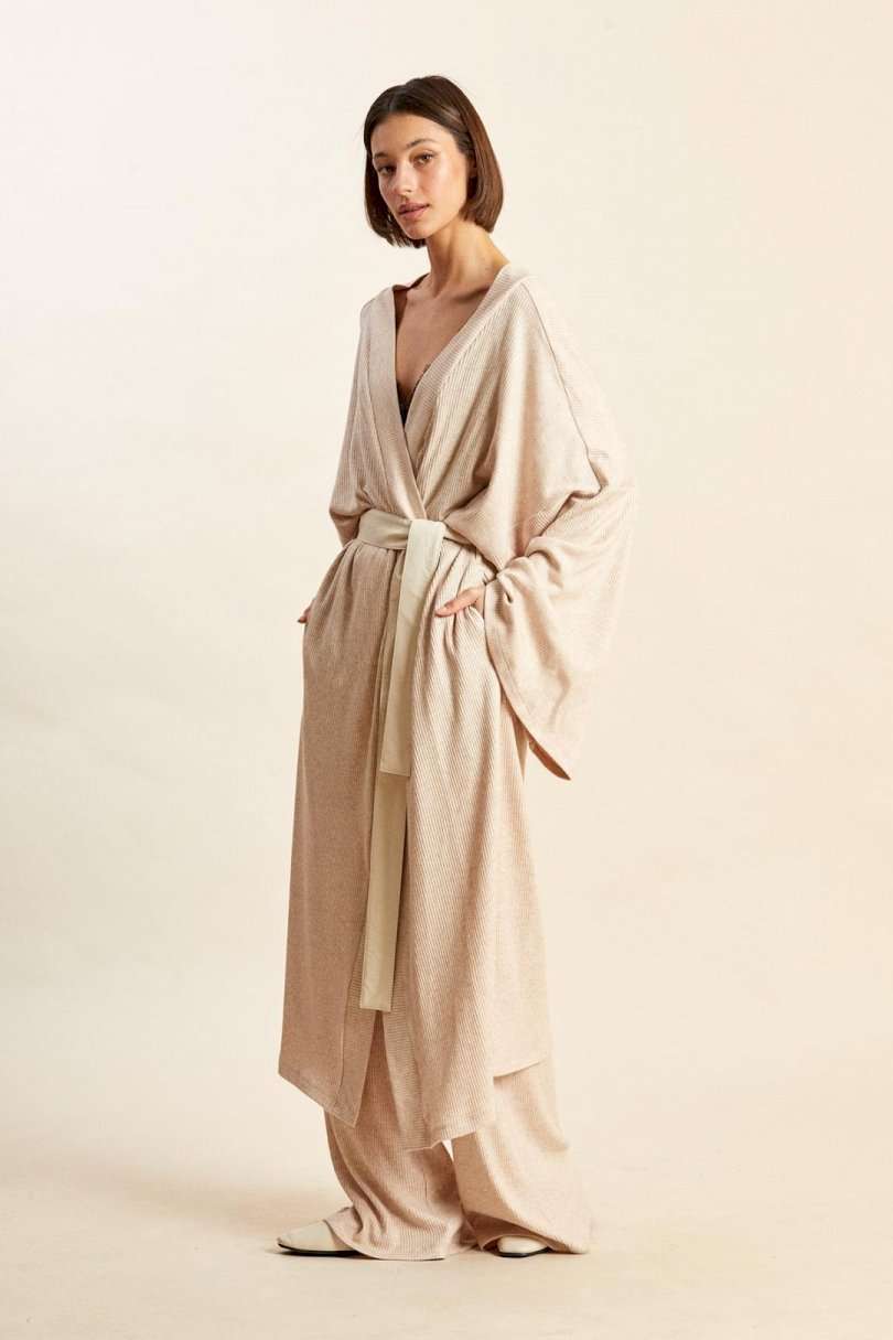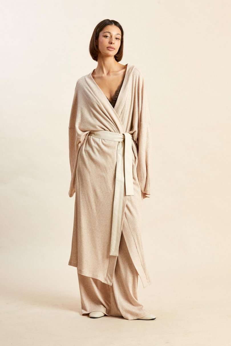 Кардиган: - свободный силуэт; - спущенная линия плеча; - рукава широкие прямые; - в боковых швах карманы и шлевки для съемного пояса; - борта и горловина обработаны притачными планками; - пояс входит в комплект.