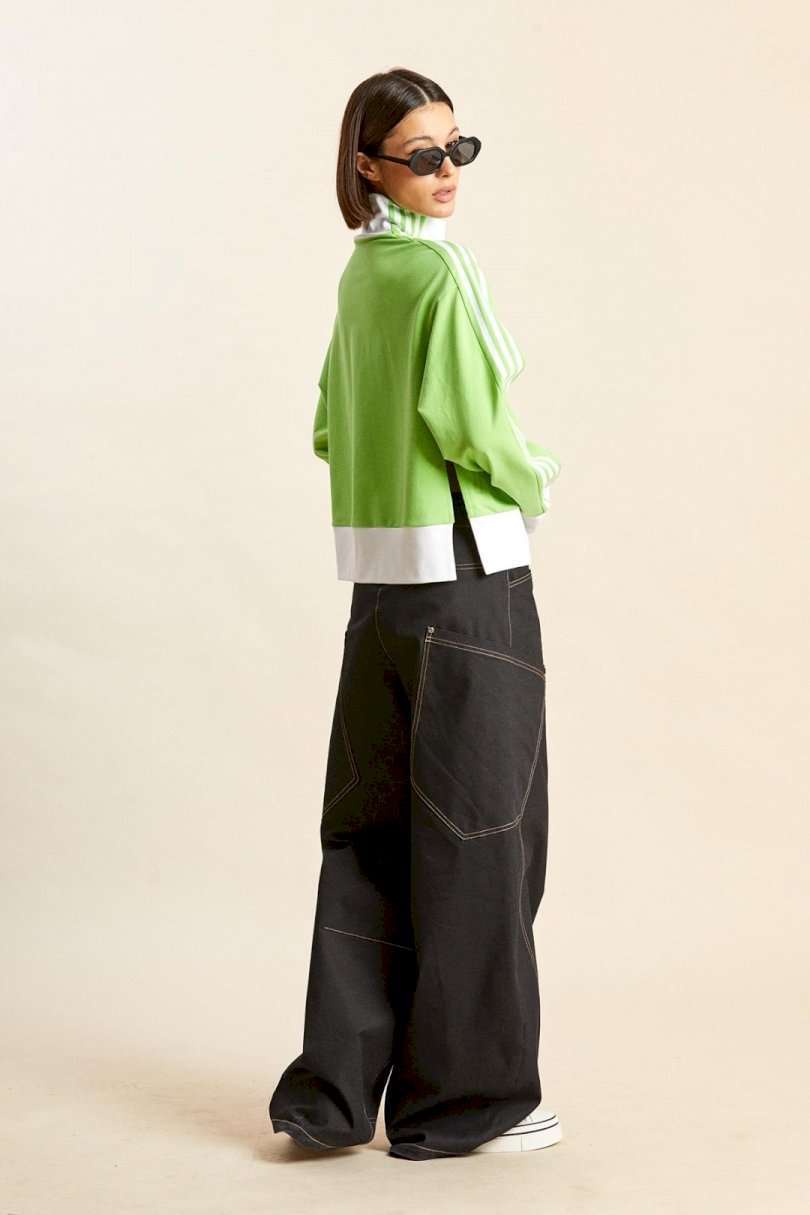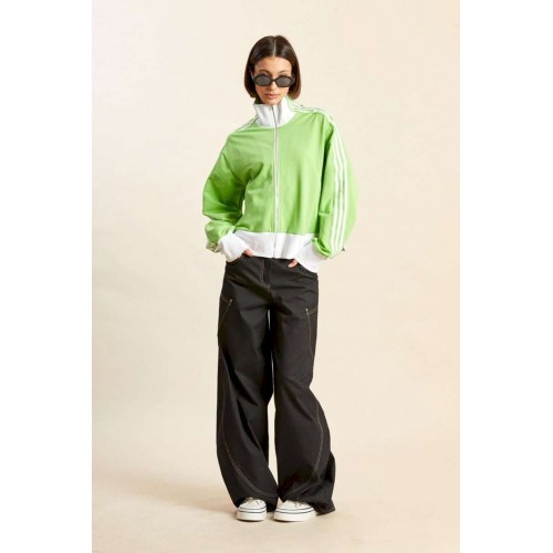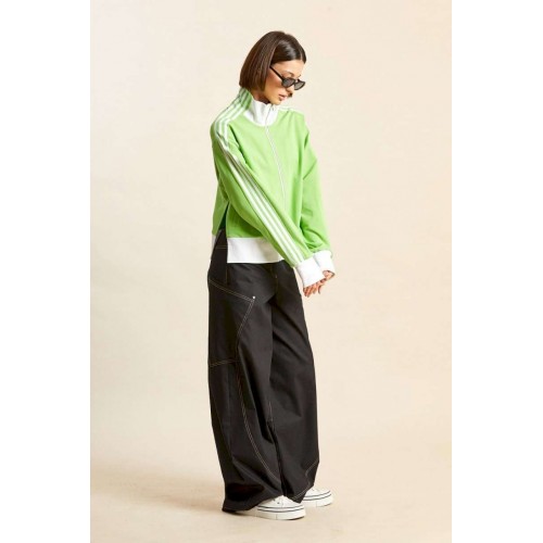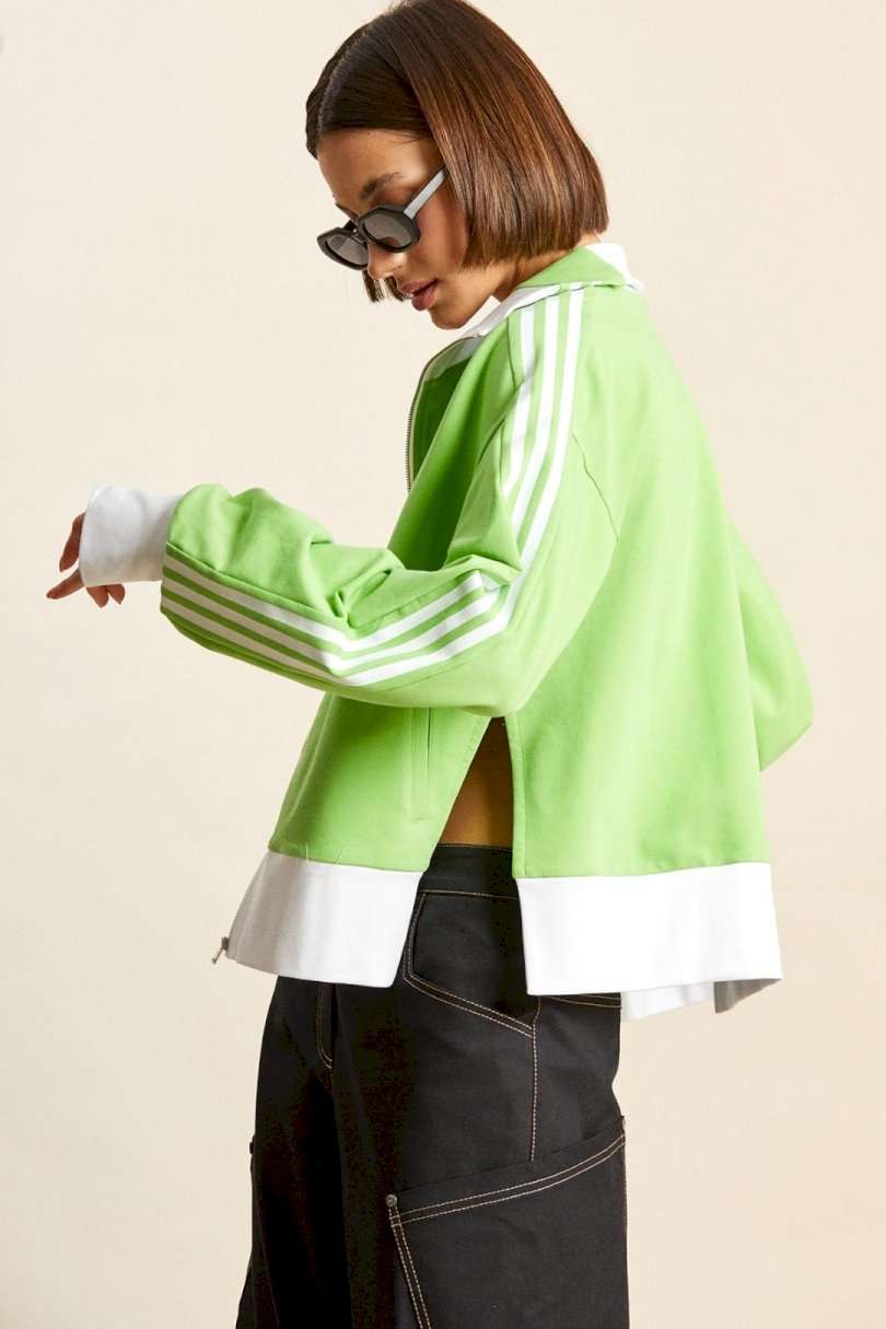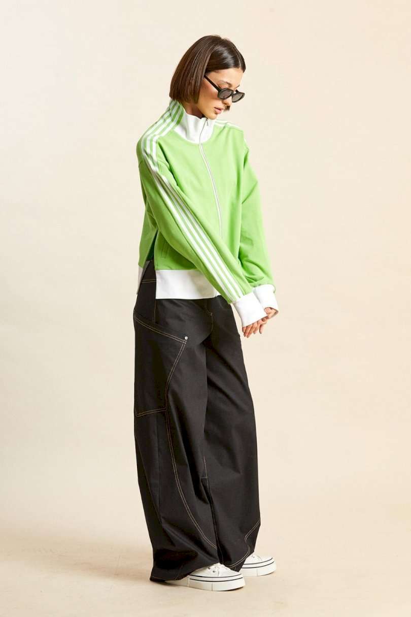 Джемпер: - ткань – футер двухнитка; - прямой силуэт; - линия плеча спущенная; - застёжка спереди на молнию; - спереди прорезные карманы с тонкими листочками; - по бокам высокие разрезы; - манжеты рукавов, низа, а также воротник сделаны из отделочного материала (рибана); - вдоль рукавов, линии плеча и через воротник проходят широкие лампасы с печатными полосками.