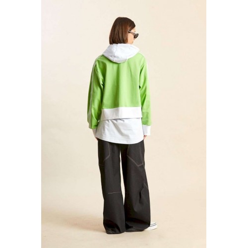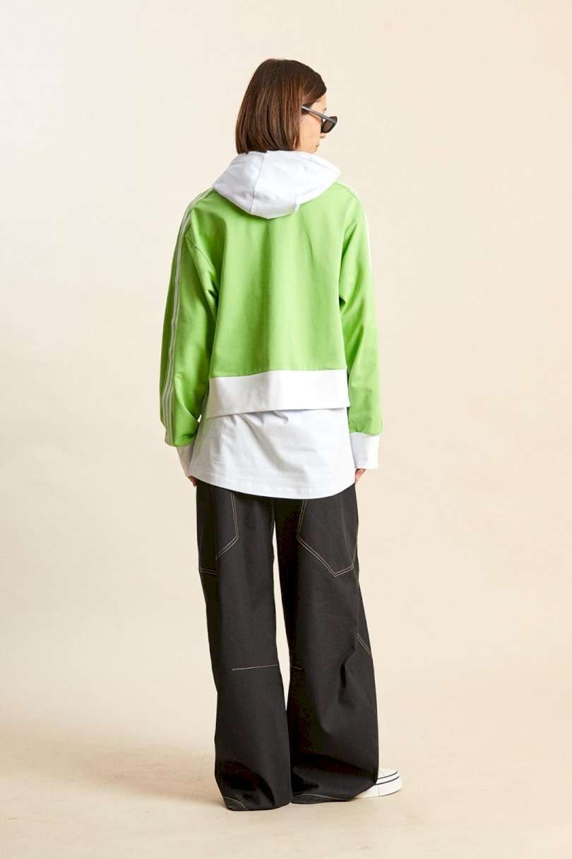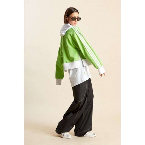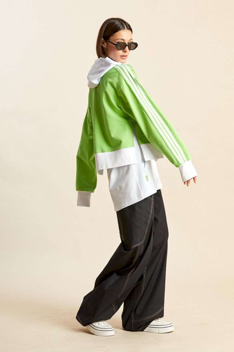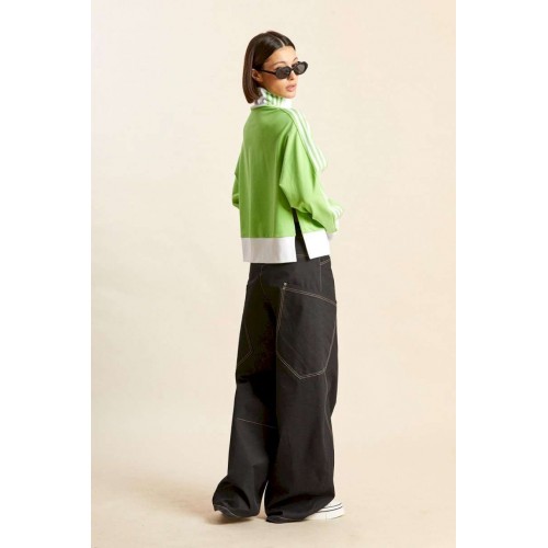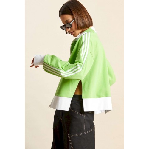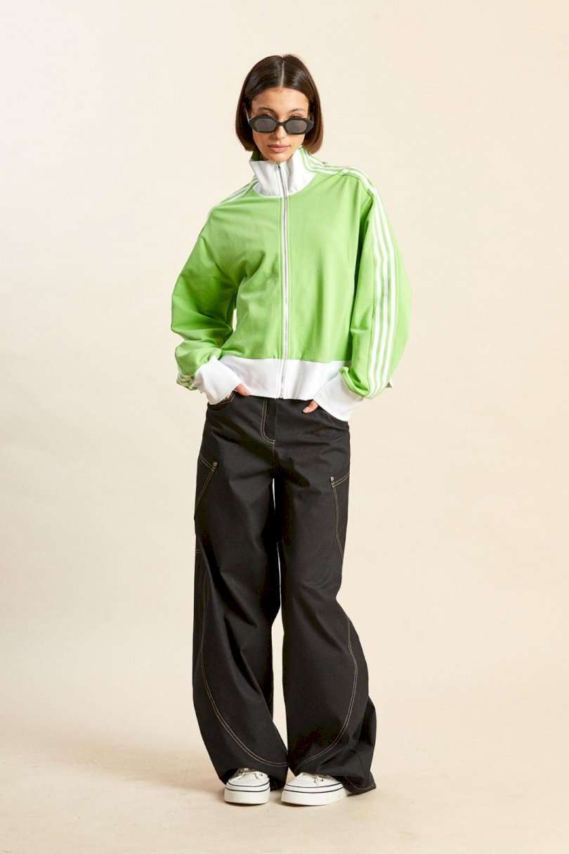 Джемпер: - ткань – футер двухнитка; - прямой силуэт; - линия плеча спущенная; - застёжка спереди на молнию; - спереди прорезные карманы с тонкими листочками; - по бокам высокие разрезы; - манжеты рукавов, низа, а также воротник сделаны из отделочного материала (рибана); - вдоль рукавов, линии плеча и через воротник проходят широкие лампасы с печатными полосками.