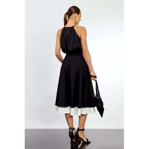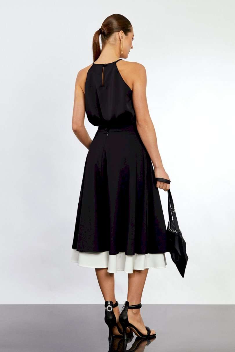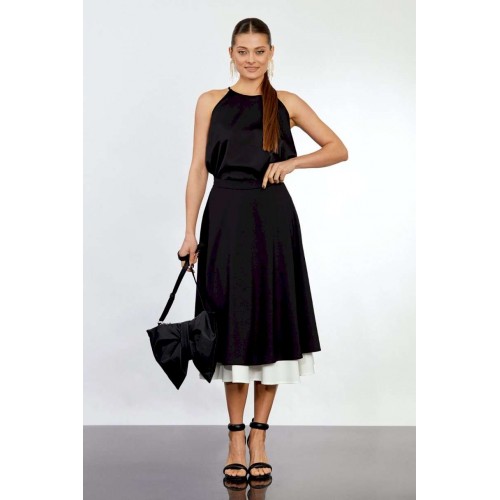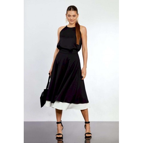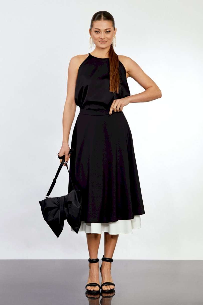 Юбка: - силуэт расширенный - покрой полусолнце - длина миди - верх с поясом - застёжка сзади в среднем шве на потайную молнию и петлю с пуговицей на поясе - на подкладке. Подъюбник: - из подкладночной ткани «гранд» и поливисзовы - силуэт расширенный - длина миди - верх с поясом на резинке