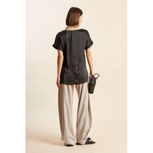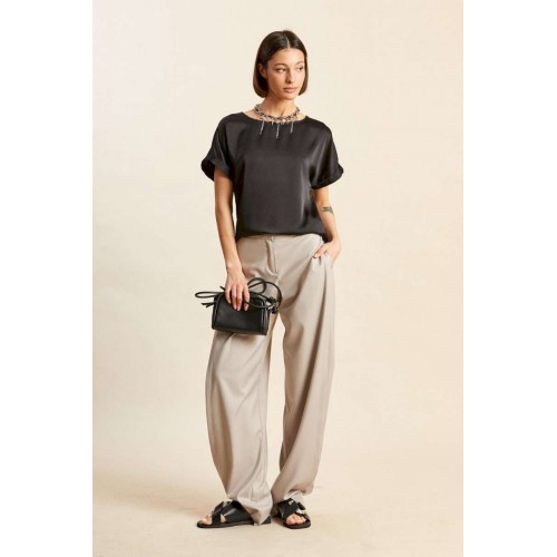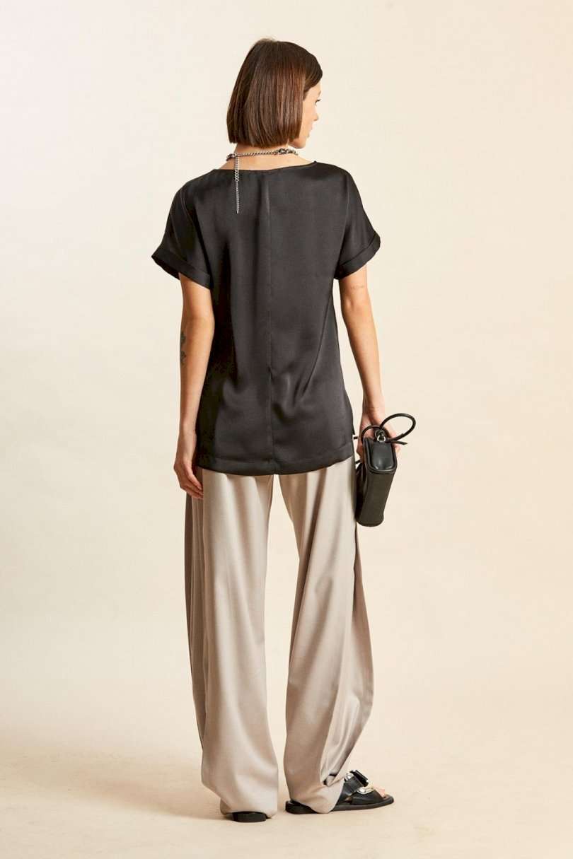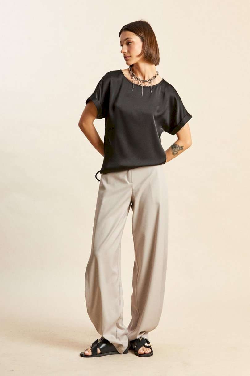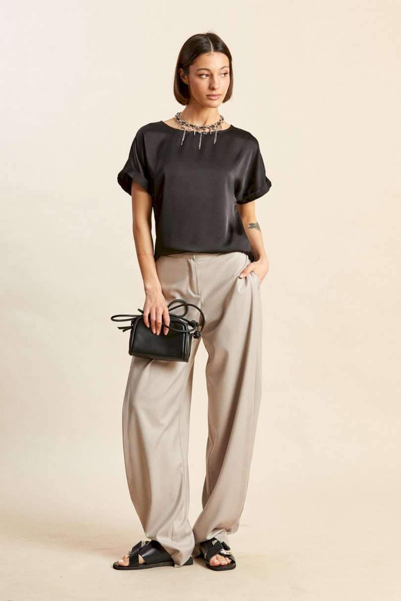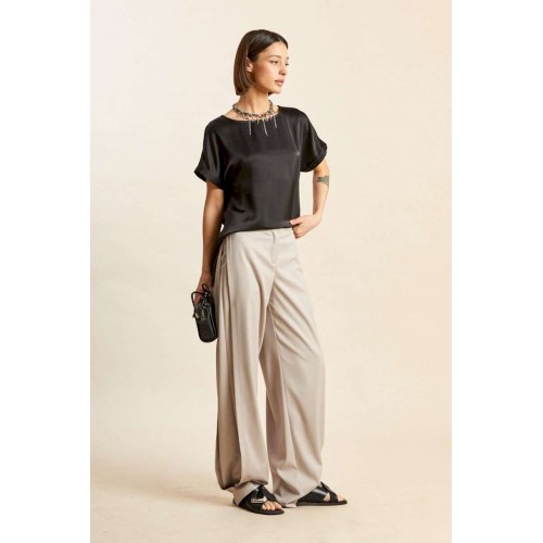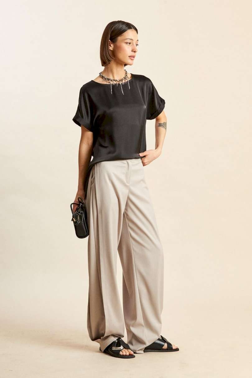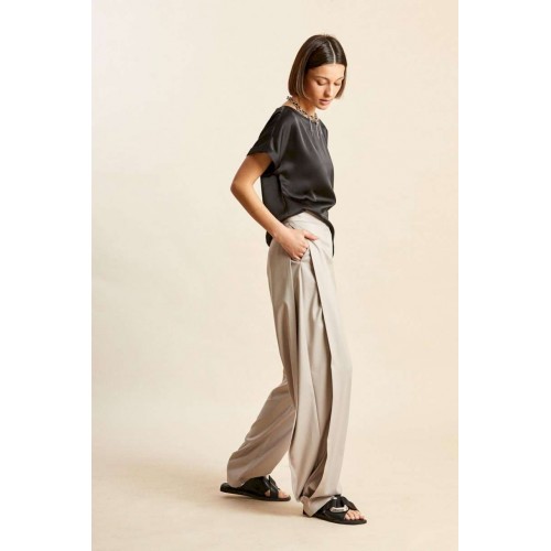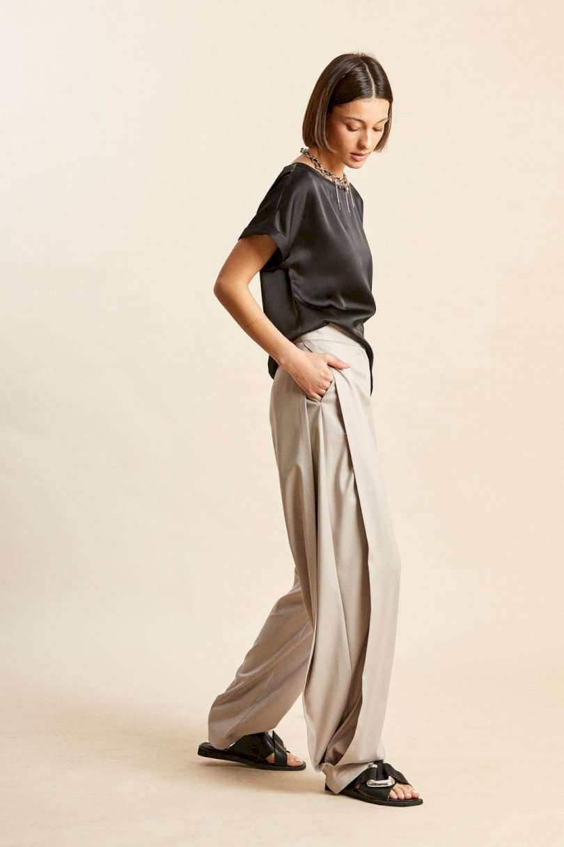 Брюки: - из костюмной ткани; - на прямом притачном поясе без шлёвок с застежкой на пришивную кнопку; - О- силуэт; - сзади вытачки; - спереди застежка на молнию; - в боковых швах карманы; - вдоль боковых швов встречные глубокие складки с отстроченными сгибами, от линии низа вверх скреплены внутренними строчками на 5 см.