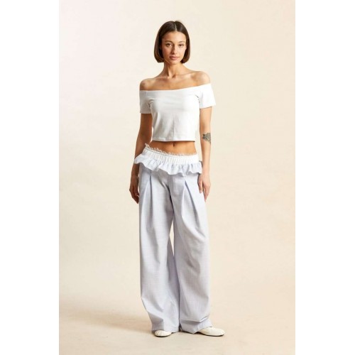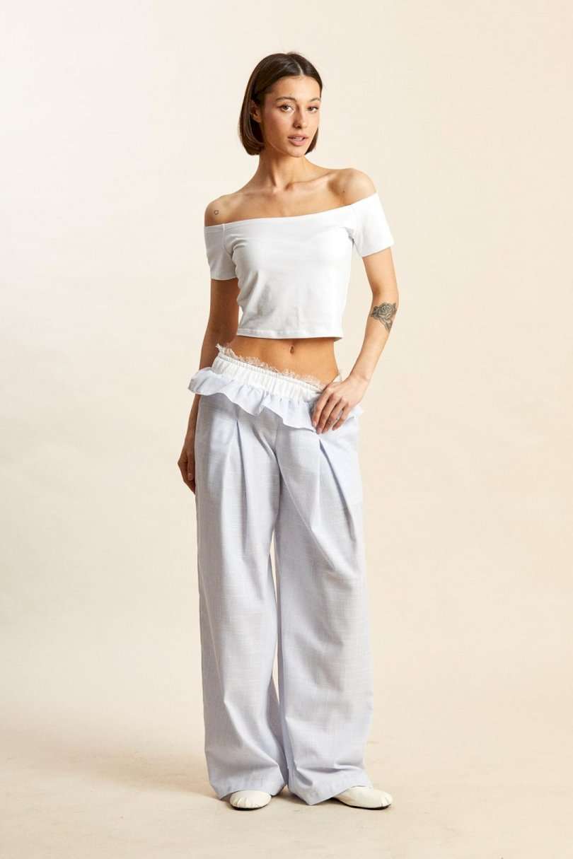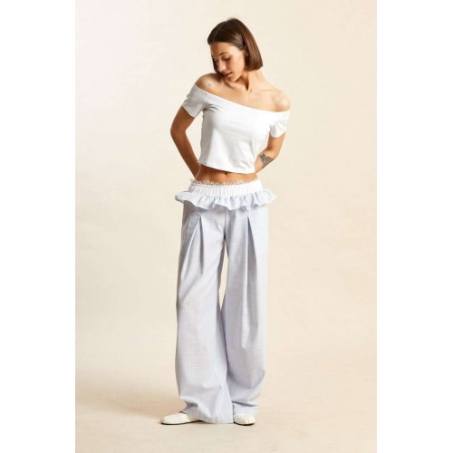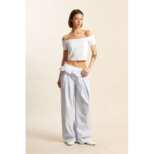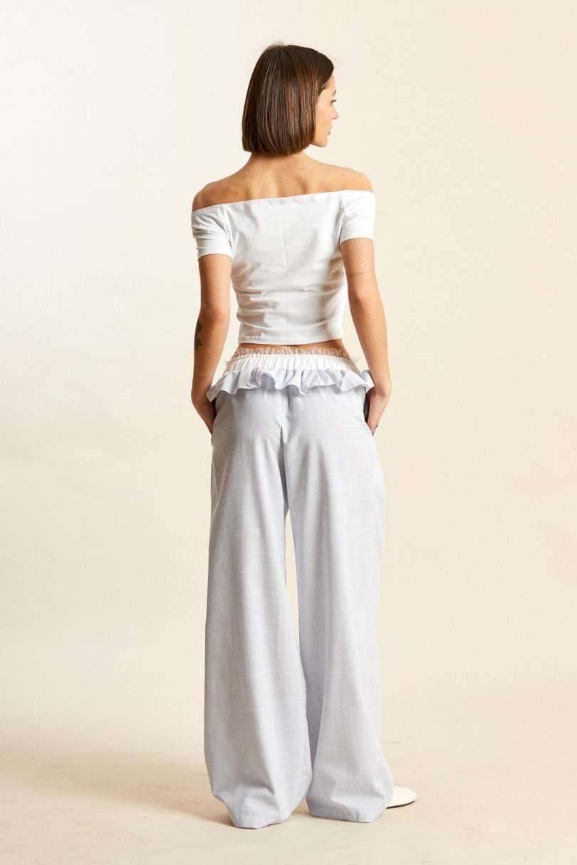 Брюки: - свободный силуэт; - в боковых швах карманы; - спереди от талии по центру встречные складки, скрепленные сверху; - пояс на резинке, из кружева на подкладке из отделочной ткани; - вдоль шва по талии оборка.