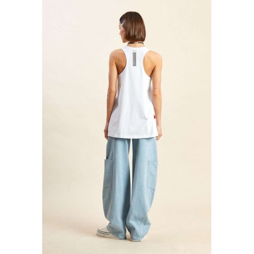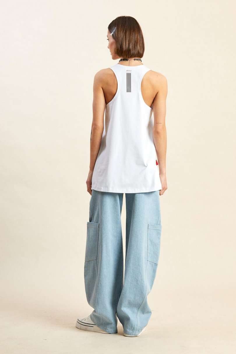 Майка-боксёрка: - силуэт трапеция; - линия плеча укорочена; - спинка по ширине заужена; - горловина круглая, расширена и углублена; - спереди и сзади печати.