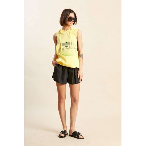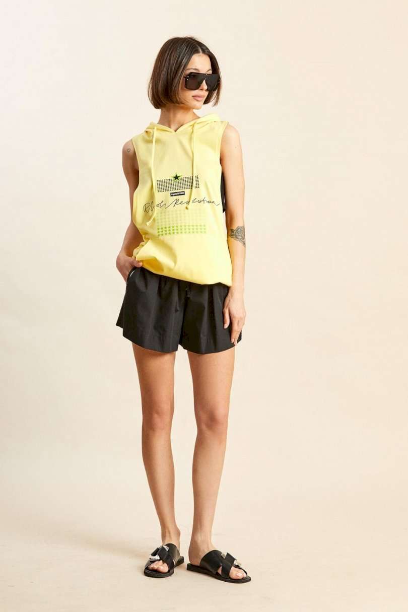 Майка-боксёрка с капюшоном: - силуэт прямой; - линия плеча укорочена; - спинка по ширине заужена; - по горловине трехшовный капюшон с завязками; - спереди внизу накладной карман-кенгуру; - спереди и сзади печати.