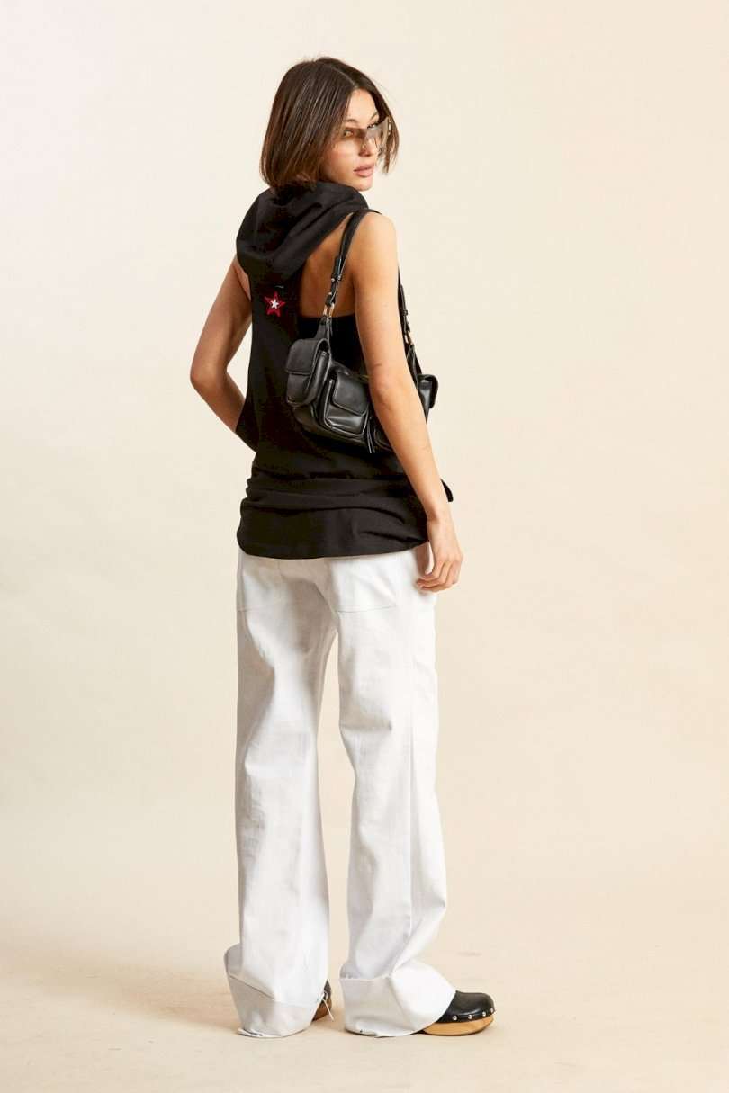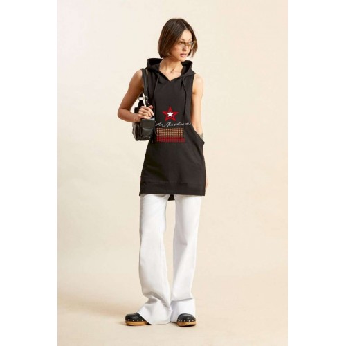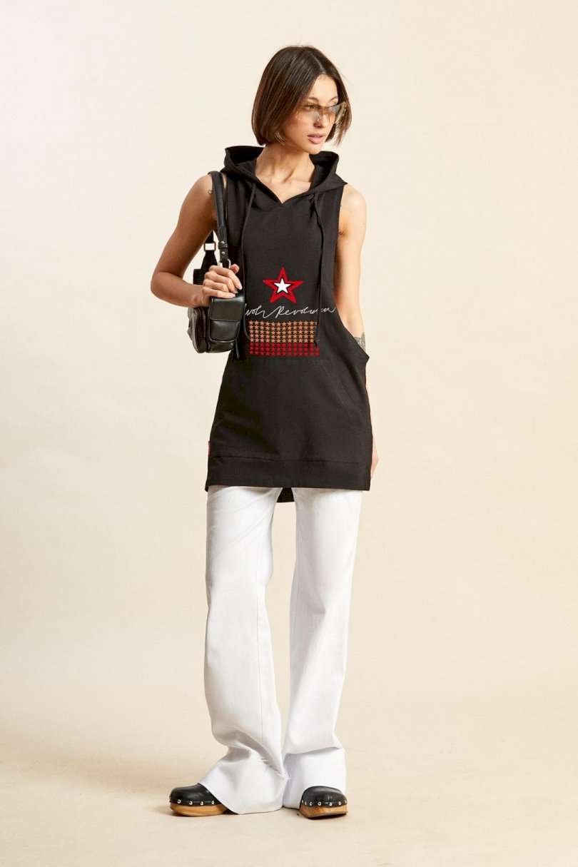 Майка-боксёрка с капюшоном: - силуэт прямой; - линия плеча укорочена; - спинка по ширине заужена; - по горловине трехшовный капюшон с завязками; - спереди внизу накладной карман-кенгуру; - спереди и сзади печати.