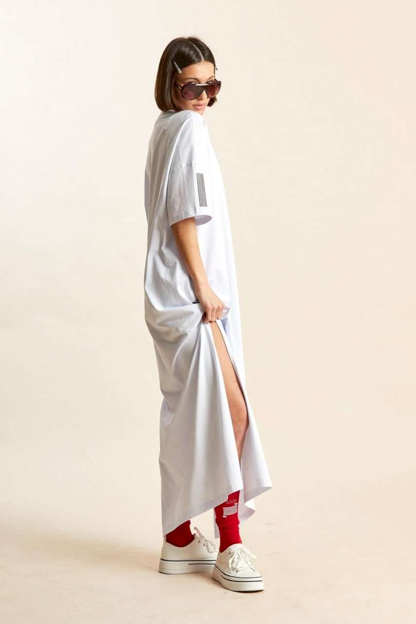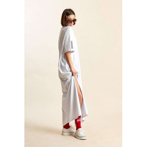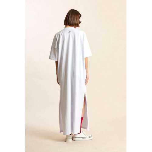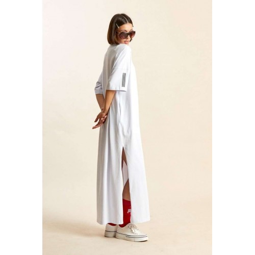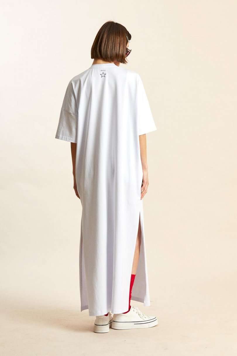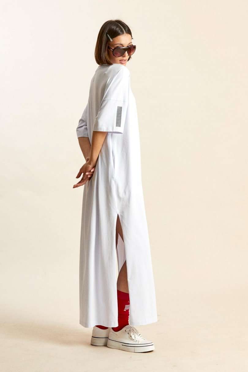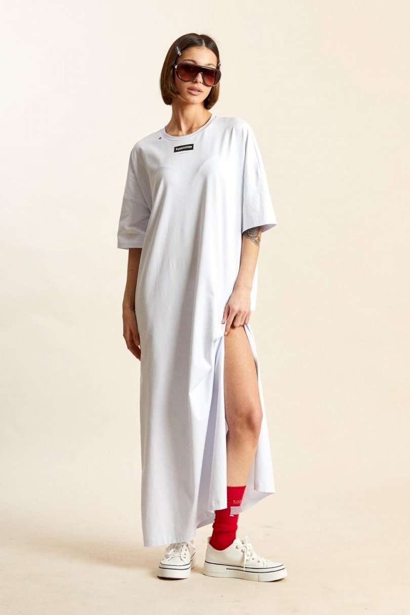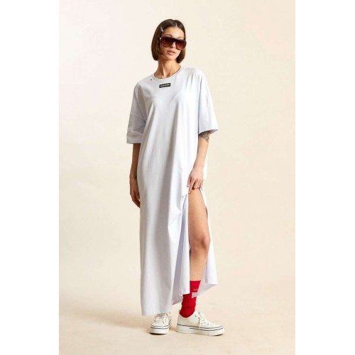Платье-майка: - свободный силуэт; - длина макси; - спущенная линия плеча; - рукава средней длины; - вырез горловины круглый, обработан планкой; - по бокам высокие разрезы; - спереди, на спинке и на рукавах печати.