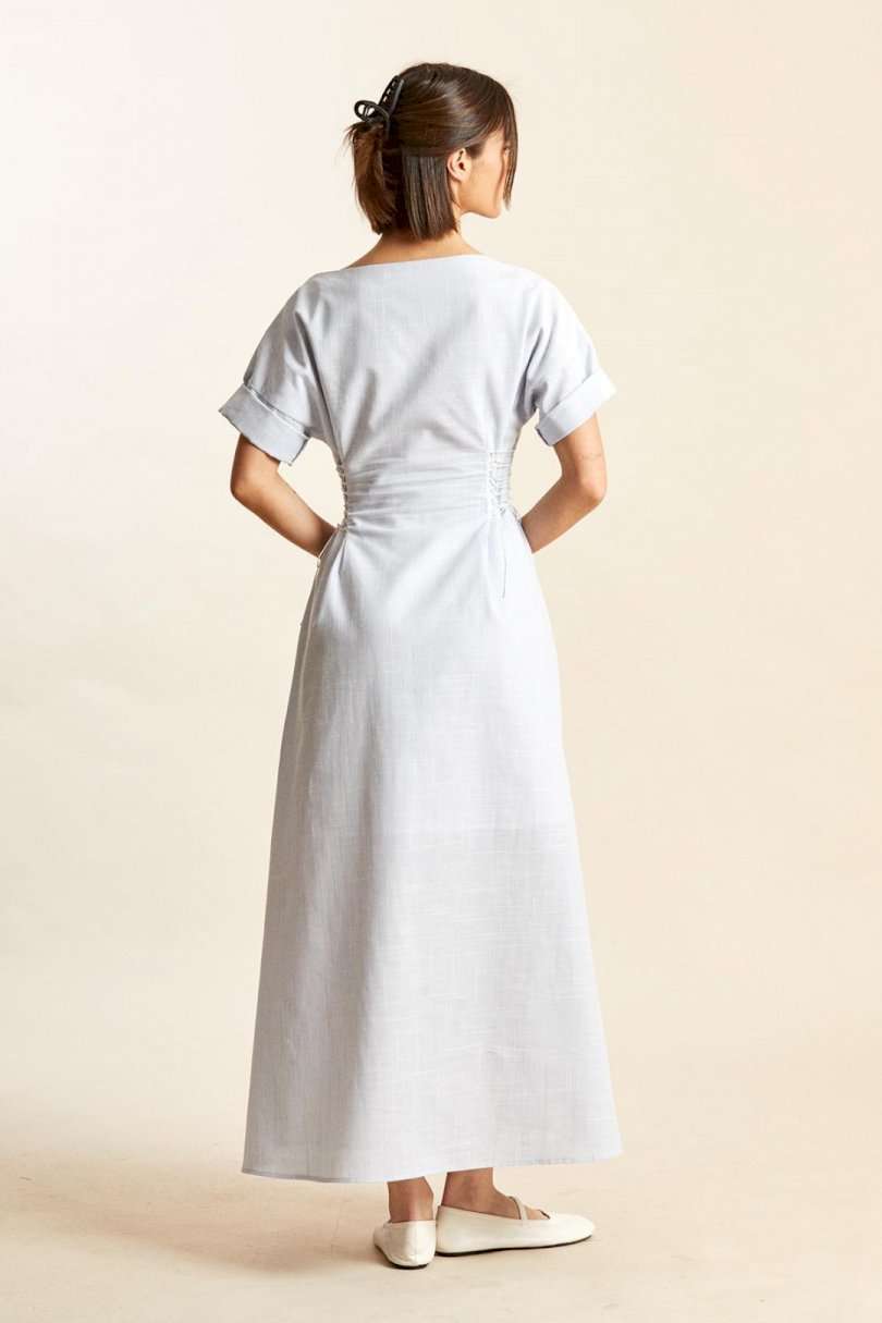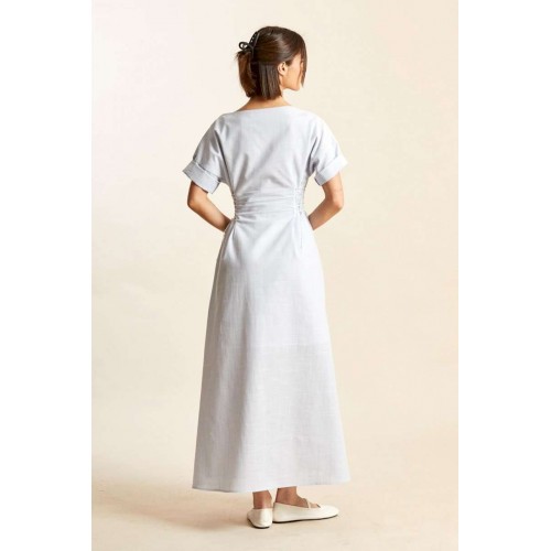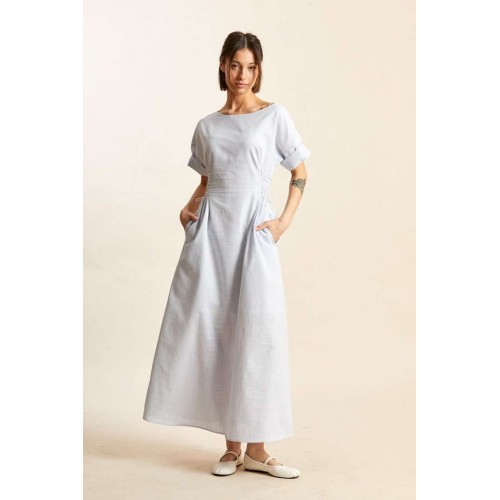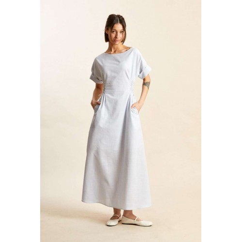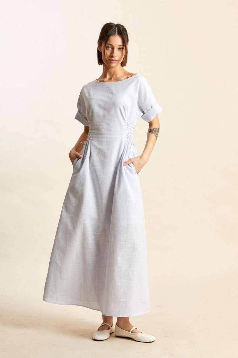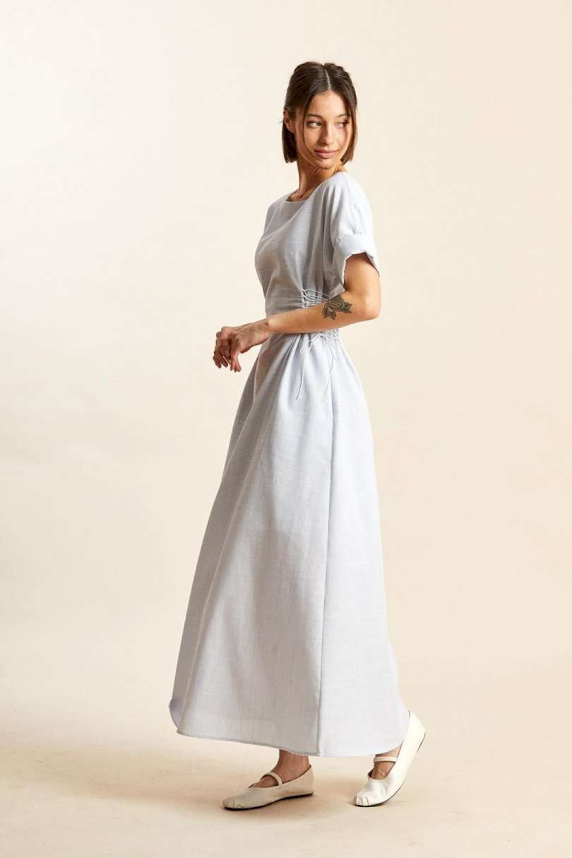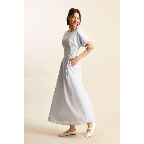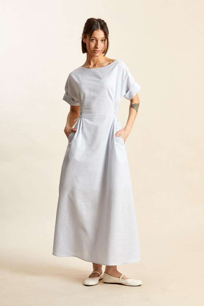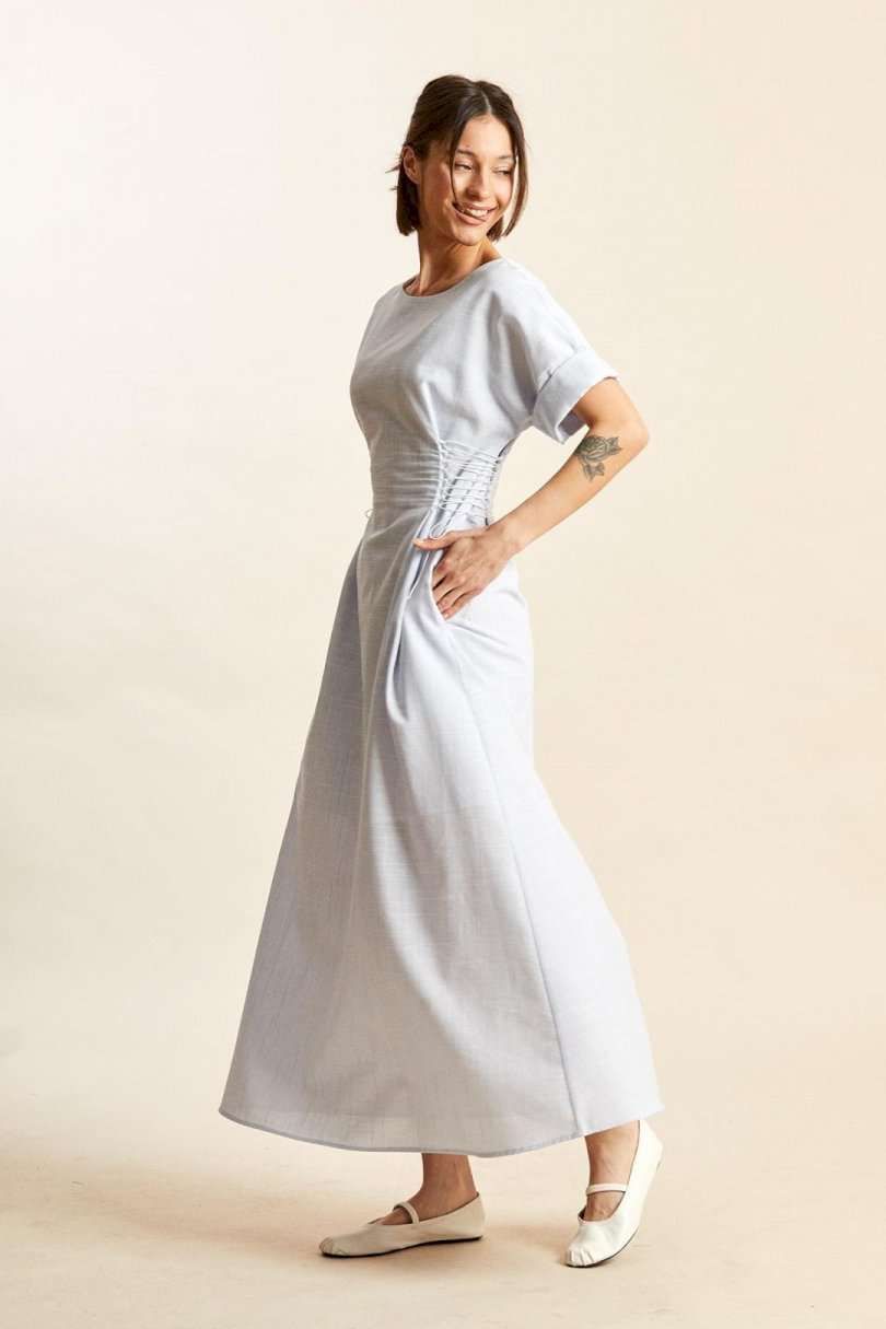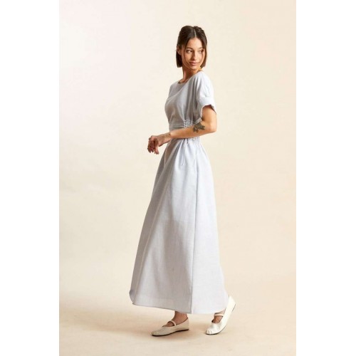 Платье: -х- силуэт; - длина макси; - на х/б подкладке; - широкий вырез горловины, как углубленная лодочка; - линия плеча спущенная; - рукава прямые, короткие; - в боковых швах карманы; - спереди и сзади на талии рельефы, в каждый вставлено по 8 петель, через которые по бокам сделана эластичная шнуровка.