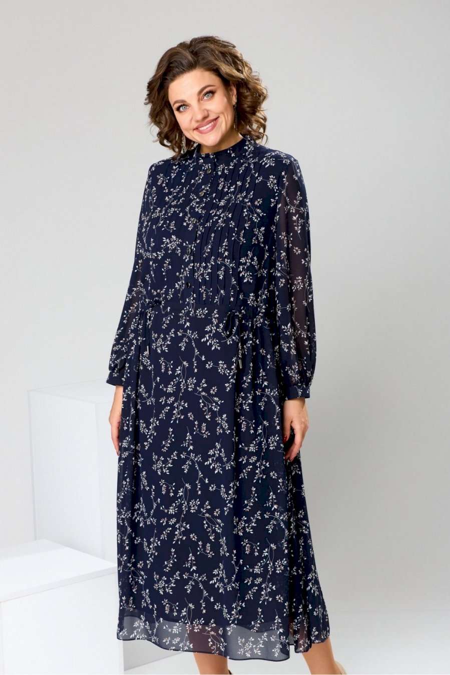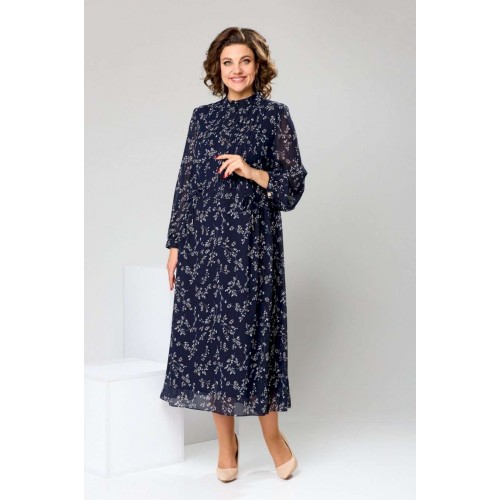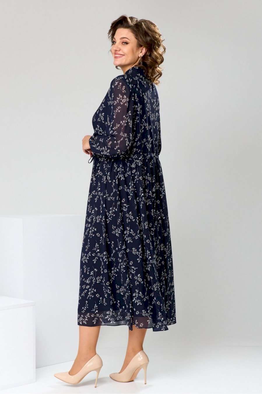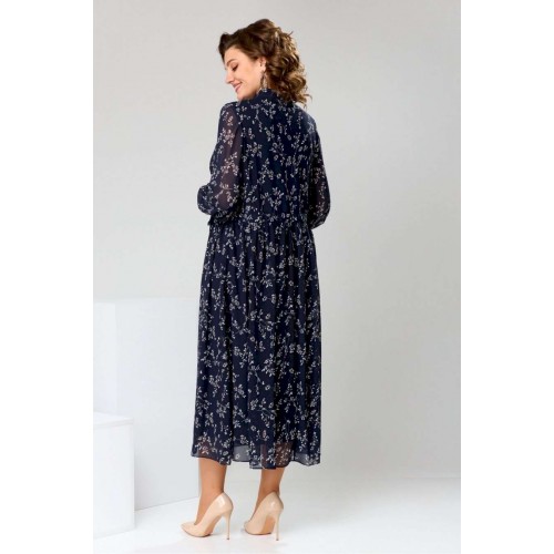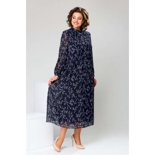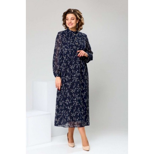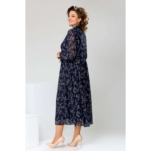 Платье женское, предназначено для повседневной носки. Платье женское отрезное по линии талии, слегка расширенное к низу, длиной до серединны икры. Верхняя часть переда с 2-мя нагрудными вытачками, с 2-мя вертикальными притачными планками, с 7-мью декоративными защипами шириной 0,3 см (с каждой стороны; нижняя часть переда с лёгкой сборкой по верхнему срезу по бокам). Верхняя часть спинки цельнокроеная; нижняя часть спинки с лёгкой сборкой по верхнему срезу. Платье с втачным поясом по линии талии с обработанной по ним кулисой с завязками с металлическими наконечниками. Горловина круглая с втачной стойкой. Застёжка центральная на верхней части переда на 5-ть вертикально обмётанных петель и 5-ть пришивных пуговиц. Рукав втачной, одно шовный длинный со сборкой и притачной манжетой, с застёжкой на обмётанную петлю и пришивную пуговицу. Платье на подкладке. Платье с плечевыми накладками. Длина спинки платья 126 см. Длина рукава 59 см.