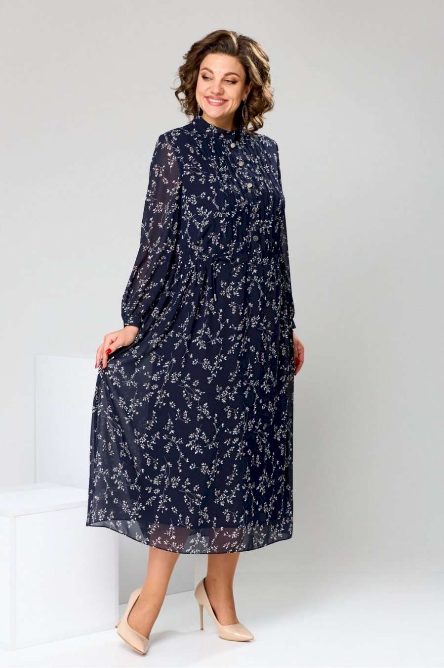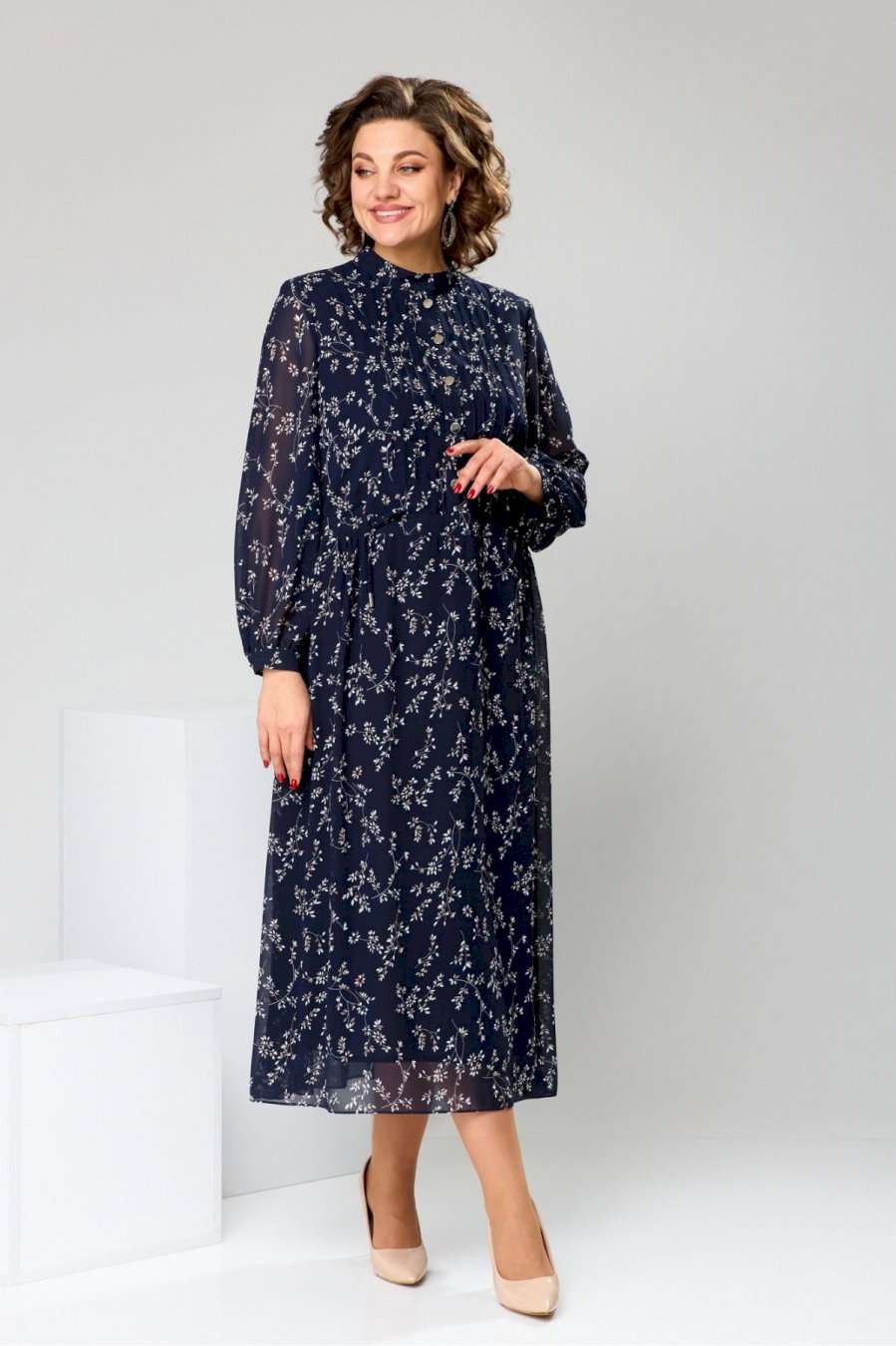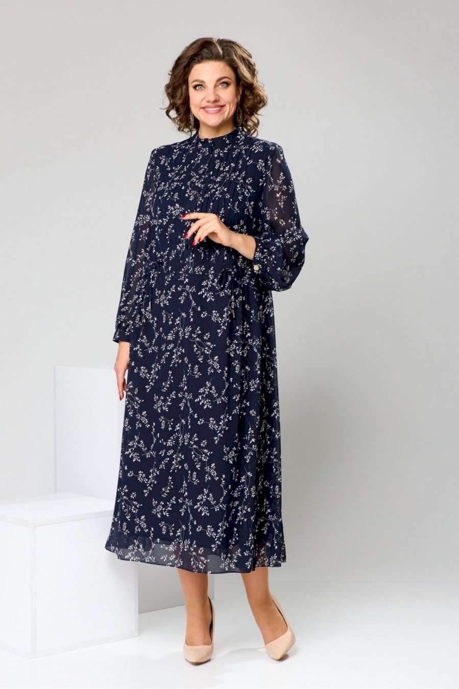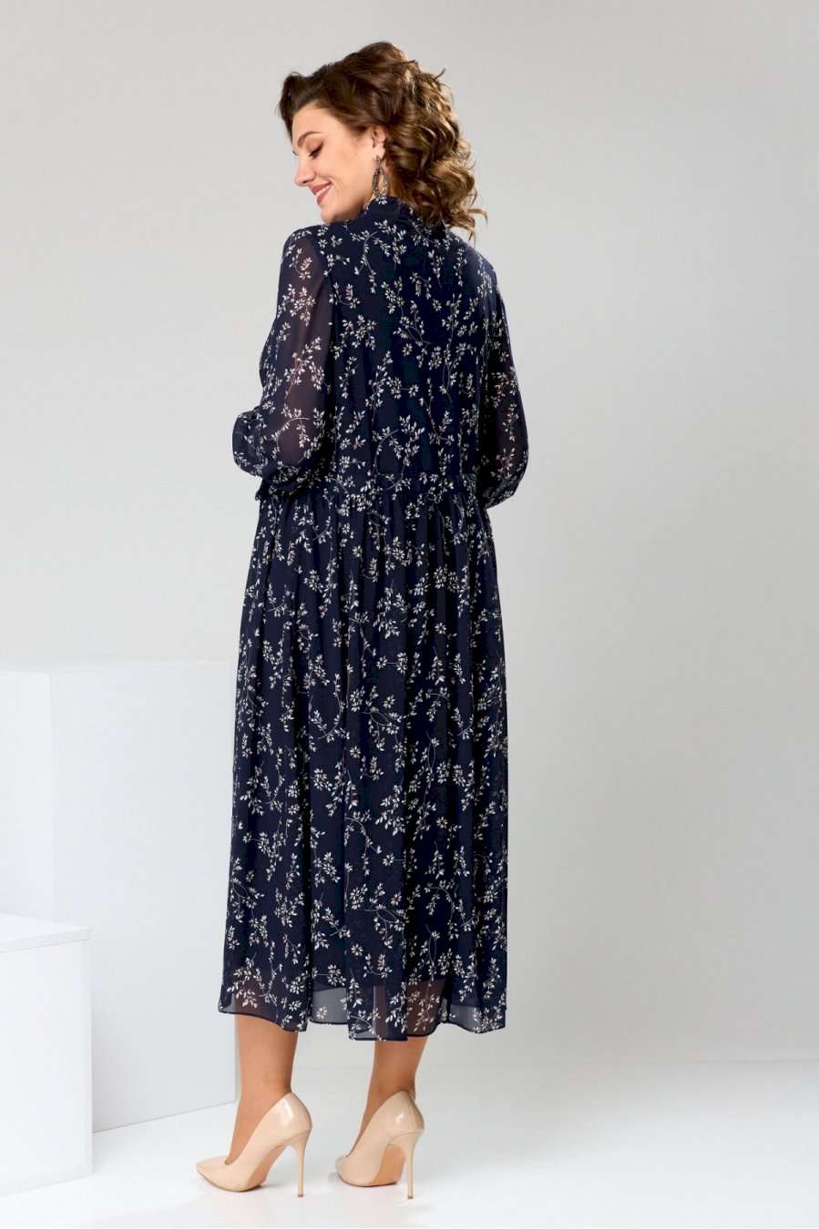 Платье женское, предназначено для повседневной носки. Платье женское отрезное по линии талии, слегка расширенное к низу, длиной до серединны икры. Верхняя часть переда с 2-мя нагрудными вытачками, с 2-мя вертикальными притачными планками, с 7-мью декоративными защипами шириной 0,3 см (с каждой стороны; нижняя часть переда с лёгкой сборкой по верхнему срезу по бокам). Верхняя часть спинки цельнокроеная; нижняя часть спинки с лёгкой сборкой по верхнему срезу. Платье с втачным поясом по линии талии с обработанной по ним кулисой с завязками с металлическими наконечниками. Горловина круглая с втачной стойкой. Застёжка центральная на верхней части переда на 5-ть вертикально обмётанных петель и 5-ть пришивных пуговиц. Рукав втачной, одно шовный длинный со сборкой и притачной манжетой, с застёжкой на обмётанную петлю и пришивную пуговицу. Платье на подкладке. Платье с плечевыми накладками. Длина спинки платья 126 см. Длина рукава 59 см.