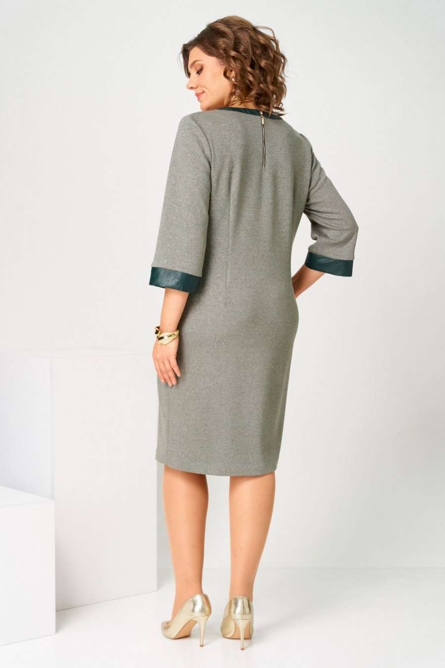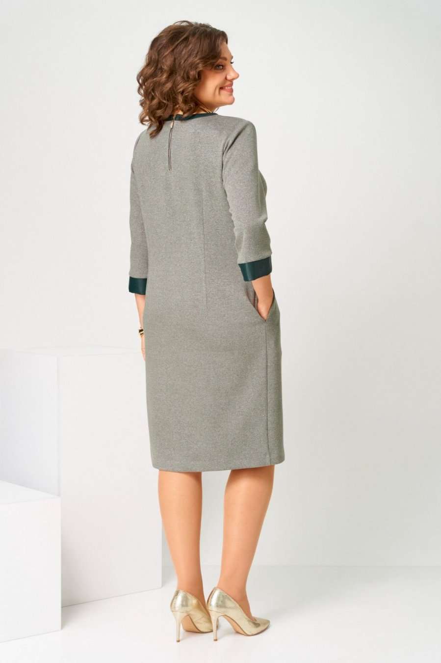 Платье предназначено для повседневной носки. Платье женское, полуприлегающего силуэта, длиной за колено. Перед с 2-мя нагрудными вытачками, с цельнокроенной вертикальной планкой шириной 3,5 см, закреплённой к переду 6-ю пришивными декоротивными пуговицами; перед с втачной планкой из лтделочной ткани. Спинка с 2-мя таллиевыми вытачками, с втачной металлической молнией, с втачной планкой из отделочной ткани по горловине. Платье с карманами в боковых швах. Рукав втачной, одношовный с притачной манжетой из отделочной ткани, рукав длиной 3/4. Платье с плечевыми накладками. Длина спинки платья 103,5 см, длина рукава 47 см.