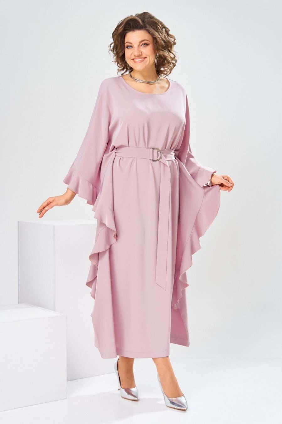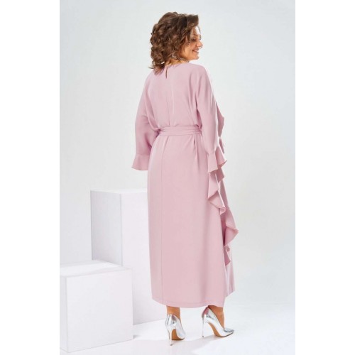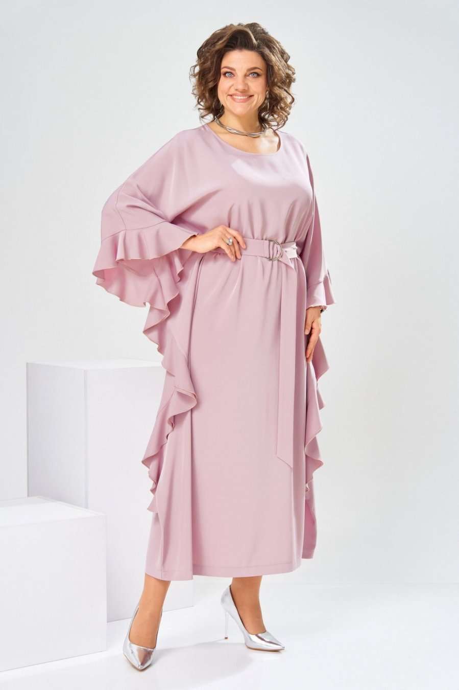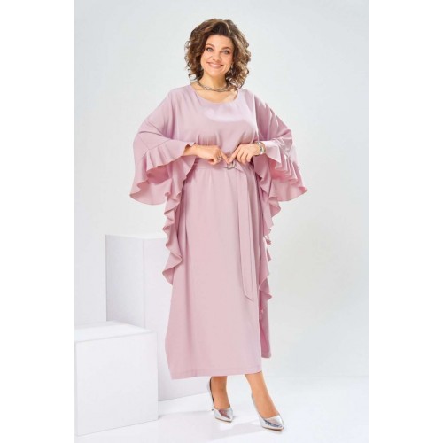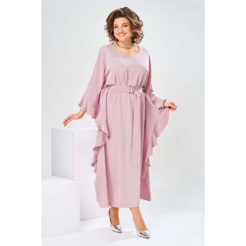 Платье женское, относится к нарядной торжественной одежде. Платье пончо свободного кроя, длинное. Перед цельнокроеный. Спинка со средним швом, вверху с разрезом, фиксирующимся по горловине на 1-ну навесную петлю и 1-ну пришивную пуговицу. Горловина круглая, обточная, без воротника, по переду горловины отделочная строчка 0,6 см. Рукав цельнокроеный удлинённый. Низ рукава и боковые швы декорированы приточной оборкой. По боковым швам зафиксирован уровень пройм и место расположения петель на уровне линии талии отделочными строчками. К платью прилагается съёмный пояс с пряжкой, фиксируемые на платье в петли на уровне линии талии. Платье без плечевых накладок. Длина спинки платья 132 см, ширина на уровне глубины проймы 66 см, ширина по линии талии 66 см, ширина плеча+длина рукава 56,5 см.
