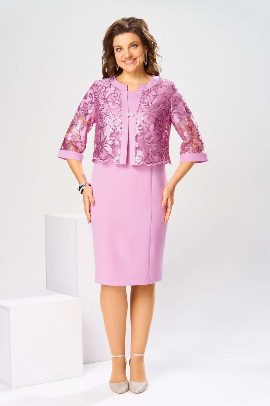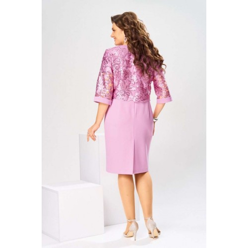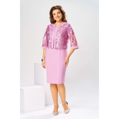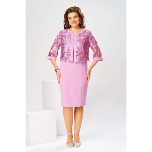Комплект женский, относится к торжественно-нарядной одежде. Комплект женский, 2-х предметный, жакет и платье. Жакет женский прямого силуэта, длиной до линии талии, выполнен из кружевного полотна. Перед с 2-мя нагрудными вытачками, с 2-мя притачными вертикальными планками, с притачными планками по горловине. Спинка с притачной планкой по горловине. Горловина круглая, обточная, без воротника. Застёжка на декоративный пришивной крючок. Рукав втачной одно шовный, длиной 3/4 с притачной манжетой. Жакет без плечевых накладок. Платье женской длиной за колено, полу прилегающего силуэта. Перед с 2-мя отрезными бочками. Спинка с 2-мя таллиевыми вытачками, со средним швом, заканчивающимся шлицей. Горловина круглая, обточная, без воротника. Застёжка на потайную тесьму-молнию в среднем шве спинки. Рукав втачной, короткий, одно шовный. Платье с плечевыми накладками. Длина спинки жакета 45 см, длина рукава 41 см. Длина спинки платья 100 см, длина рукава 19 см.