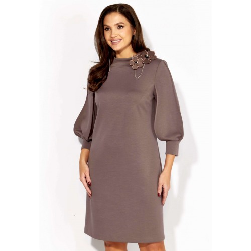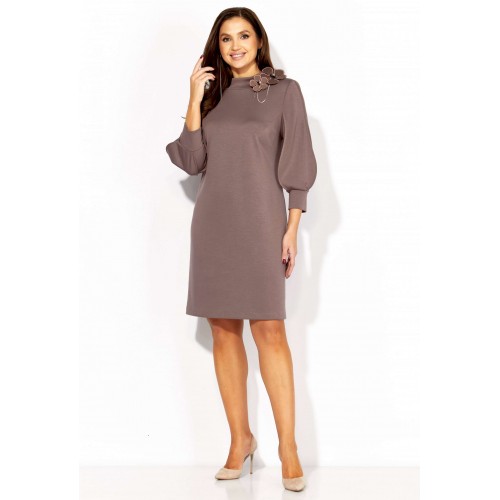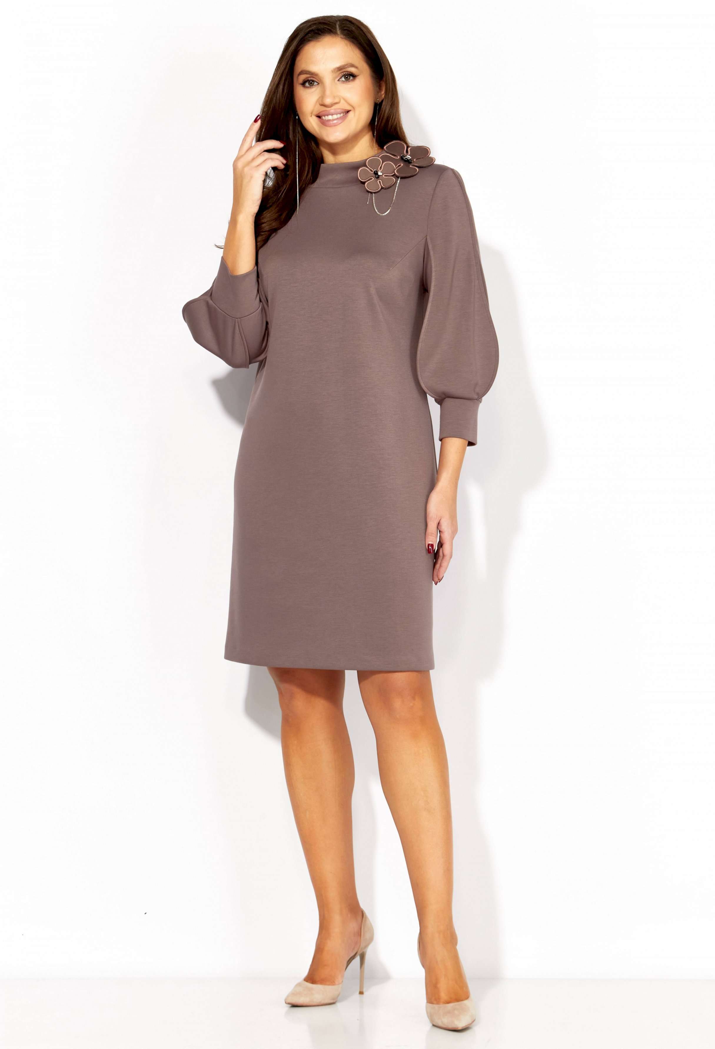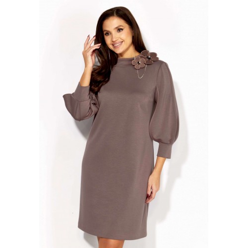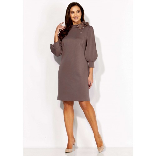 Платье женское, А-силуэта с втачным рукавом, длинной 3/4. Рукав фантазийной формы, типа \"фонарик\" состоящий из четырех деталей. Швы рукава отстрочены стройкой \"на ребро\" По переду нагрудные вытачки из пройм. Горловина оформлена расширенной, мягкой строчкой. Декором служит съемное украшение.
