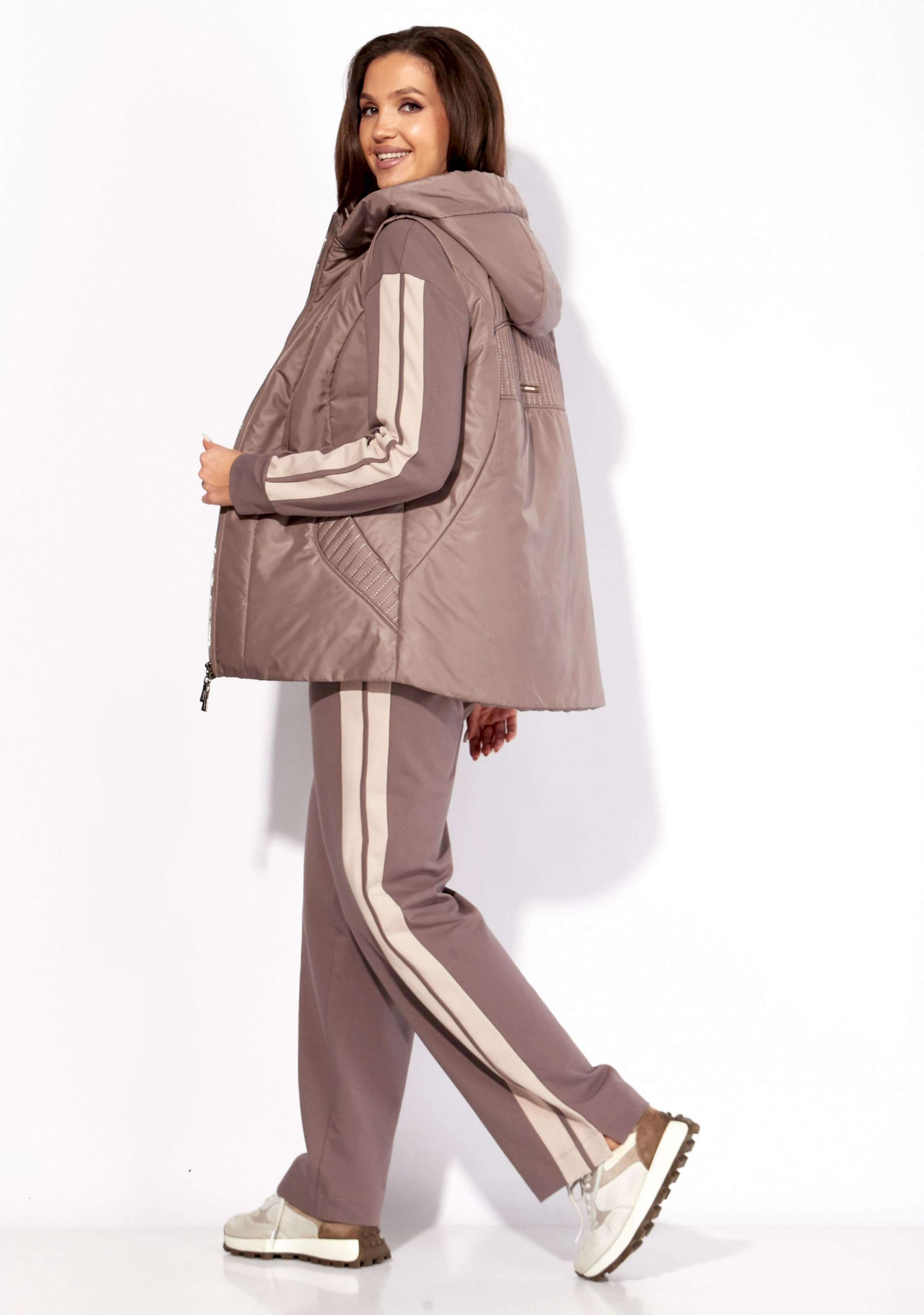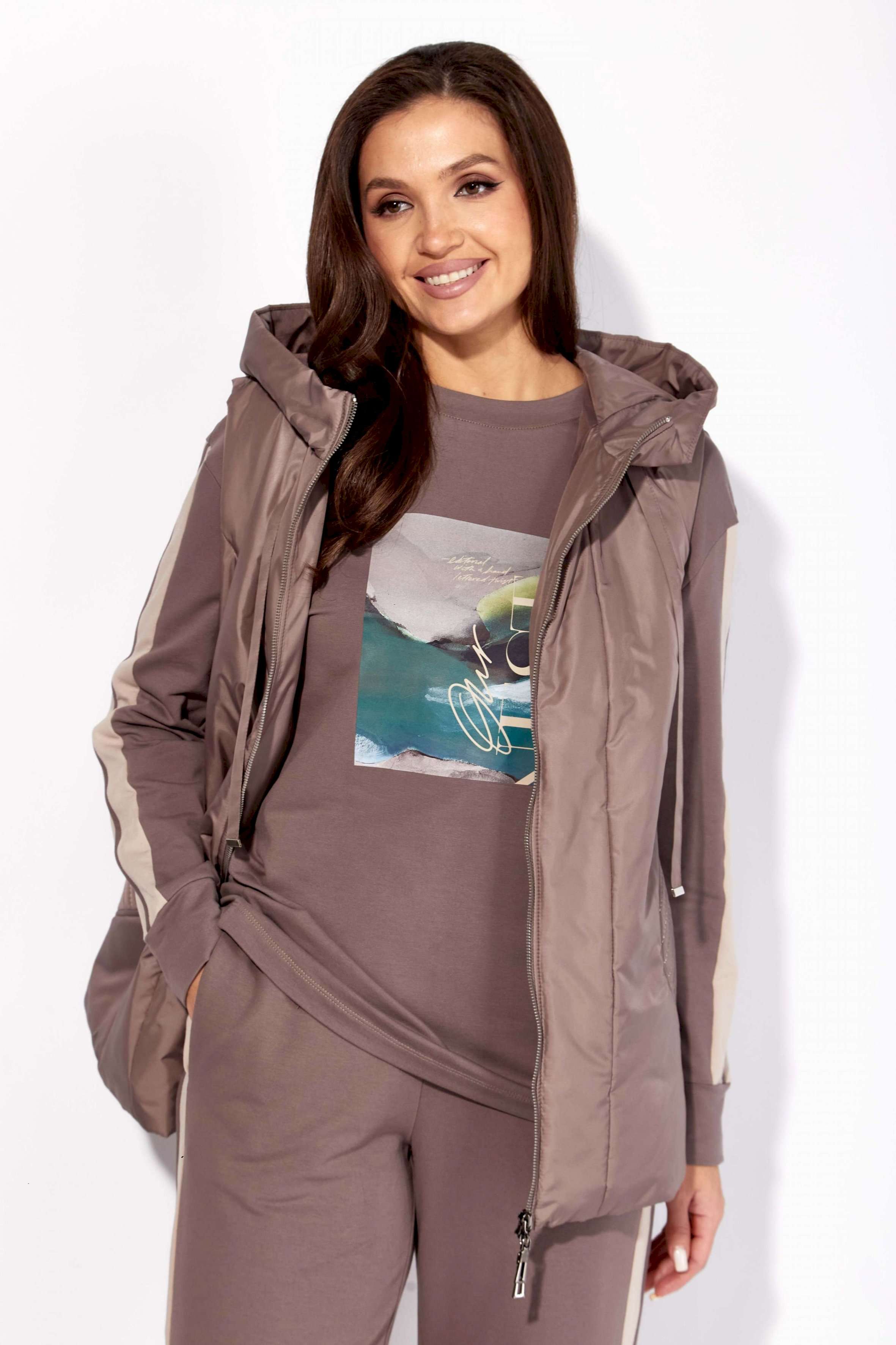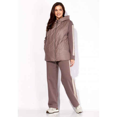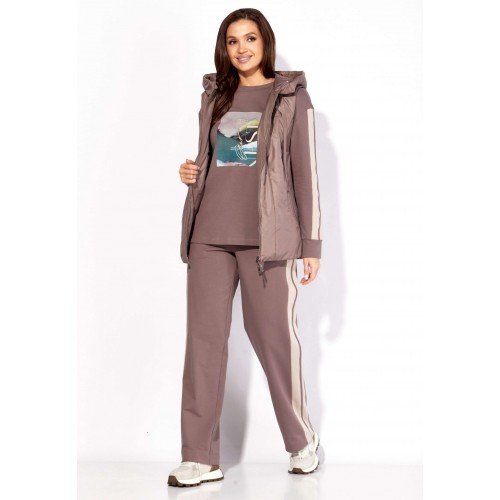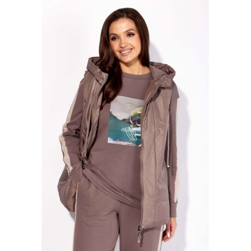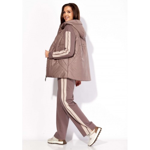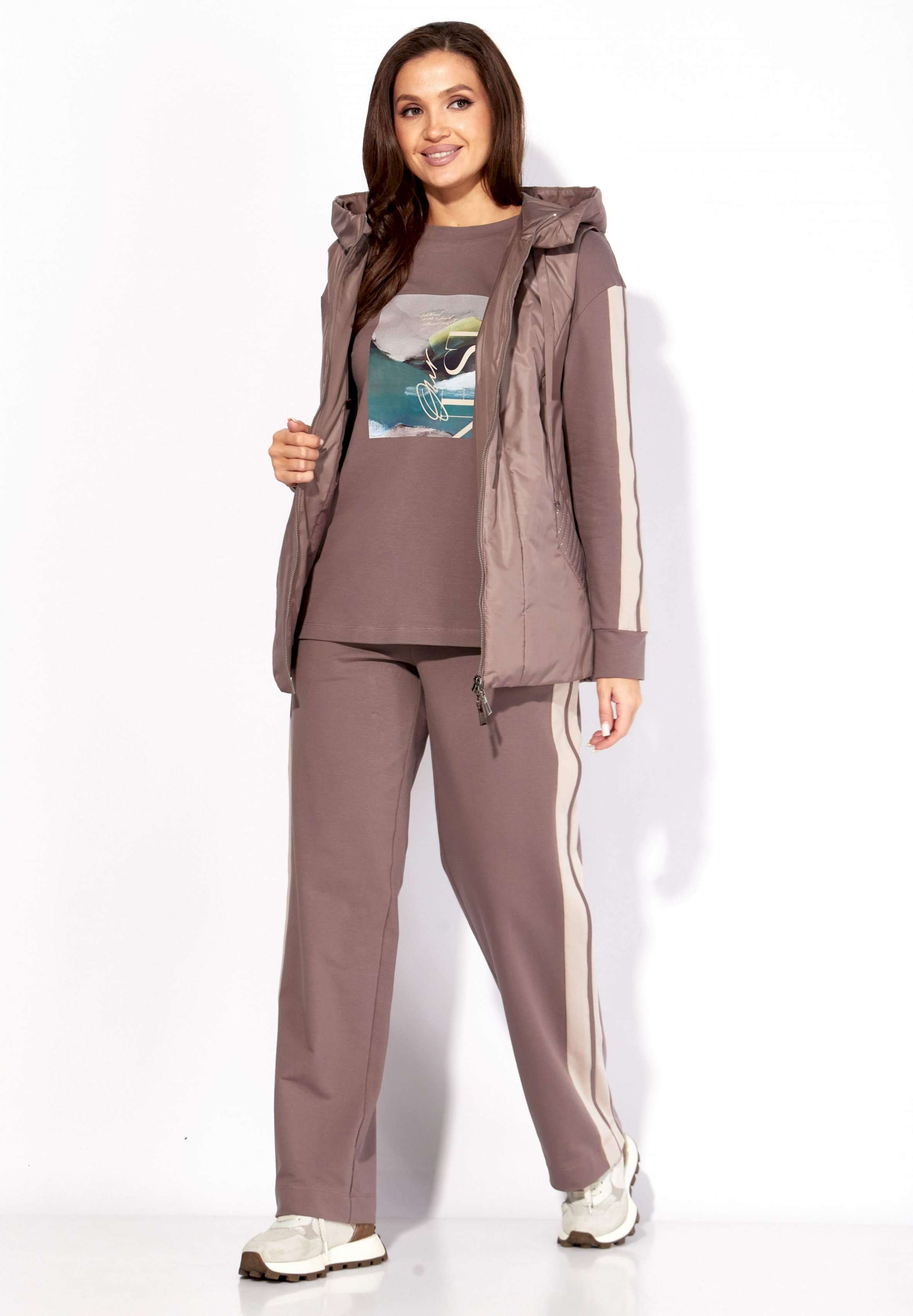 Комплект женский, 3-х предметный, состоящий из свитшота, брюк и жилета. Свитшот прямого силуэта с отрезными бочками. Рукав длинный, со спущенной линией плеча, снизу на манжете. Горловина круглой формы с подрезной бейкой. Перед задекорирован принтом. Брюки прямые с карманами в боковых швах. По низу небольшой разрез. Пояс притачной с резинкой (по центру гладкий). По бокам брюк и по центру рукавов втачные отделочные лампасы с контрастным кантом. Жилет выполнен из плащевки на синтепоне (vs100) на подкладке, прямого силуэта. По переду рельефы из пройм в боковой шов. В рельефах карманы с отделочными деталями в форме клапана. Застежка центральная на тесьму-молния. Горловина оформлена капюшоном со стойкой и кулисой. По спинке фигурные рельефы. Центральная часть с отделочной деталью и декоративной нашивкой. Низ жилета по спинке чуть длиннее.