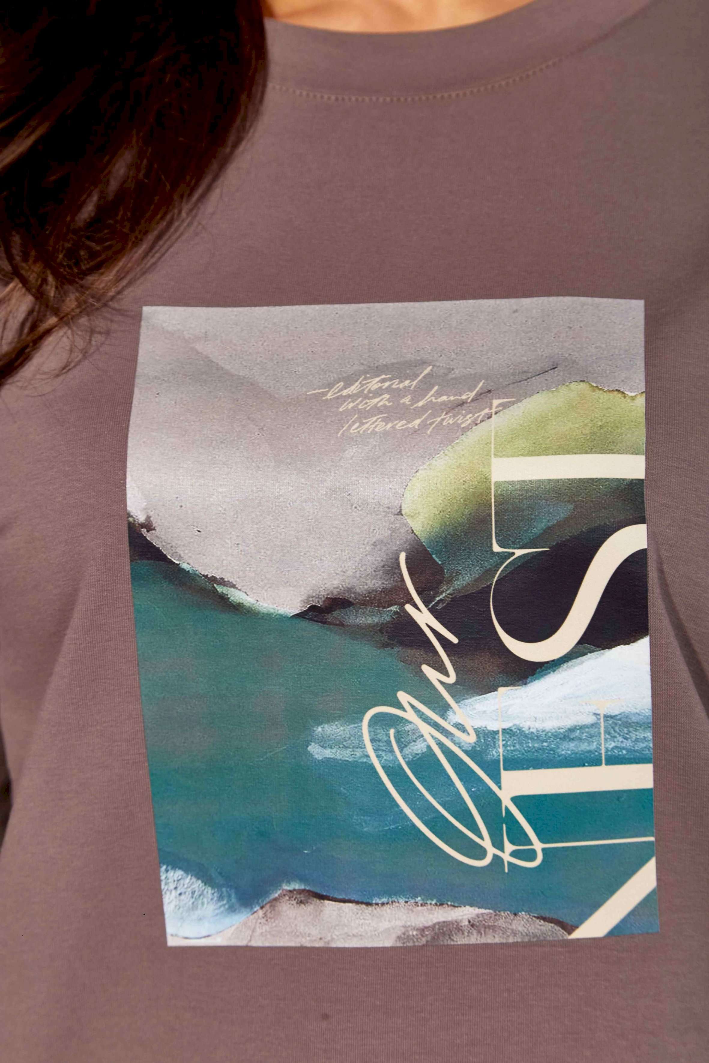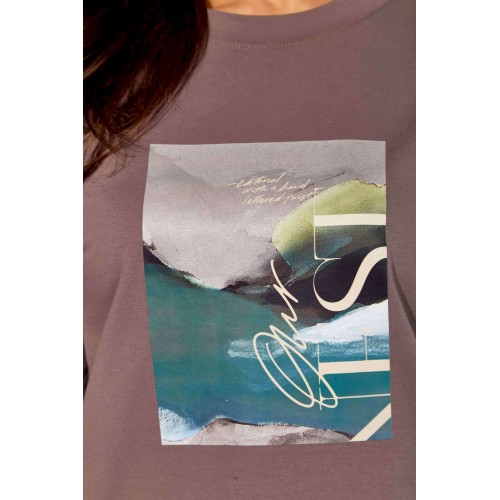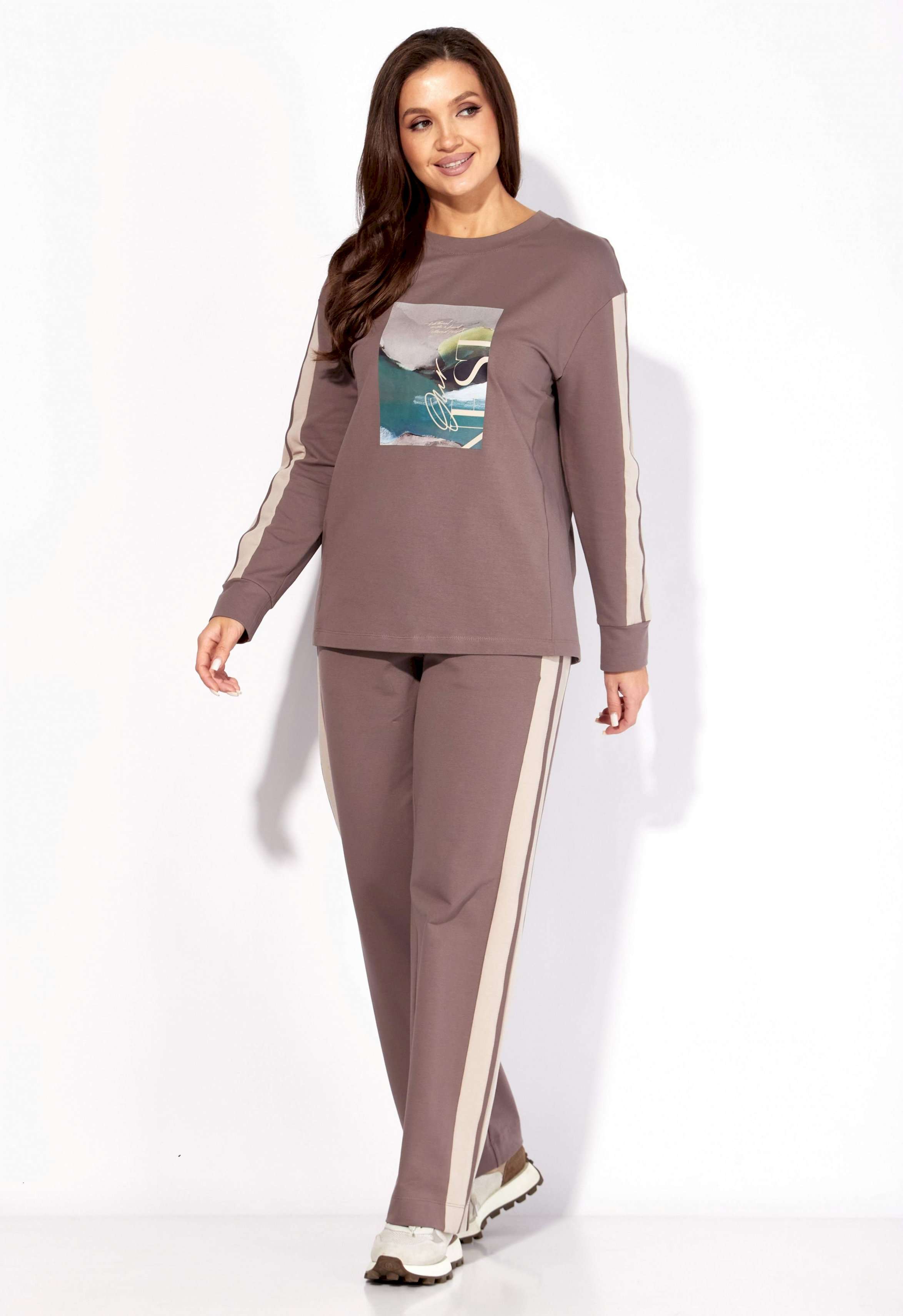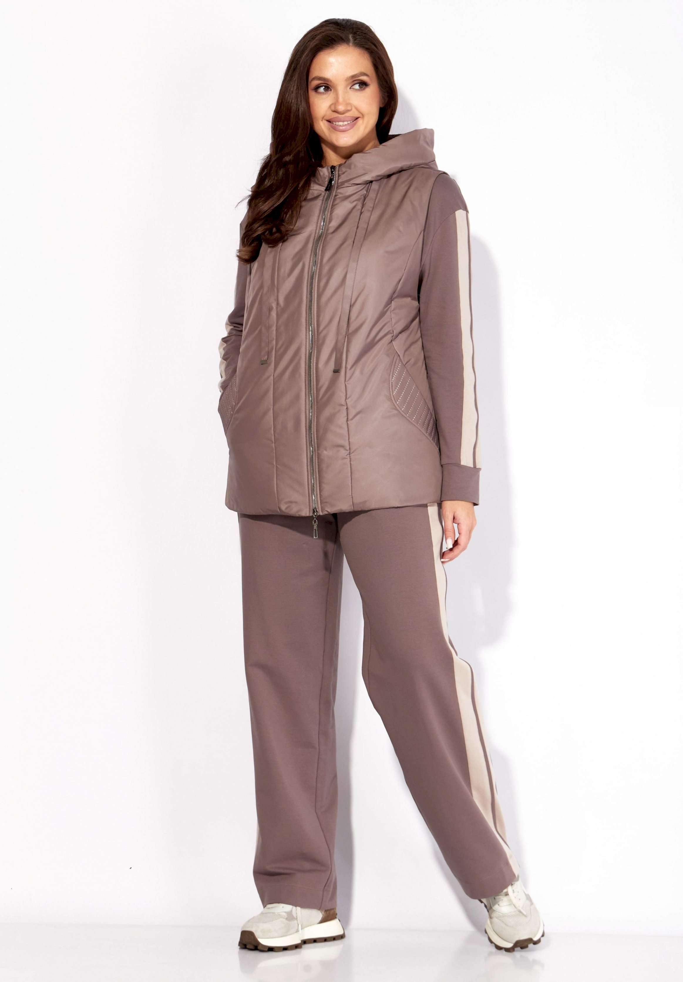 Комплект женский, 3-х предметный, состоящий из свитшота, брюк и жилета. Свитшот прямого силуэта с отрезными бочками. Рукав длинный, со спущенной линией плеча, снизу на манжете. Горловина круглой формы с подрезной бейкой. Перед задекорирован принтом. Брюки прямые с карманами в боковых швах. По низу небольшой разрез. Пояс притачной с резинкой (по центру гладкий). По бокам брюк и по центру рукавов втачные отделочные лампасы с контрастным кантом. Жилет выполнен из плащевки на синтепоне (vs100) на подкладке, прямого силуэта. По переду рельефы из пройм в боковой шов. В рельефах карманы с отделочными деталями в форме клапана. Застежка центральная на тесьму-молния. Горловина оформлена капюшоном со стойкой и кулисой. По спинке фигурные рельефы. Центральная часть с отделочной деталью и декоративной нашивкой. Низ жилета по спинке чуть длиннее.