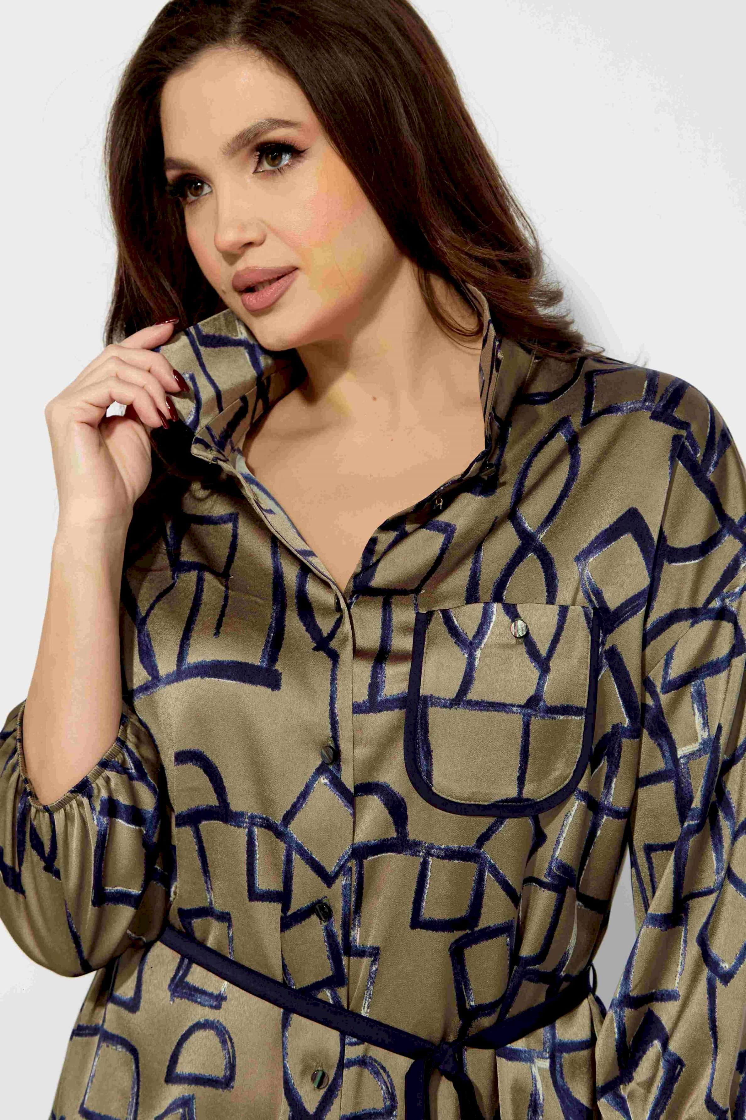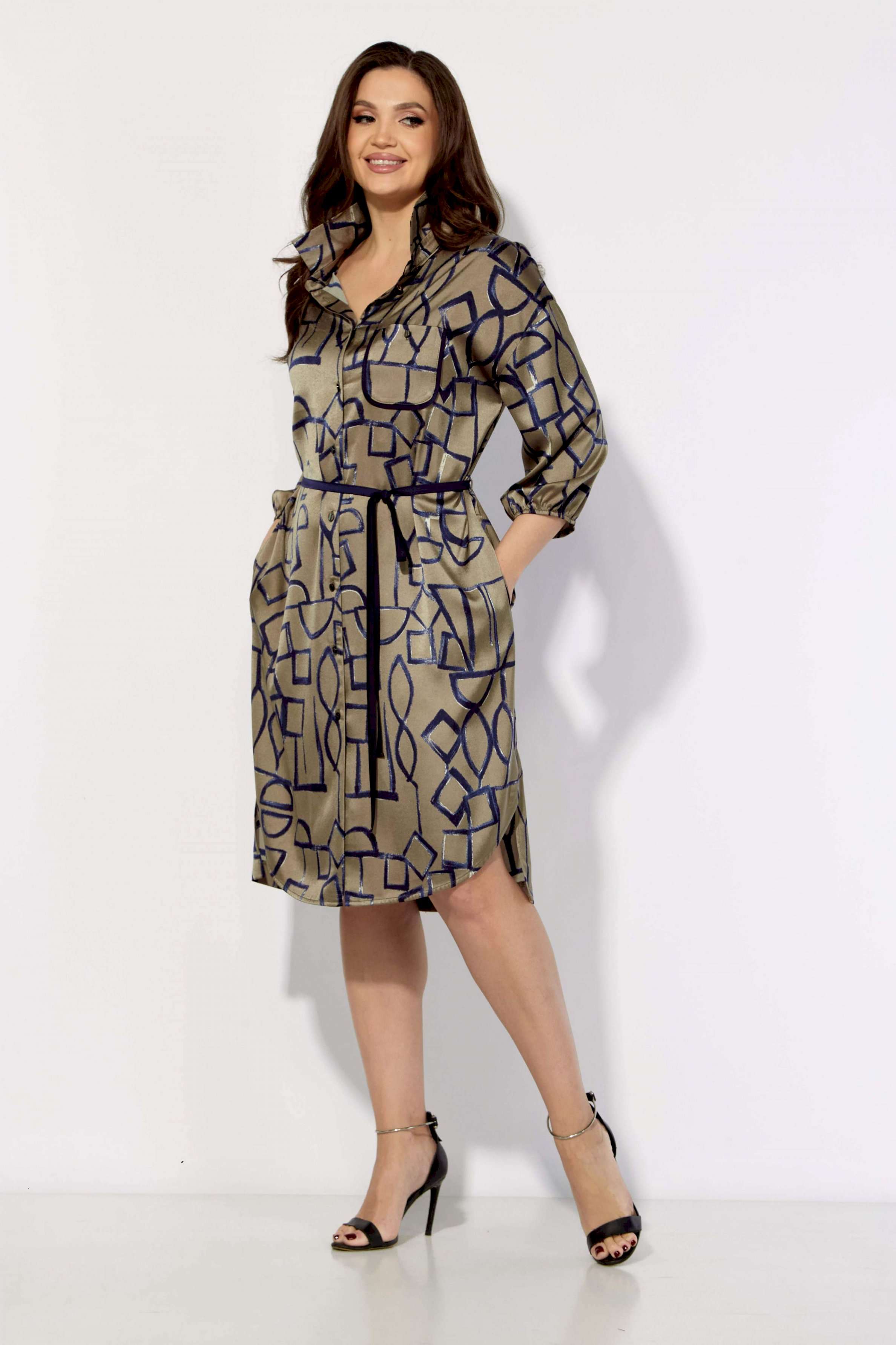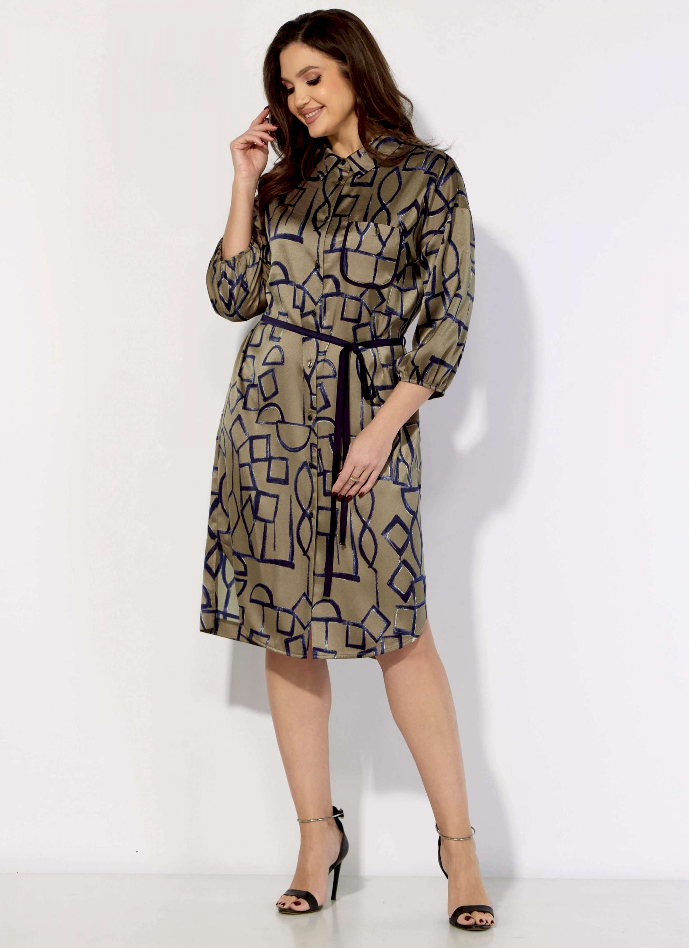 Платье женское, прямого силуэта с рукавом длинной 3/4. Рукав со спущенной линией плеча, снизу на резинке. Воротник рубашечный, на стойке. Застежка центральная, с отрезной планкой, на петли и пуговицы. По спинке кокетка и небольшая сборка по центру из под кокетки. Карманы в боковых швах. На левой полочке карман с отделочной бейкой и пуговицей. По низу боковые разрезы, спереди закругленной формы. Талия акцентирована съемным узким поясом, из отделочной ткани.