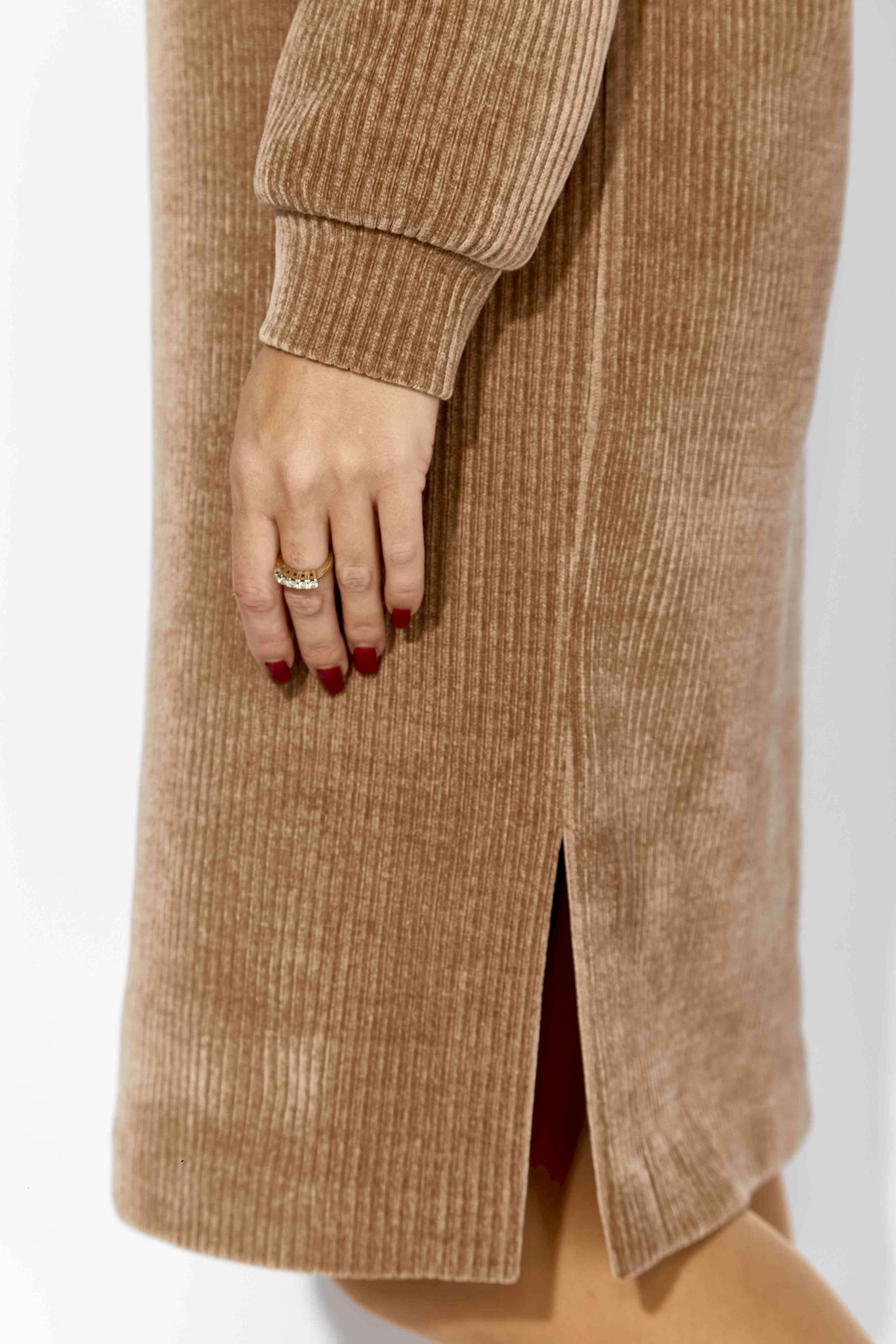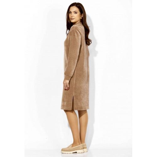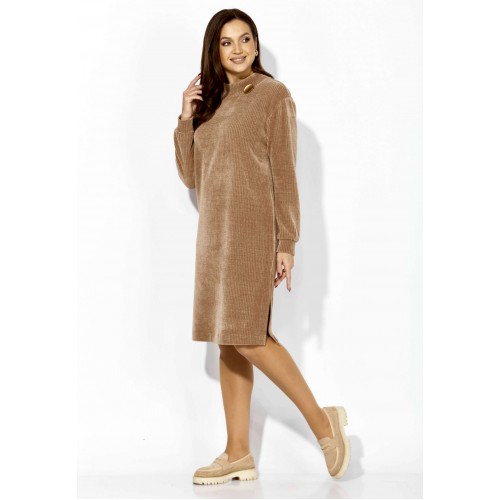Платье женское, прямого силуэта с длинным рукавом. Рукав со спущенной линией плеча, по низу на манжете. Горловина оформлена высокой, мягкой стойкой. По боку разрез, акцентирован декоративной сточкой. Спинка без особенностей.