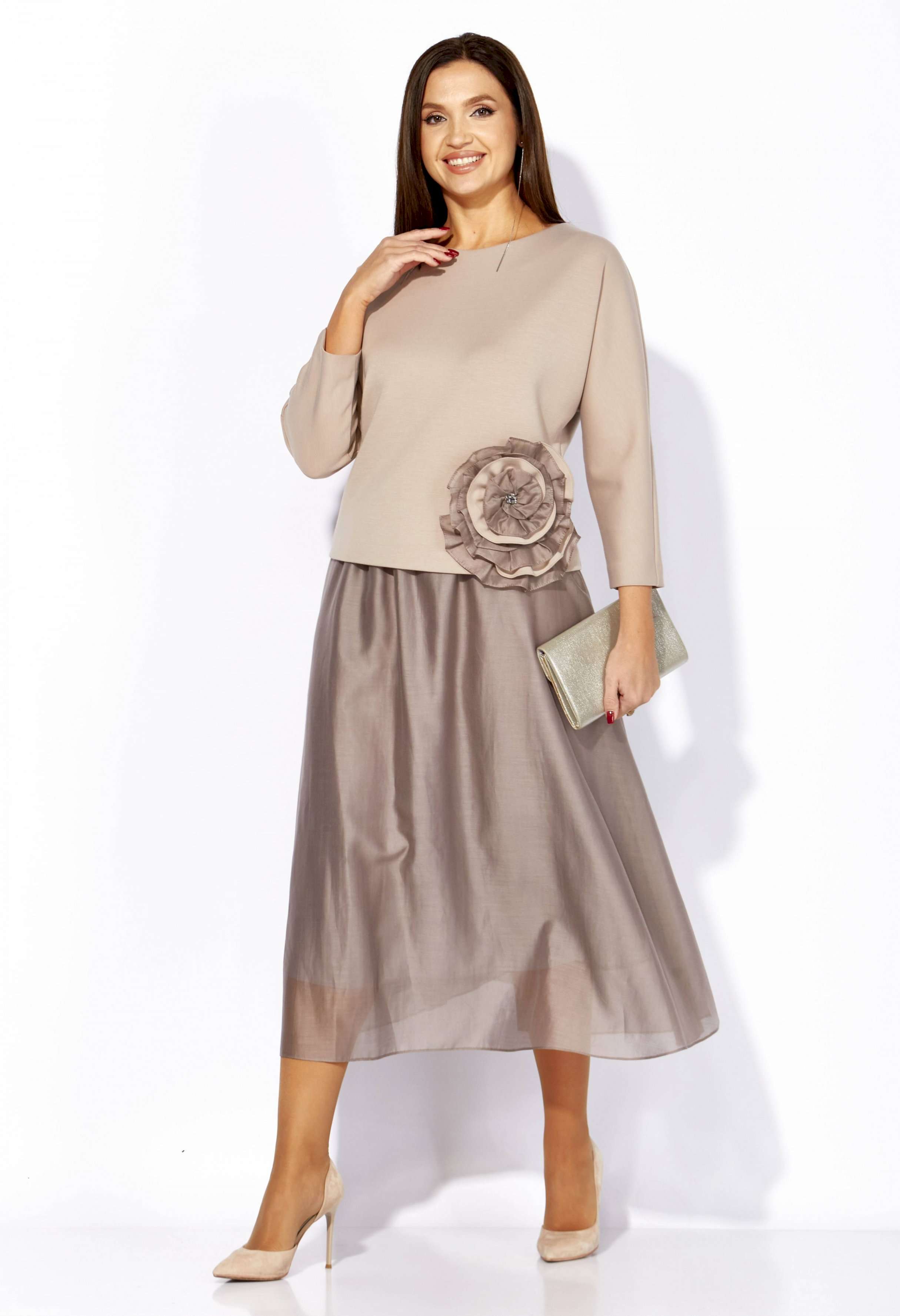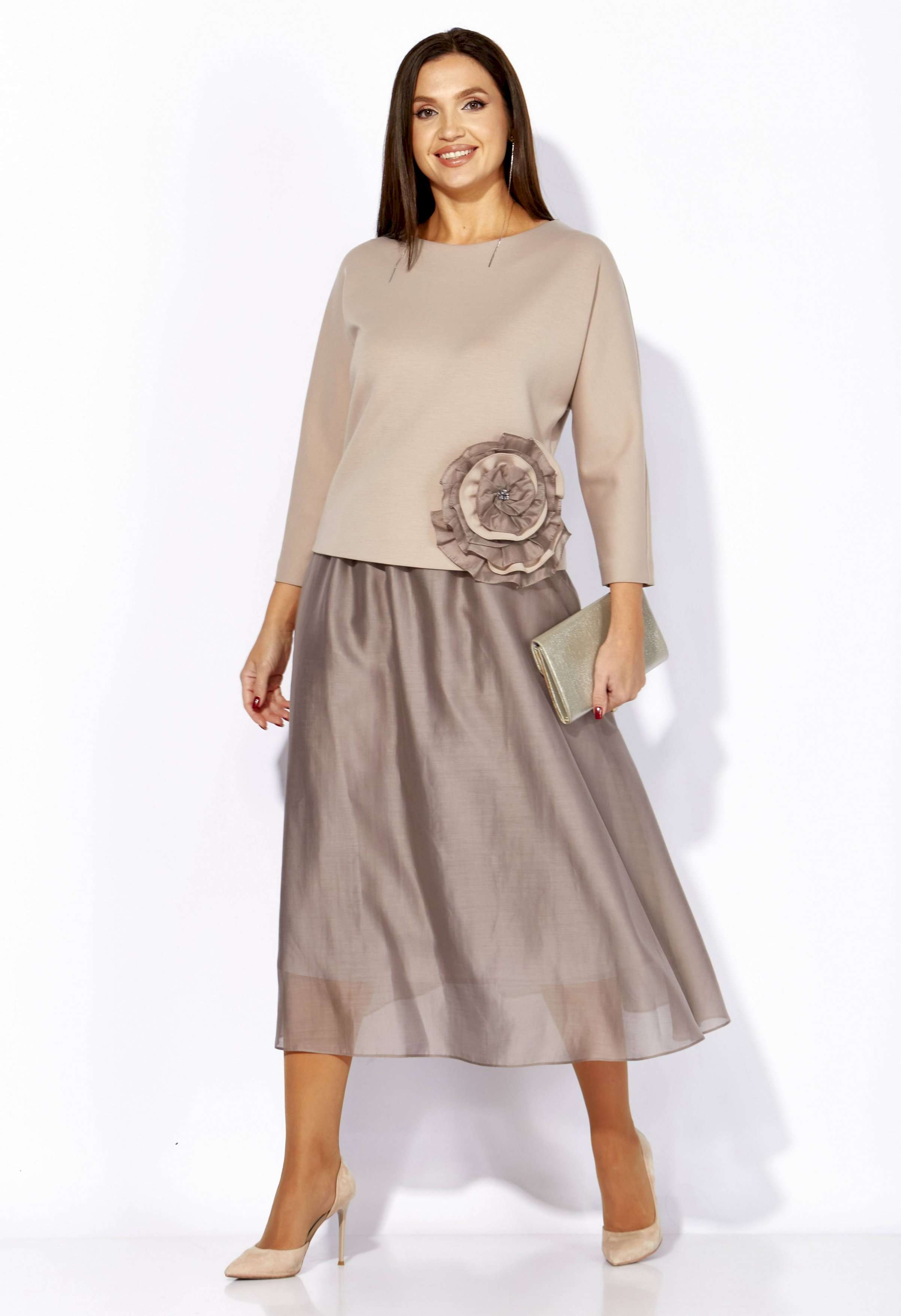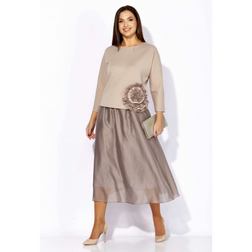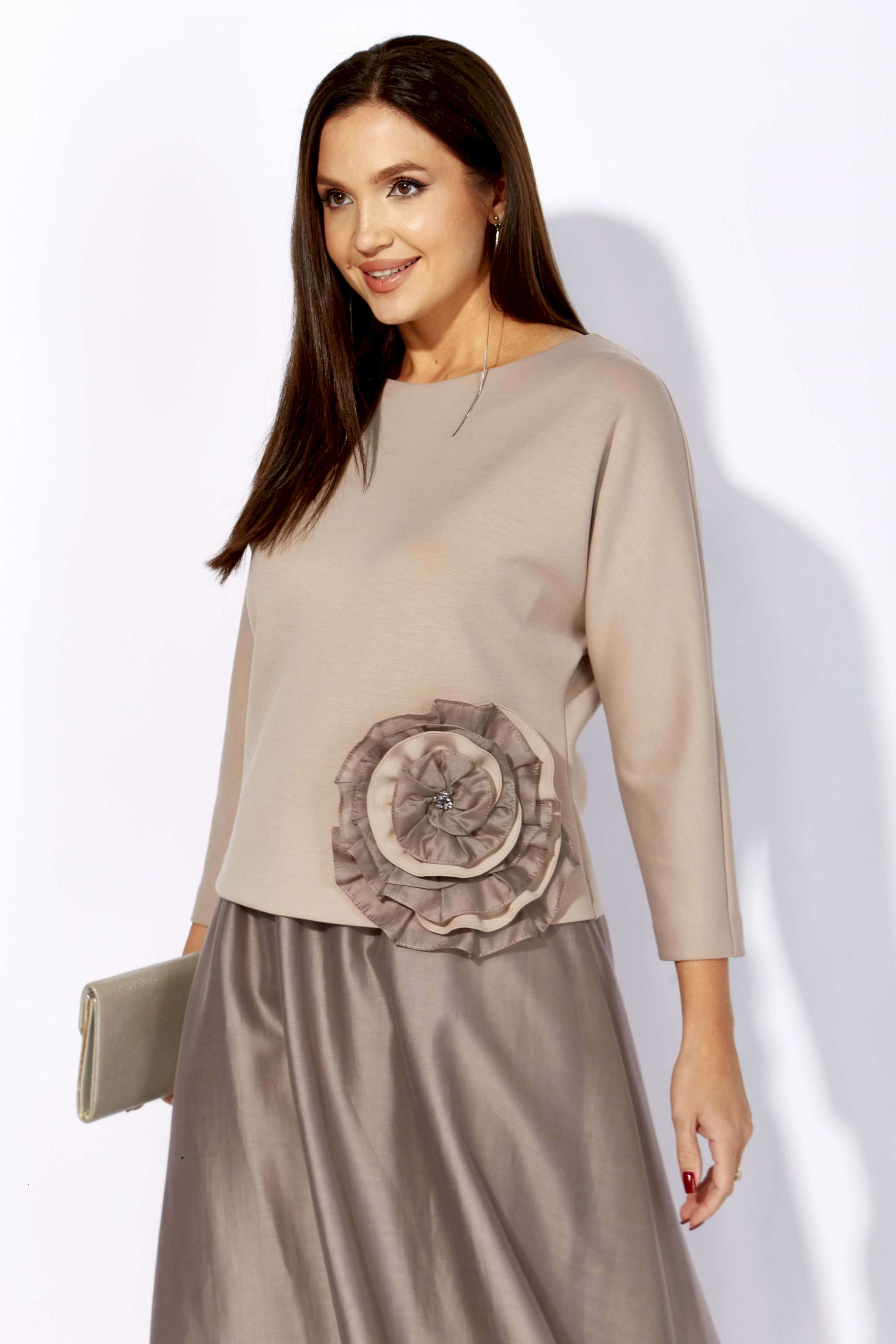 Комплект женский, 2х предметный, состоящий из блузки и юбки. Блузка полуприлегающего силуэта с цельнокройным рукавом длинной 3/4. Выполнена из трикотажного полотна \"ТЕНСЕЛ\". Вырез горловины \"лодочка\" По низу блузки, слева, декоративный элемент из рюши, в сочетании двух видов ткани. По спинке средний шов. Юбка широкая к низу, из текстильной ткани \"вуалька\" На подкладке. Пояс притачной с резинкой по кругу.