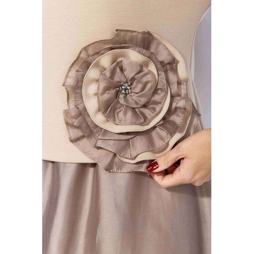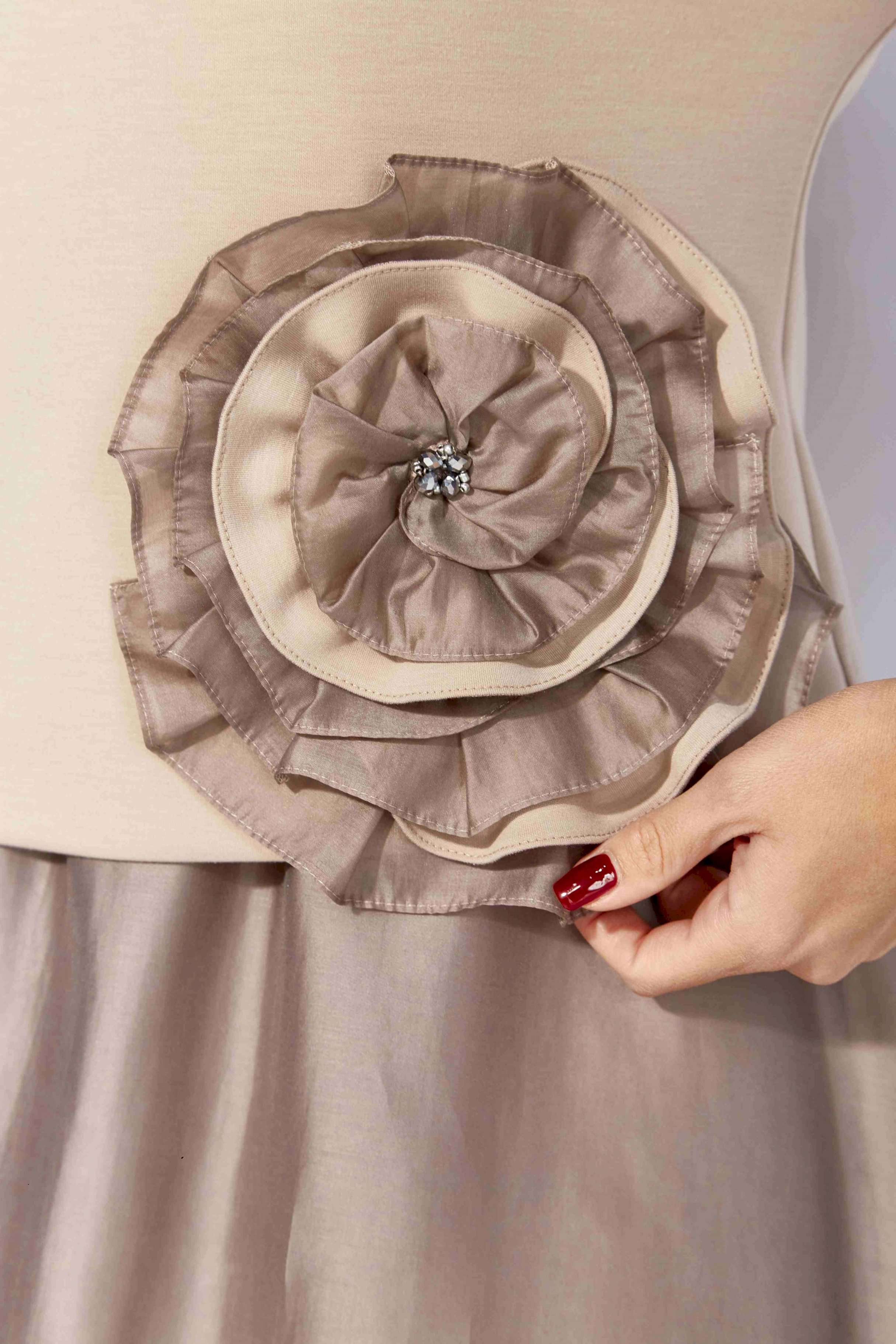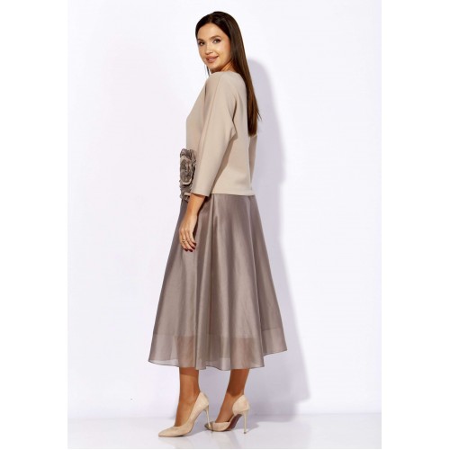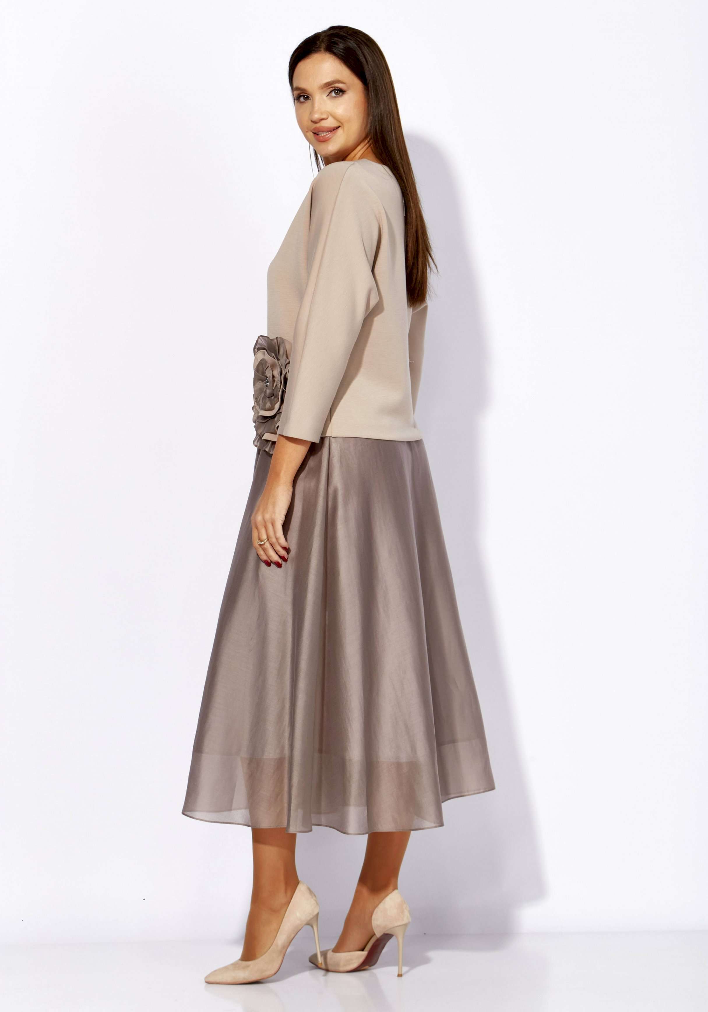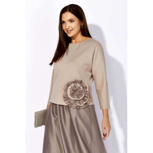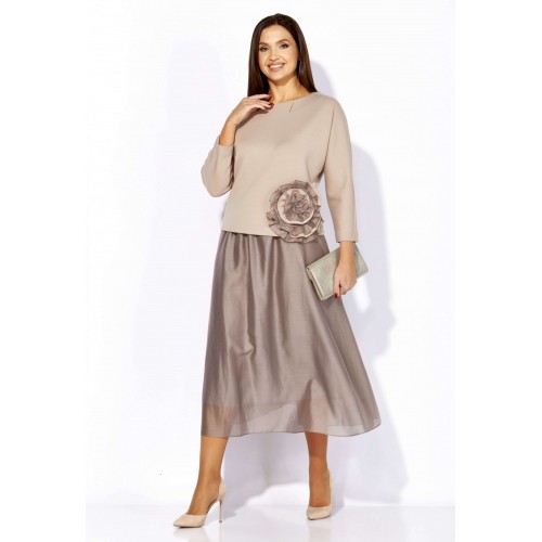 Комплект женский, 2х предметный, состоящий из блузки и юбки. Блузка полуприлегающего силуэта с цельнокройным рукавом длинной 3/4. Выполнена из трикотажного полотна \"ТЕНСЕЛ\". Вырез горловины \"лодочка\" По низу блузки, слева, декоративный элемент из рюши, в сочетании двух видов ткани. По спинке средний шов. Юбка широкая к низу, из текстильной ткани \"вуалька\" На подкладке. Пояс притачной с резинкой по кругу.