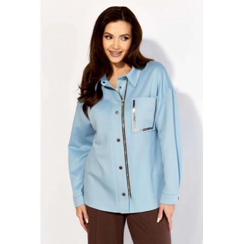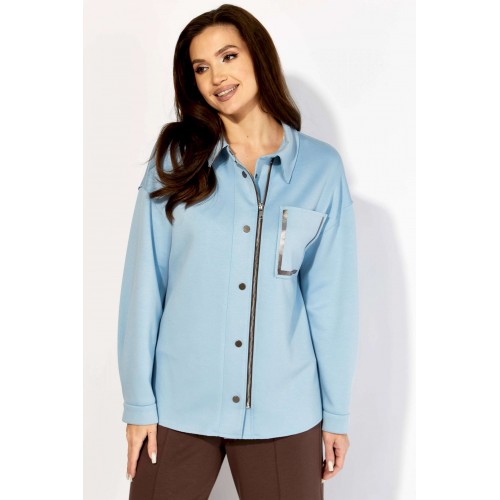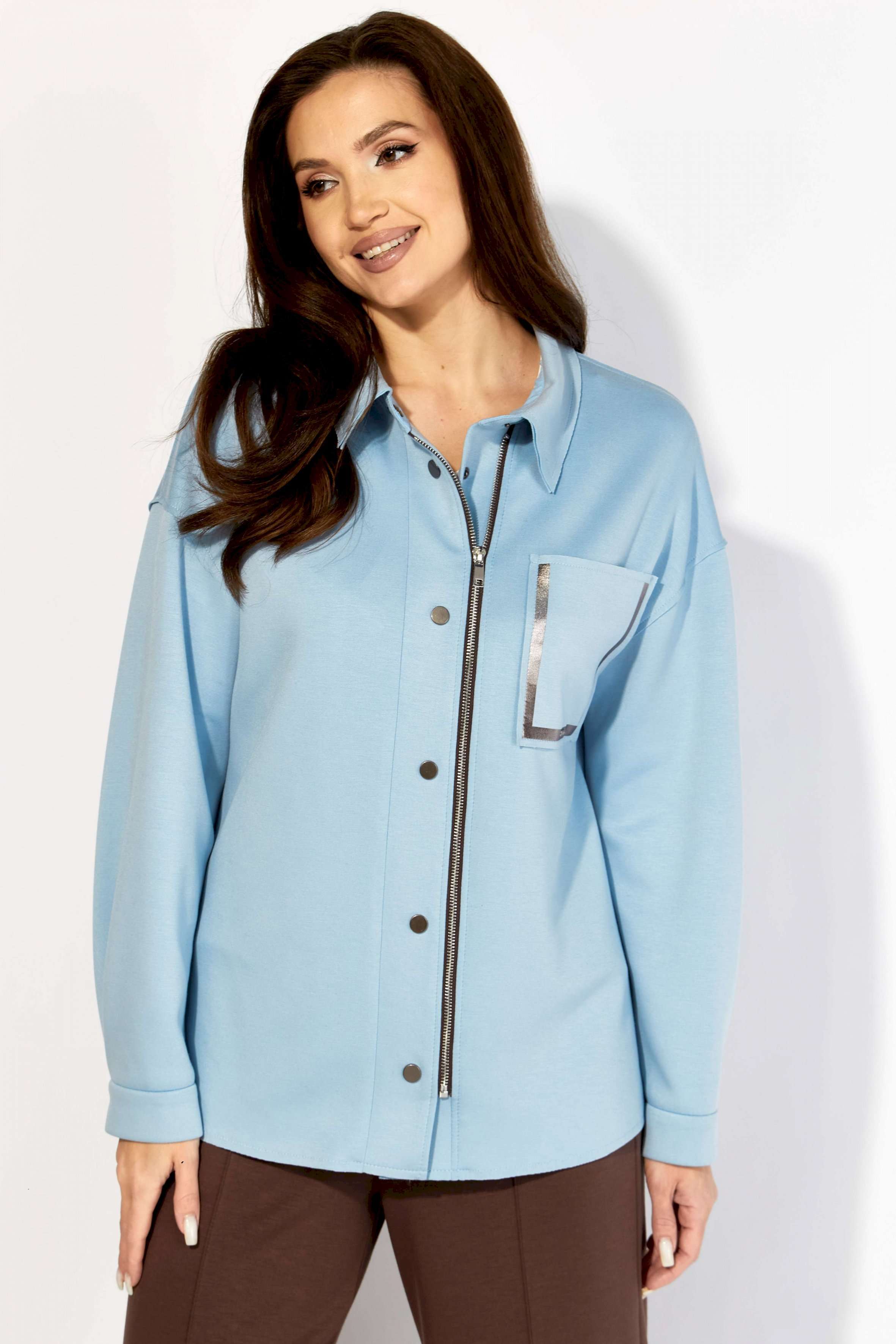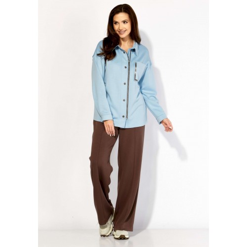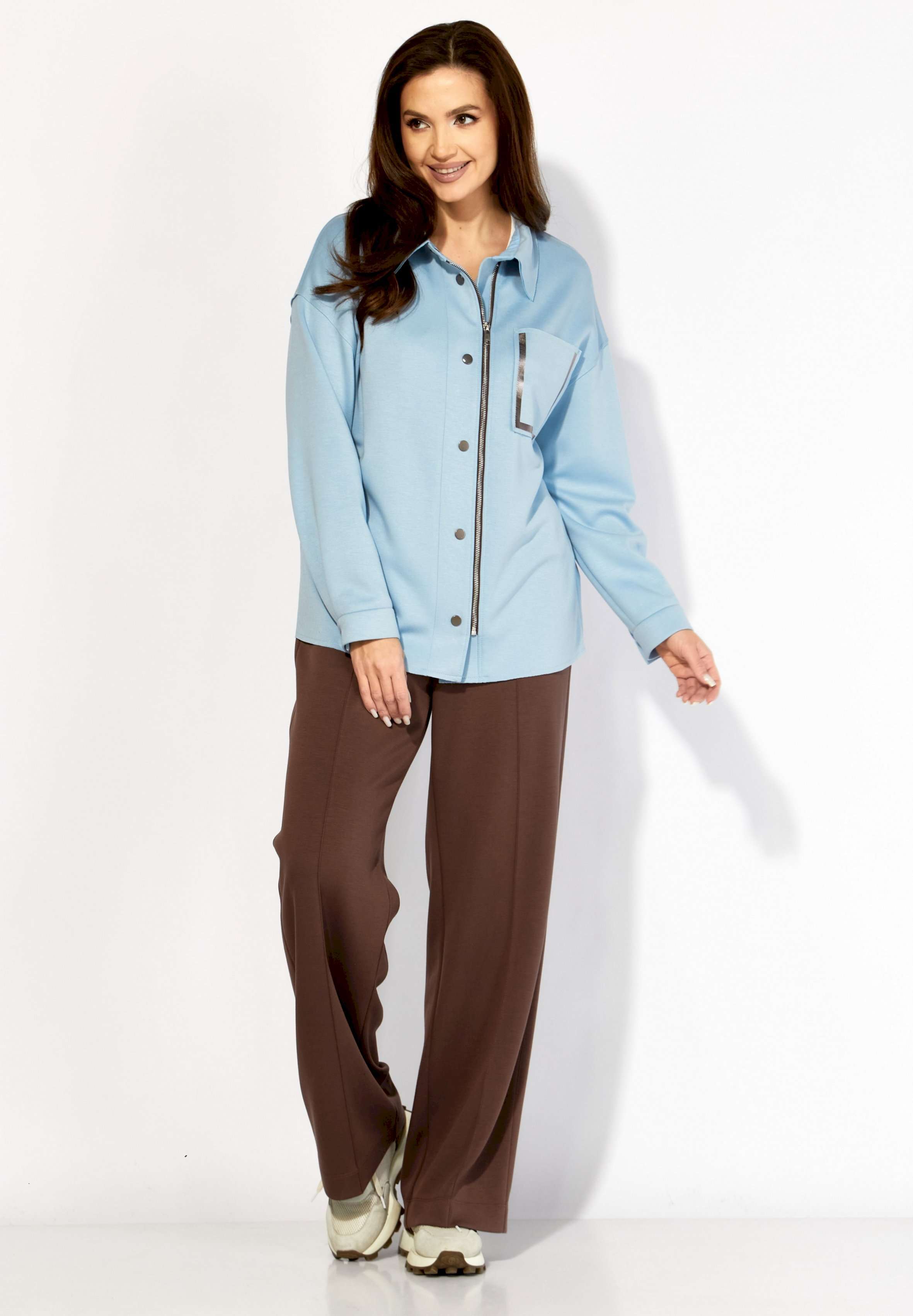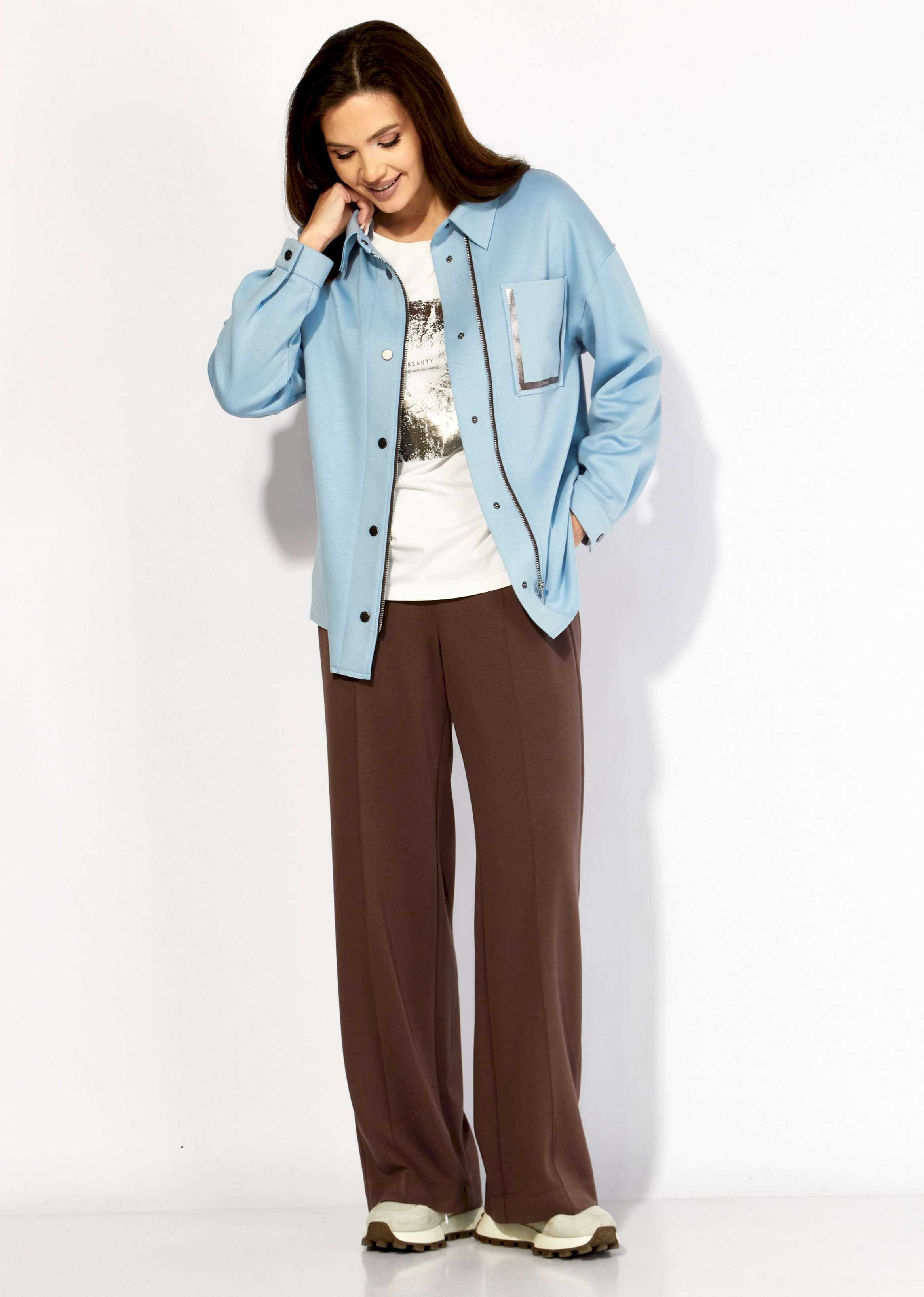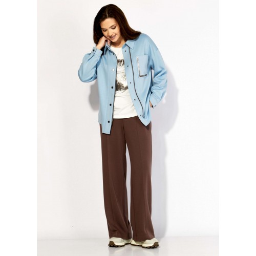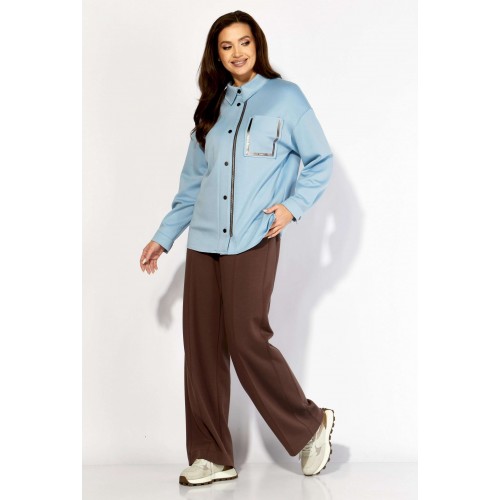 Костюм женский, 2х предметный, изготовлен из трикотажного полотна TENSEL , состоящий из рубашки и брюк. Рубашка прямого силуэта с длинным рукавом. Рукав со спущенной линией плеча. По низу манжета, с застежкой на кнопку. Застежка центральная, с отрезной планкой на кнопки и чуть смещенную тесьму «молния» Воротник рубашечный, на стойке. На левой полочке карман, акцентированный принтом. Плечевые швы, проймы, воротник и низ изделия выполнеы с открытым срезом, с закрепляющей строчкой. Брюки широкие, прямые. По боку подрезной лапмас и карманы. По центру переда пристрочены защипы «стрелки» Пояс притачной, с гладкой центральной частью, дальше резинка по кругу.