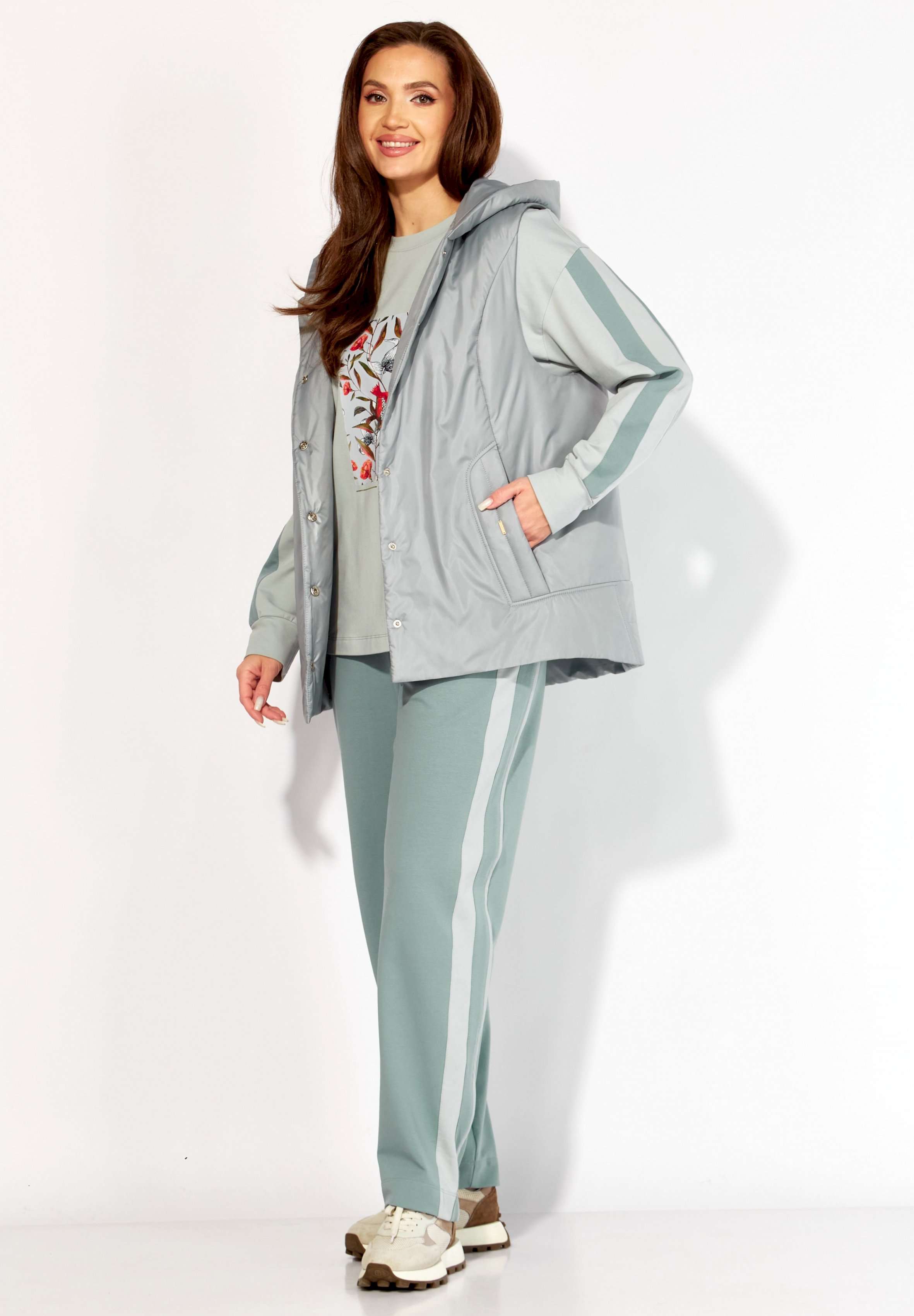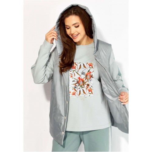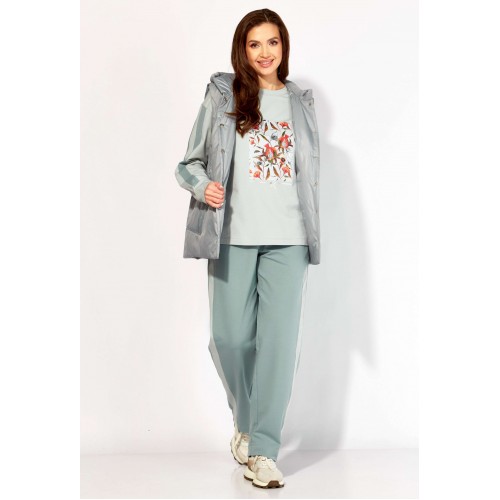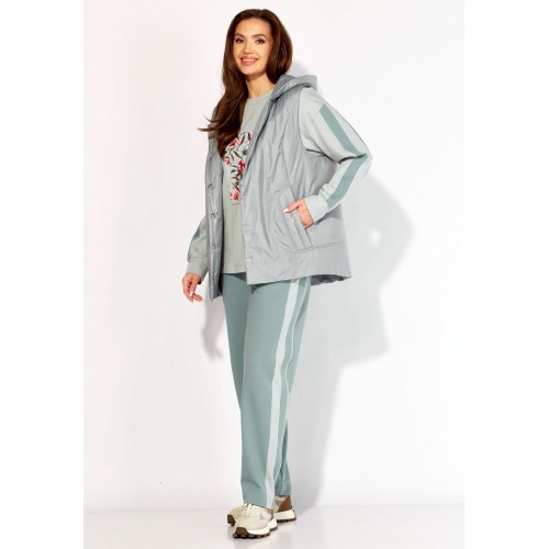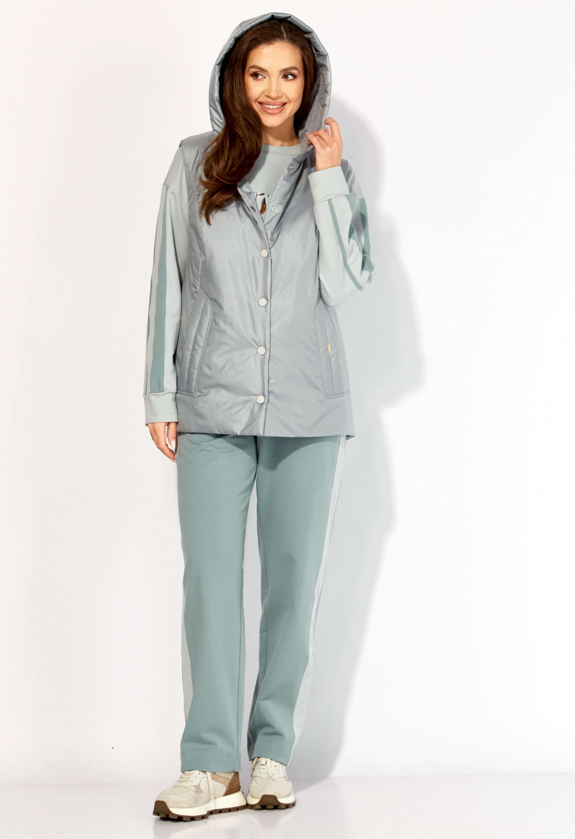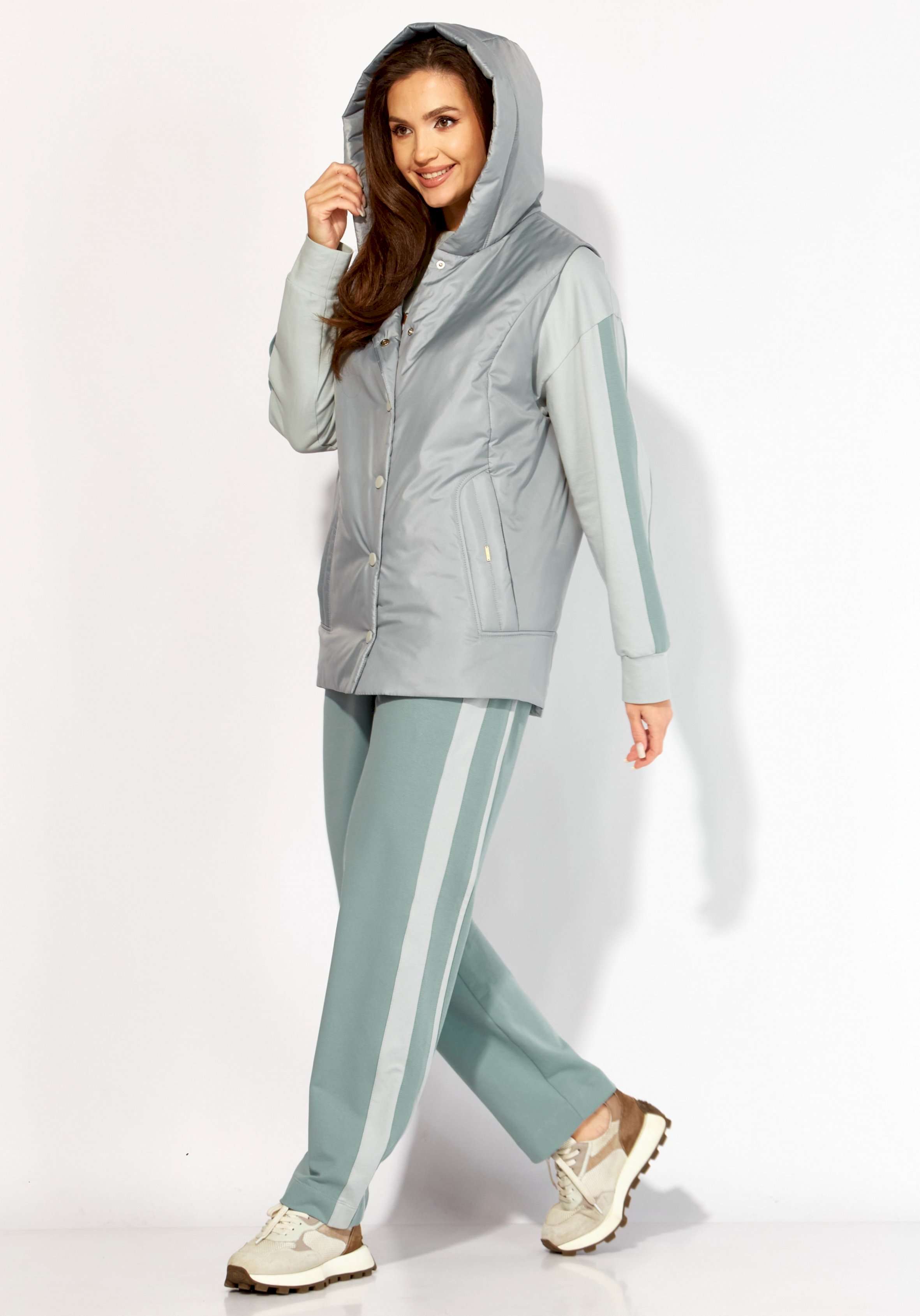 Комплект женский 3х предметный, состоящий из жилета, свитшота и брюк. Жилет прямого силуэта, из плащевки на синтепоне, на подкладке. По переду рельефы из пройм, переходящие в подрез по низу. В рельефах карманы с фигурными листочками. По спинке рельефы из пройм и подрез по низу с отделочной строчкой. Горловина оформлена капюшоном с планкой. Застежка центральная на кнопки. Костюм выполнен из трикотажного полотна (2х нитка) Свитшот прямого силуэта с длинным рукавом. Рукав со спущенной линией плеча и манжета по низу. На рукаве отделочные лампасы и кант. Горловина круглая с отрезной бейкой. По переду яркий принт. Спинка без особенностей. Брюки зауженные к низу с карманами по переду. По бокам отделочные лампасы и кант. Пояс притачной с резинкой по кругу.