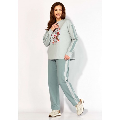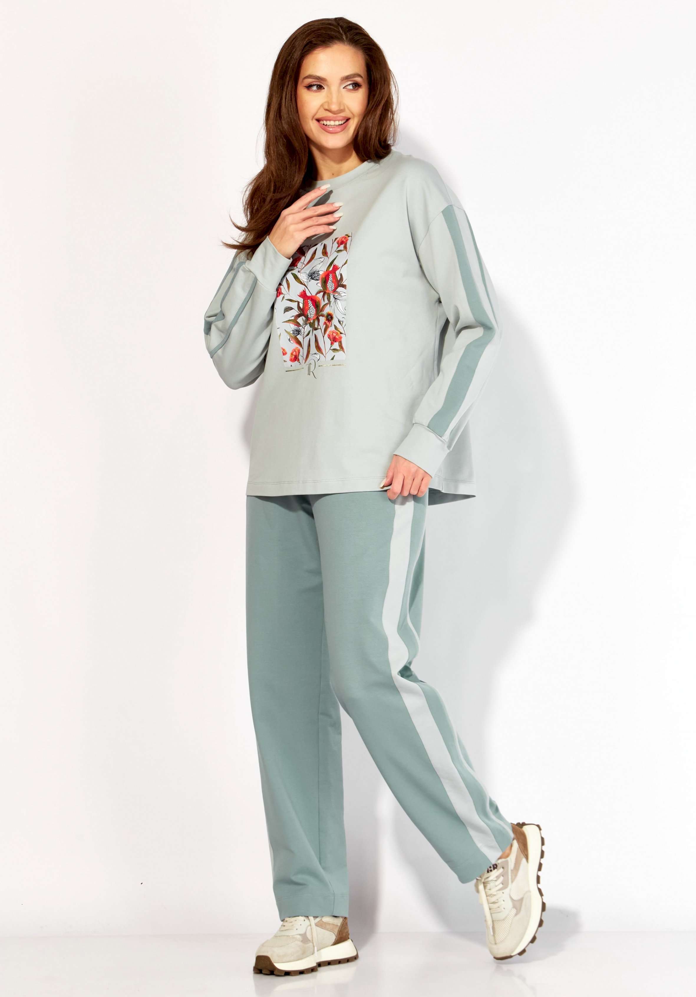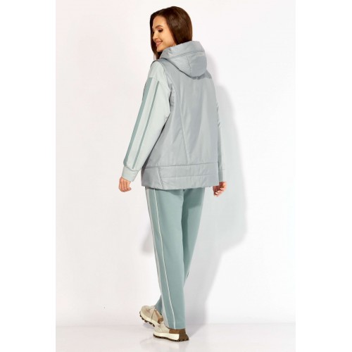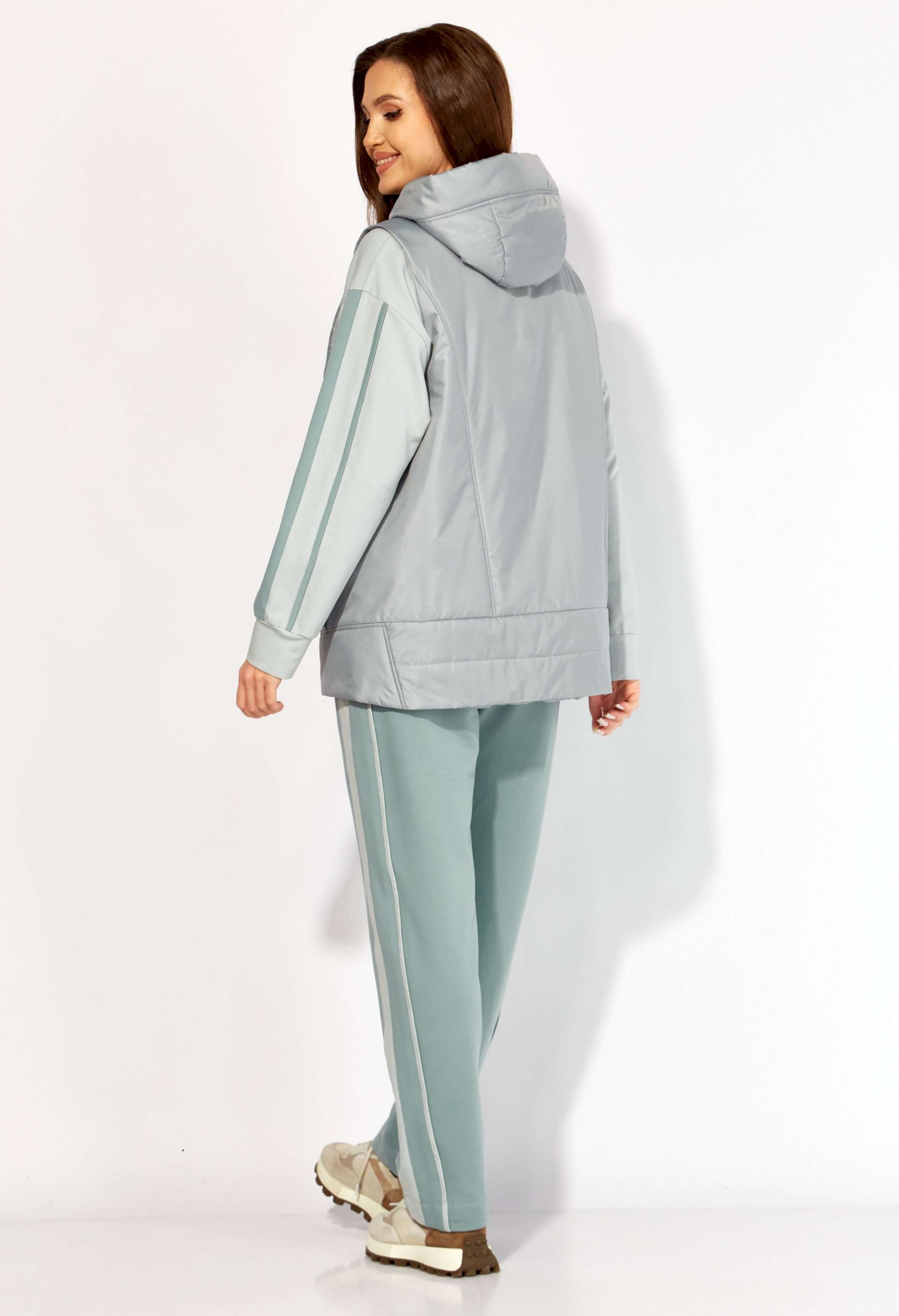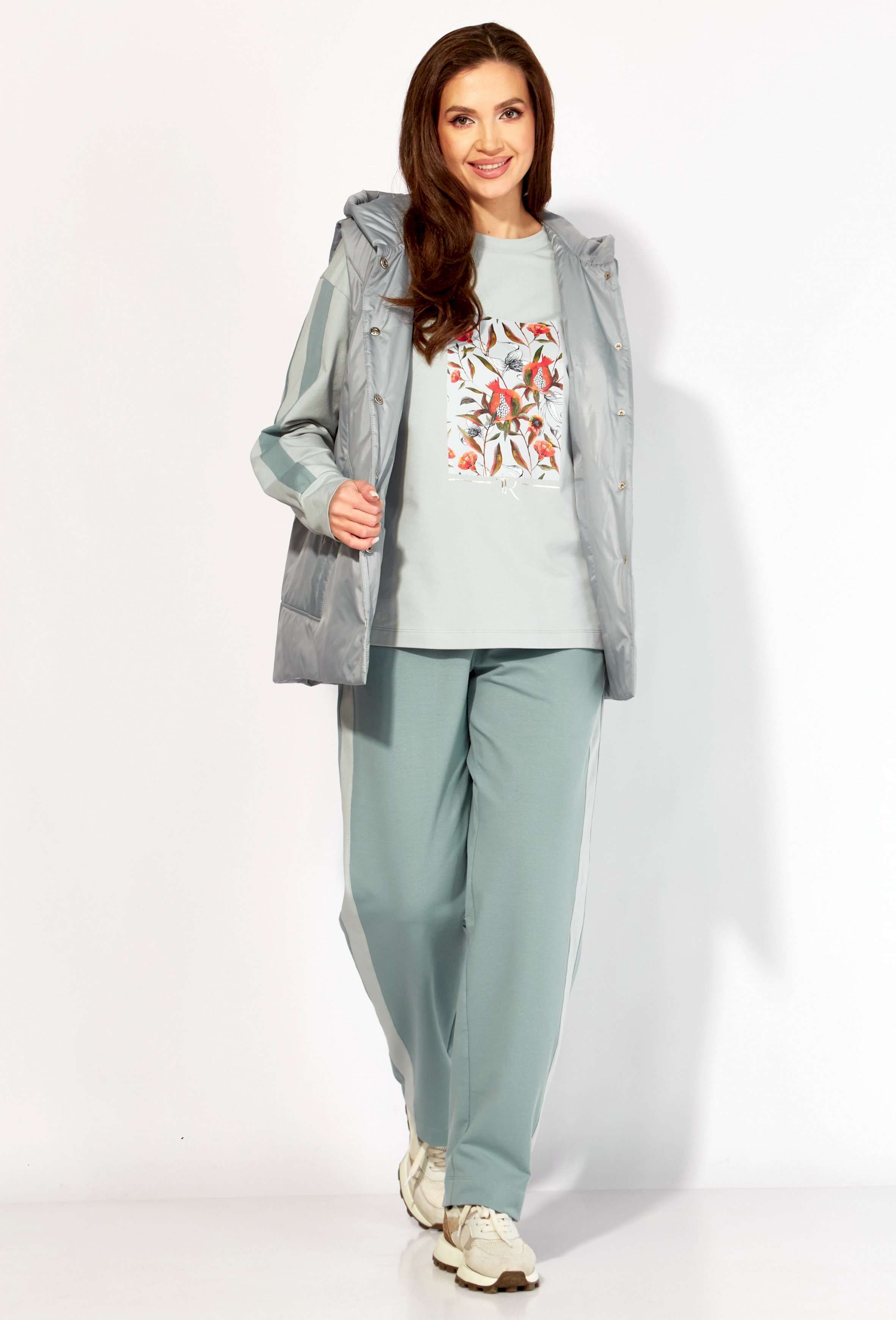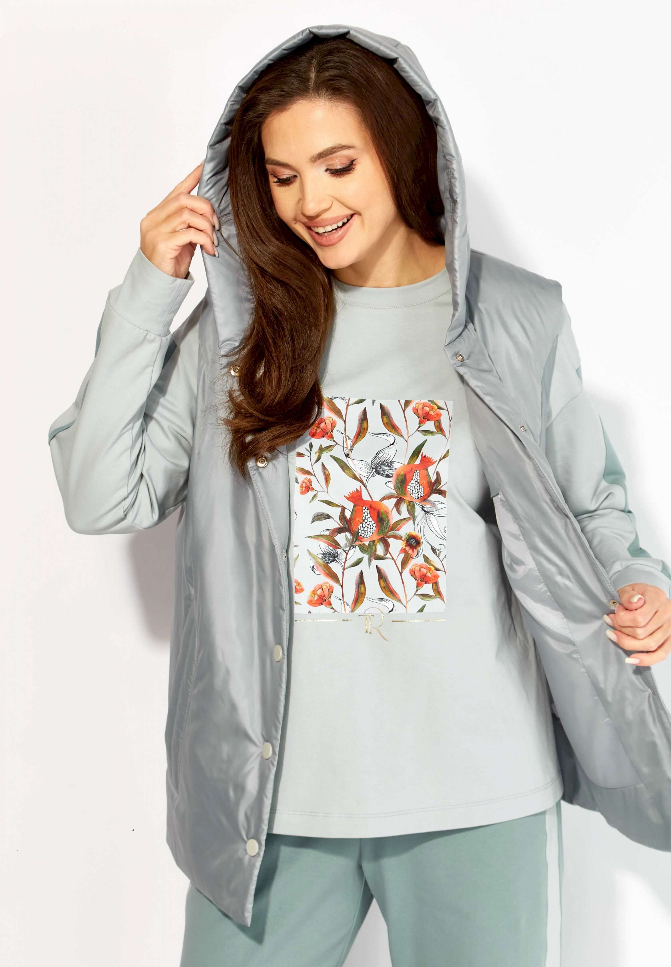Комплект женский 3х предметный, состоящий из жилета, свитшота и брюк. Жилет прямого силуэта, из плащевки на синтепоне, на подкладке. По переду рельефы из пройм, переходящие в подрез по низу. В рельефах карманы с фигурными листочками. По спинке рельефы из пройм и подрез по низу с отделочной строчкой. Горловина оформлена капюшоном с планкой. Застежка центральная на кнопки. Костюм выполнен из трикотажного полотна (2х нитка) Свитшот прямого силуэта с длинным рукавом. Рукав со спущенной линией плеча и манжета по низу. На рукаве отделочные лампасы и кант. Горловина круглая с отрезной бейкой. По переду яркий принт. Спинка без особенностей. Брюки зауженные к низу с карманами по переду. По бокам отделочные лампасы и кант. Пояс притачной с резинкой по кругу.
