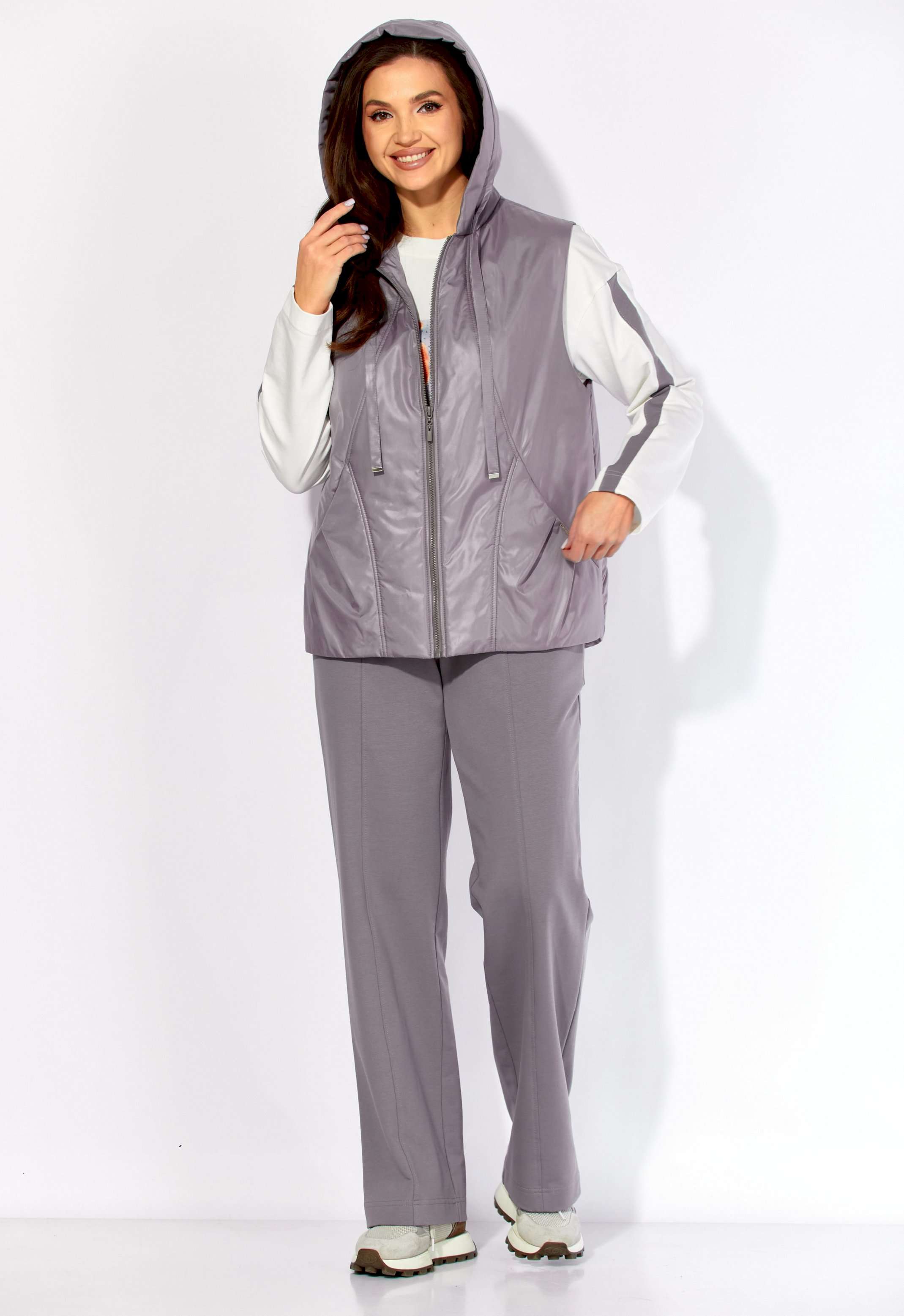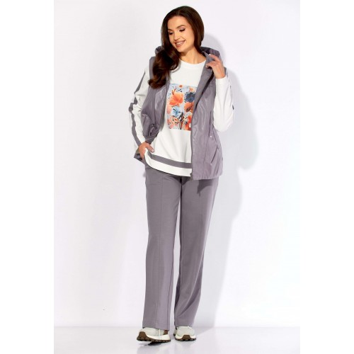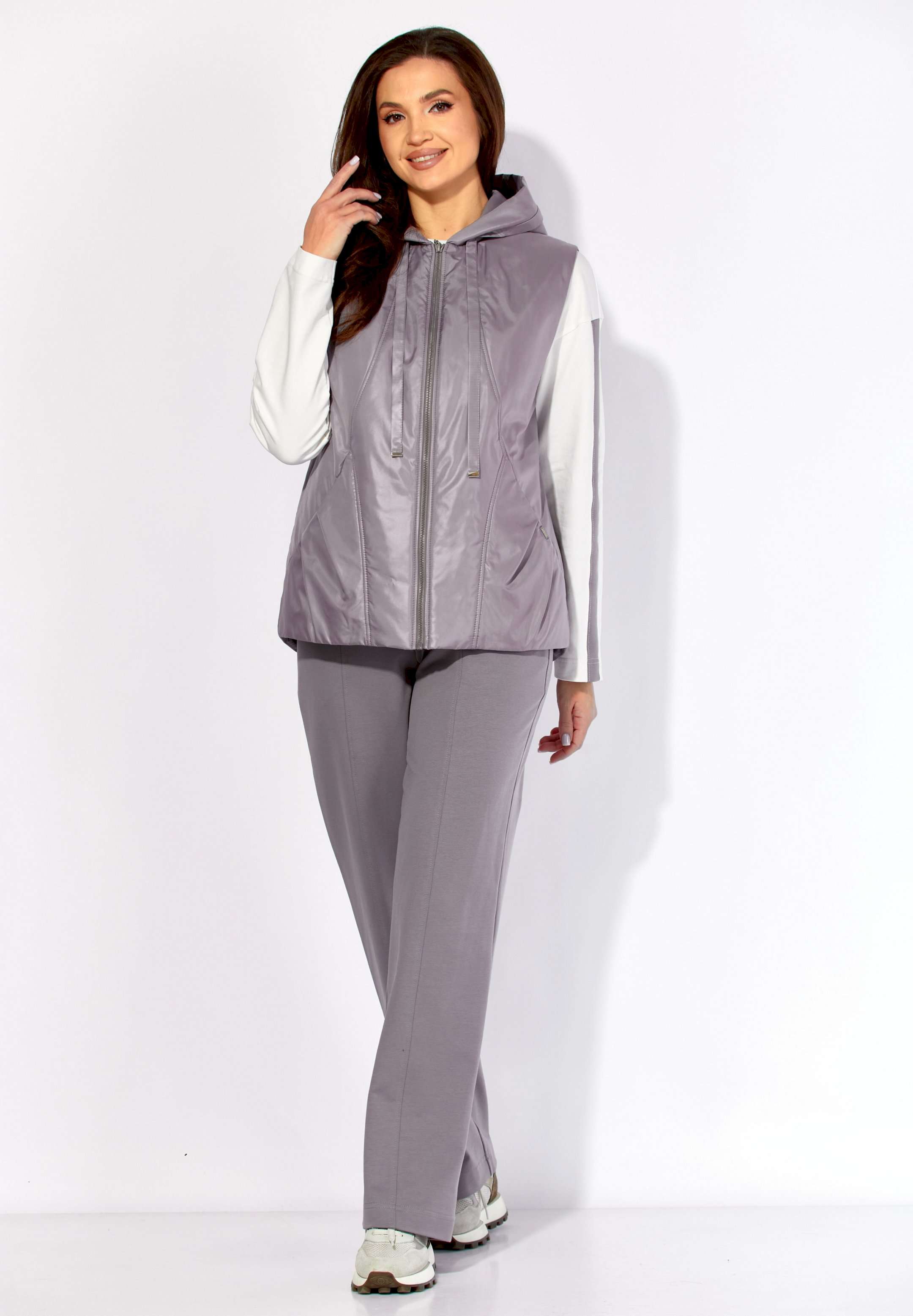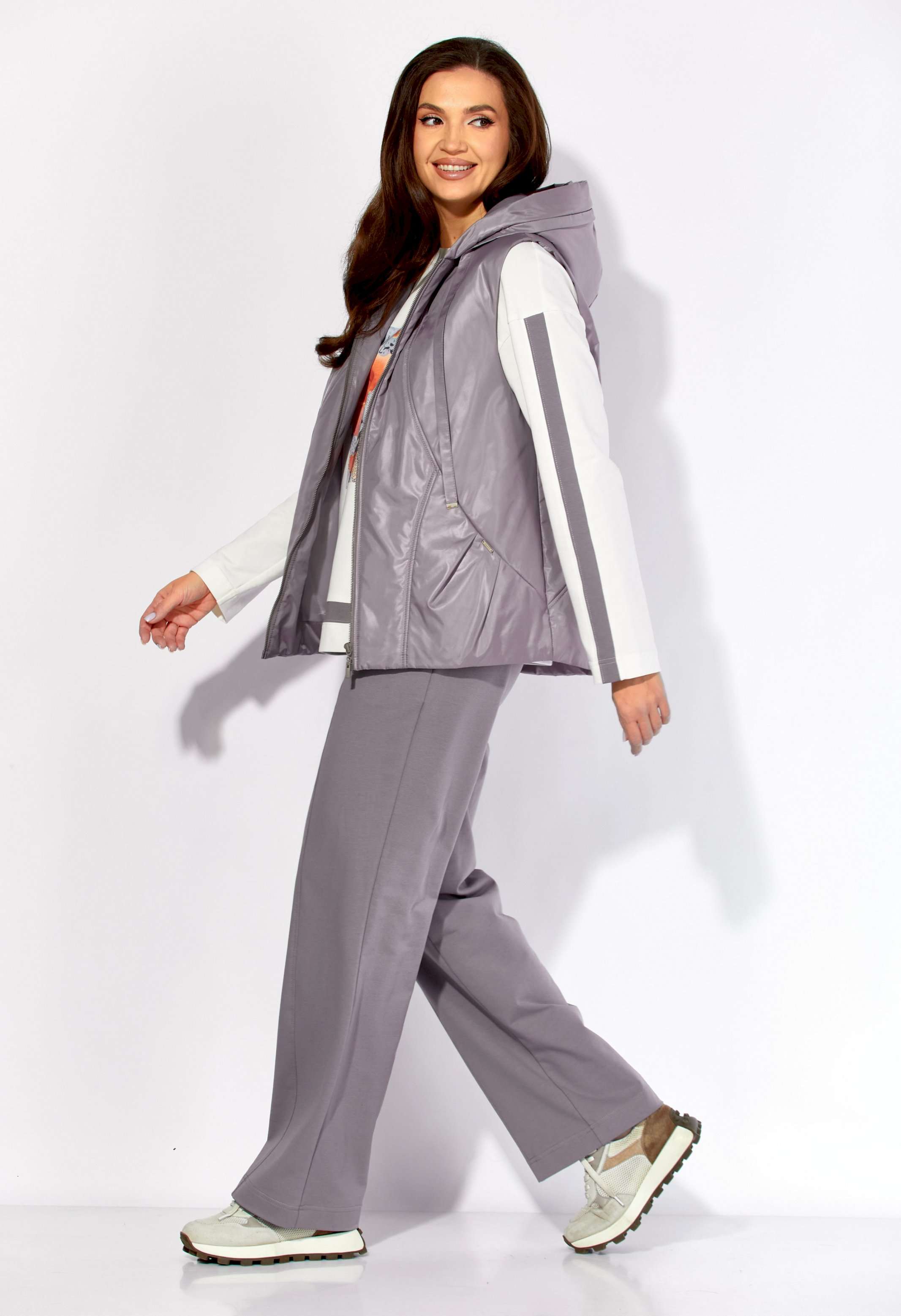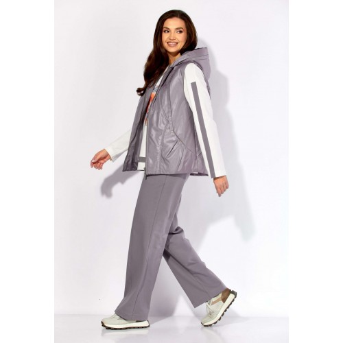 Комплект женский ,3х предметный, состоящий из жилета свитшота и брюк. Жилет прямого силуэта, из плащевки на синтепоне, на подкладке. По переду рельефы из горловины. В рельефах карманы с мягкими складками. Застежка центральная, на \"молнию\" Горловина оформлена капюшоном с кулисой. По спинке рельефы в боковой шов. Свитшот прямого силуэта с длинным рукавом. Рукав со спущенной линией плеча. Горловина круглой формы с подрезной бейкой. По центру рукавов и низу свитшота вставки(полоски) из полотна контрастного цвета. По бокам разрезы. Перед задекорирован принтом. Брюки прямые, с карманами. Спереди рельефы с отделочными строчками. Пояс притачной, частично на резинке.