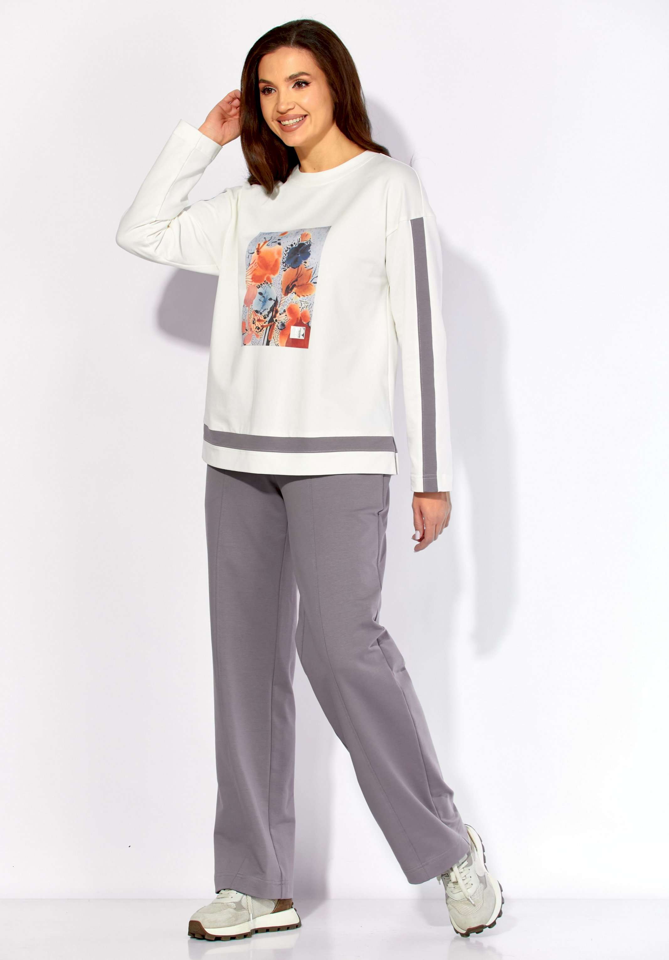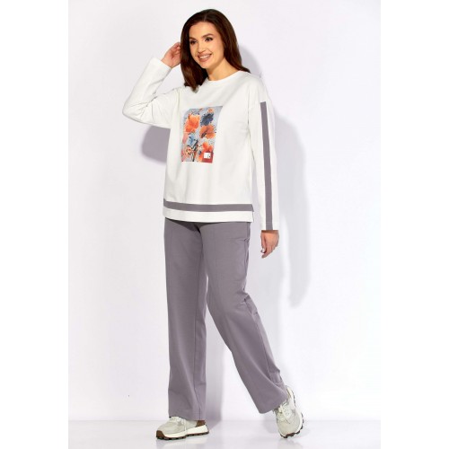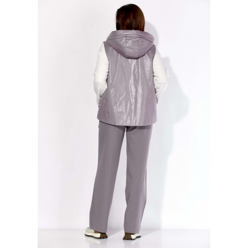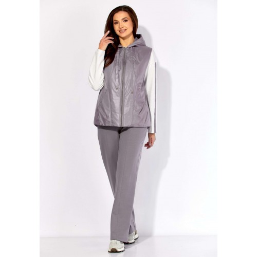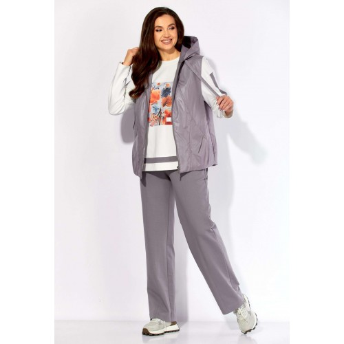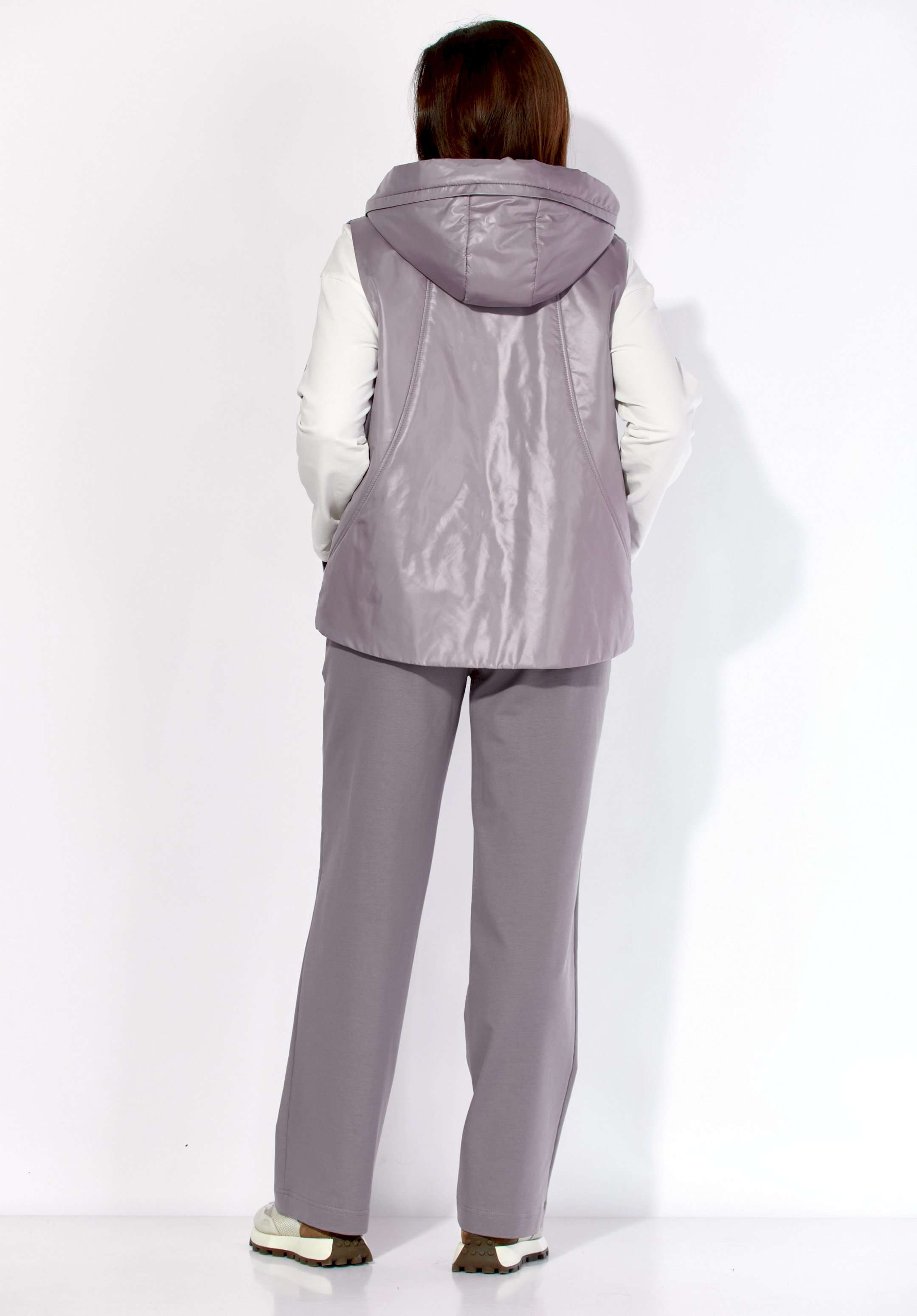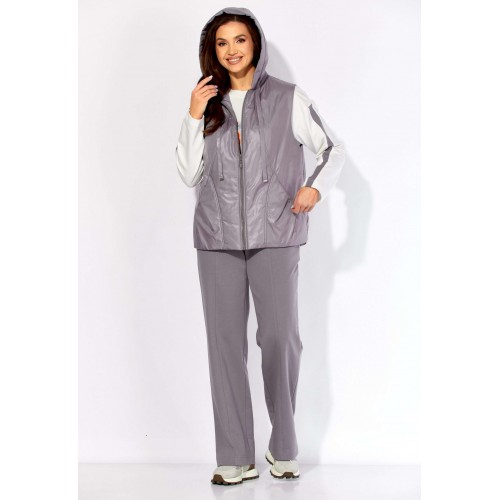 Комплект женский ,3х предметный, состоящий из жилета свитшота и брюк. Жилет прямого силуэта, из плащевки на синтепоне, на подкладке. По переду рельефы из горловины. В рельефах карманы с мягкими складками. Застежка центральная, на \"молнию\" Горловина оформлена капюшоном с кулисой. По спинке рельефы в боковой шов. Свитшот прямого силуэта с длинным рукавом. Рукав со спущенной линией плеча. Горловина круглой формы с подрезной бейкой. По центру рукавов и низу свитшота вставки(полоски) из полотна контрастного цвета. По бокам разрезы. Перед задекорирован принтом. Брюки прямые, с карманами. Спереди рельефы с отделочными строчками. Пояс притачной, частично на резинке.