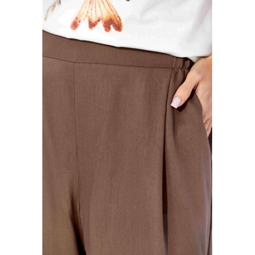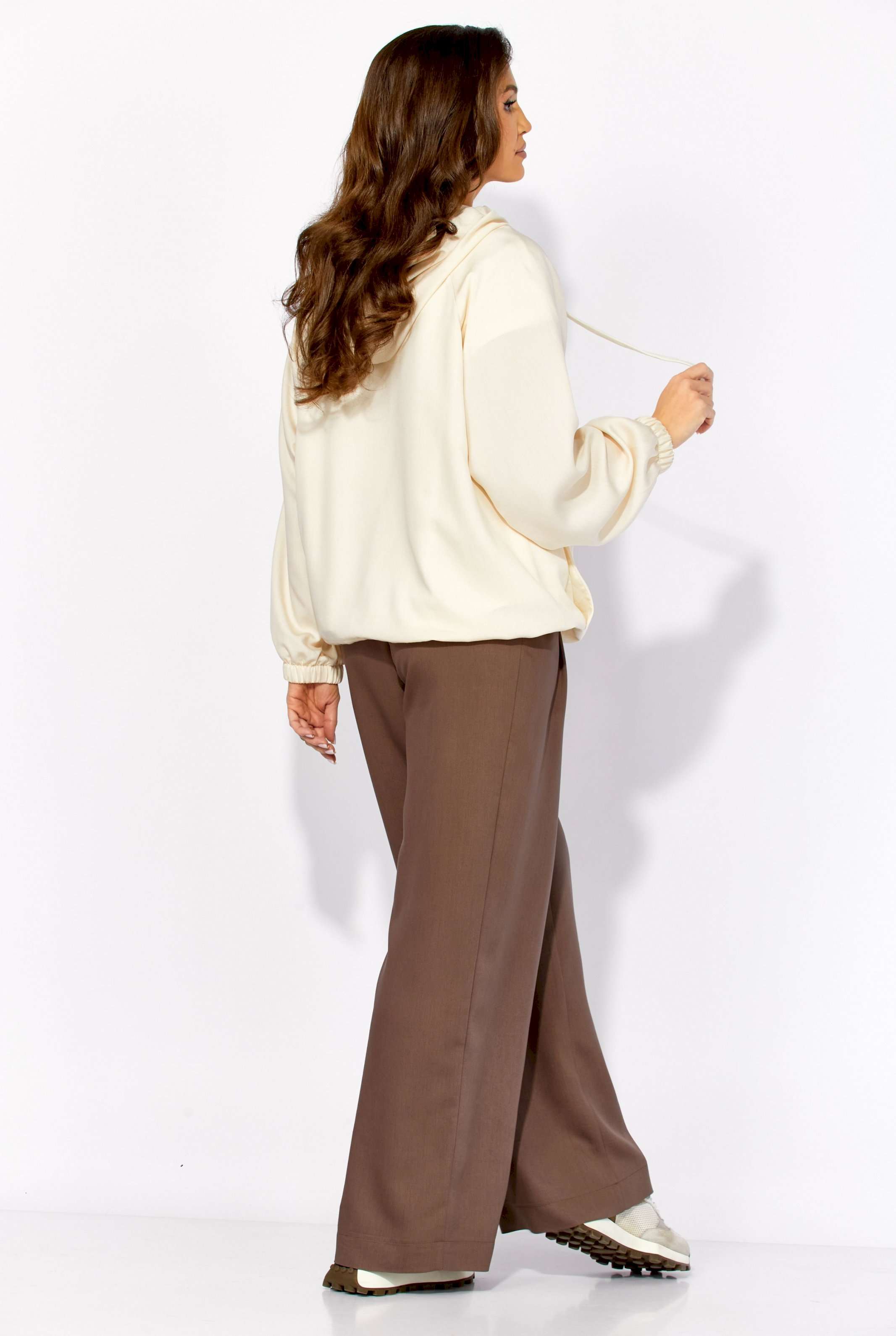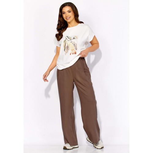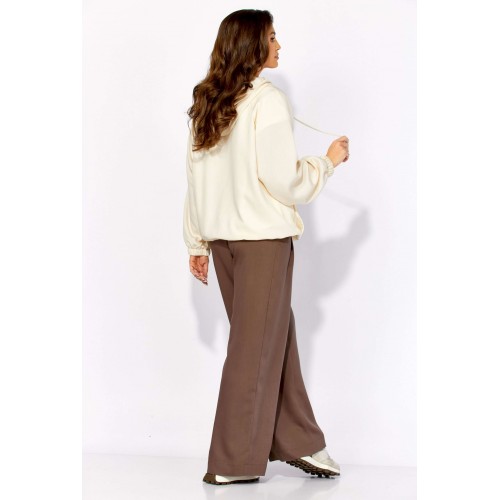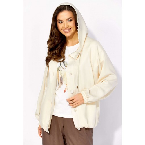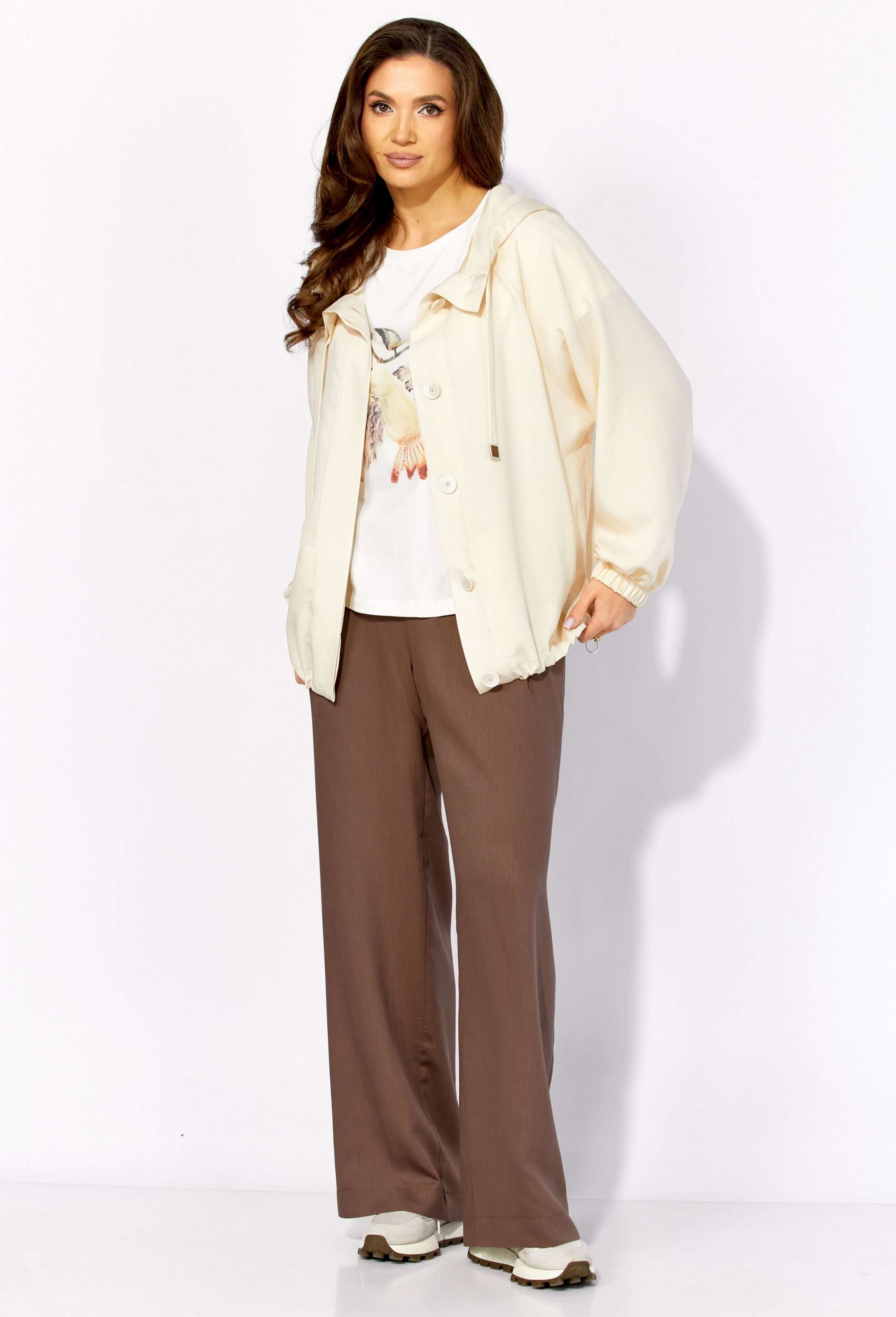 Комплект женский, 3х предметный, состоящий из куртки брюк и топа. Куртка-парка, облегченная, без подкладки, прямого силуэта. Рукав реглан, длинный, по низу на резинке. Горловина оформлена капюшоном с кулисой. По переду карманы в рельефах. Застежка центральная, потайная, на петли и пуговицы. Низ куртки регулируется кулисой с фиксатором по бокам. Спинка без особенностей. Топ из трикотажного хлопкового полотна, прямого силуэта с коротким цельнокройным рукавом. Горловина круглая, с подрезной планкой. Перед задекорирован принтом. Брюки прямые, широкие. По переду наклонные карманы и ягкие складки. Пояс притачной, по центру гладкий, дальше с резиной. В брюках подкладка (шорты).