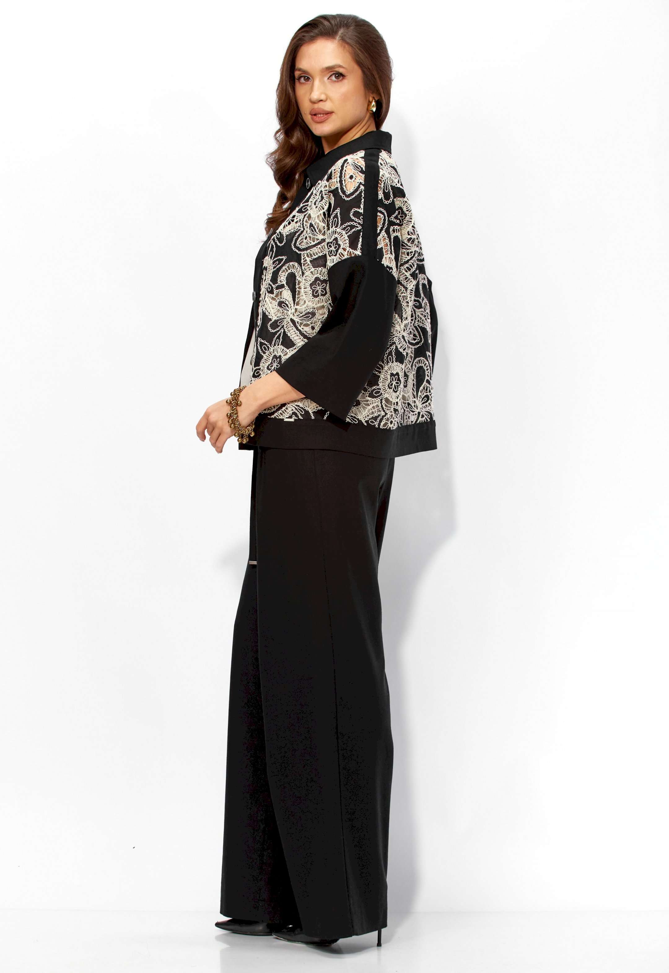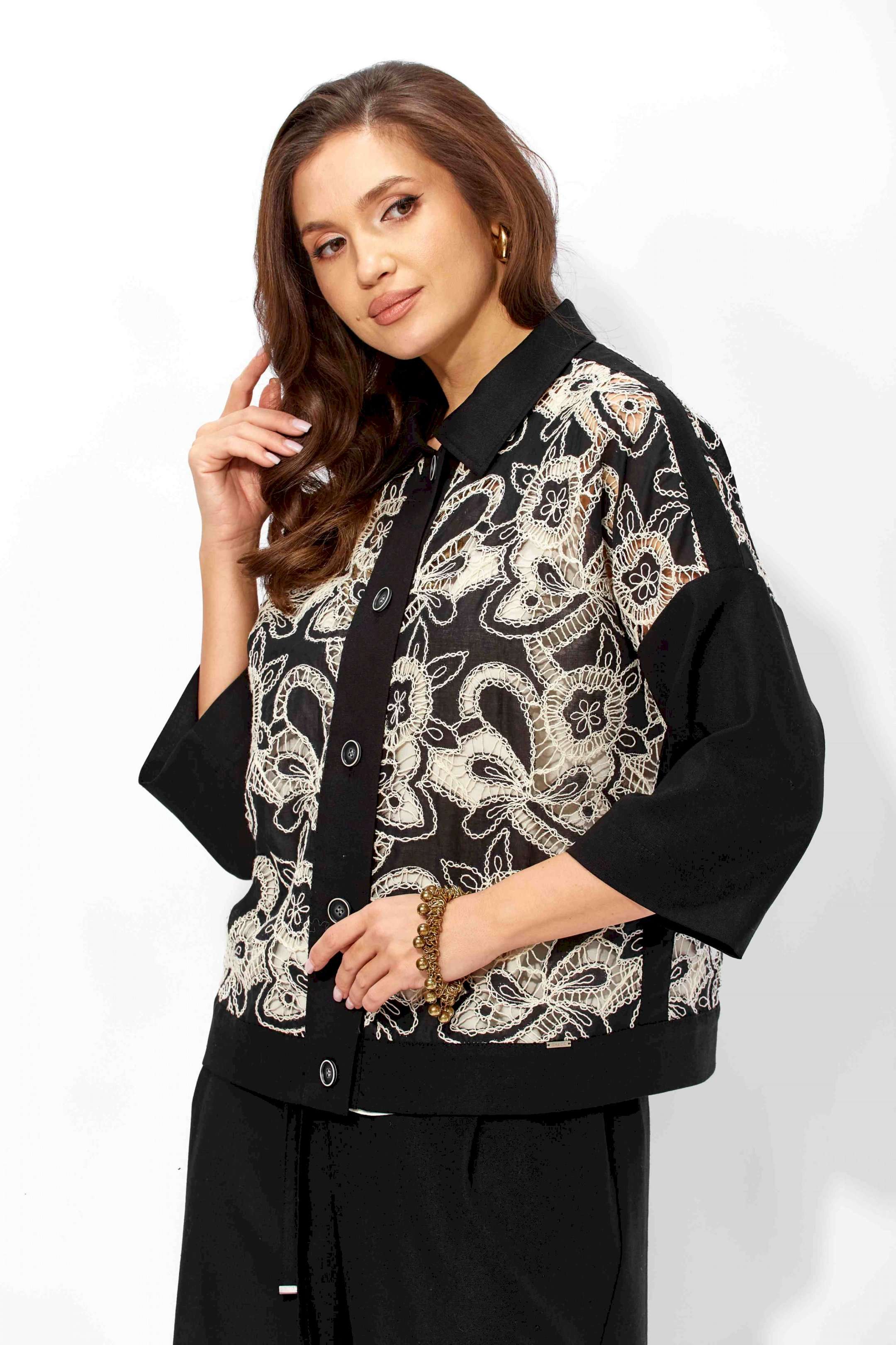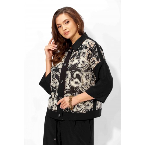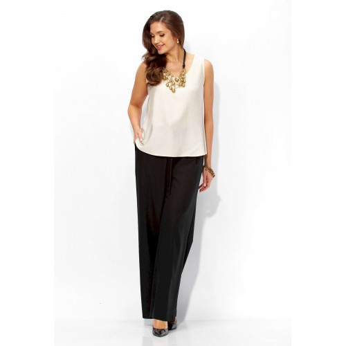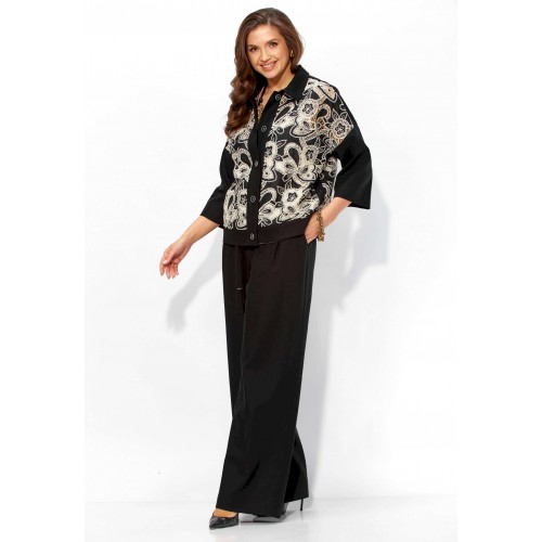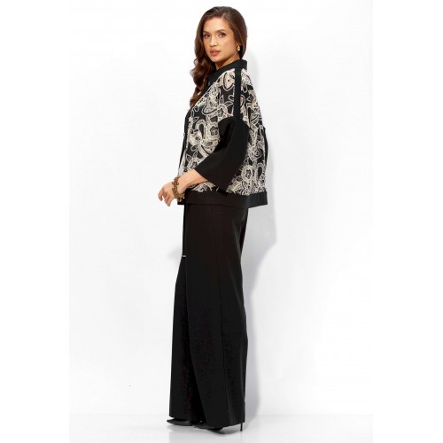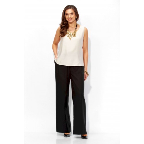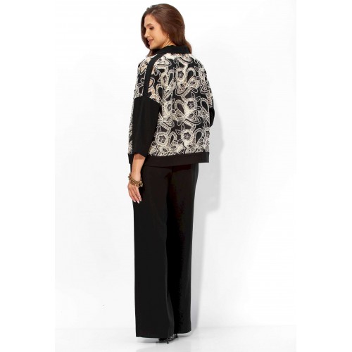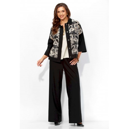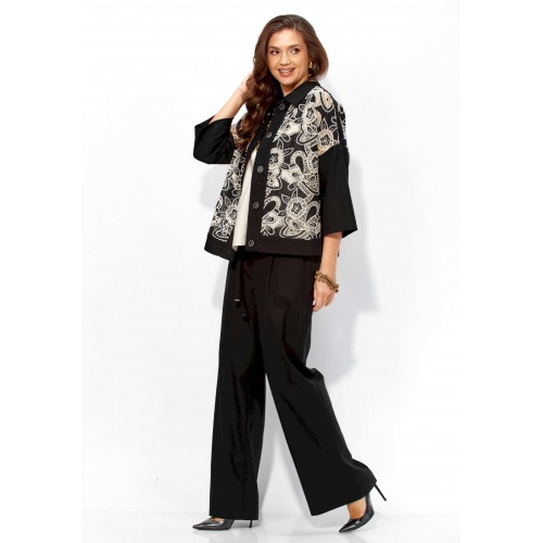 Комплект женский, 3х предметный, состоящий из жакета, топа и брюк. Жакет прямого силуэта, с рукавом длинной 3/4. Рукав со спущенной линией проймы. По плечевым и боковым швам узкие вставки. Воротник рубашечный. Застежка центральная, с отрезной планкой, на петли и пуговицы. По низу так же отрезная планка. Брюки широкие, прямые, спереди наклонные карманы. Застежка спереди на тесьму \"молния\" под гульфик. Пояс притачной с застежкой на петлю и пуговицу. Центральная часть пояса с кулисой, дальше, по спинке резинка. Топ прямого силуэта, без рукавов. Вырез горловины круглой формы, углубленный.