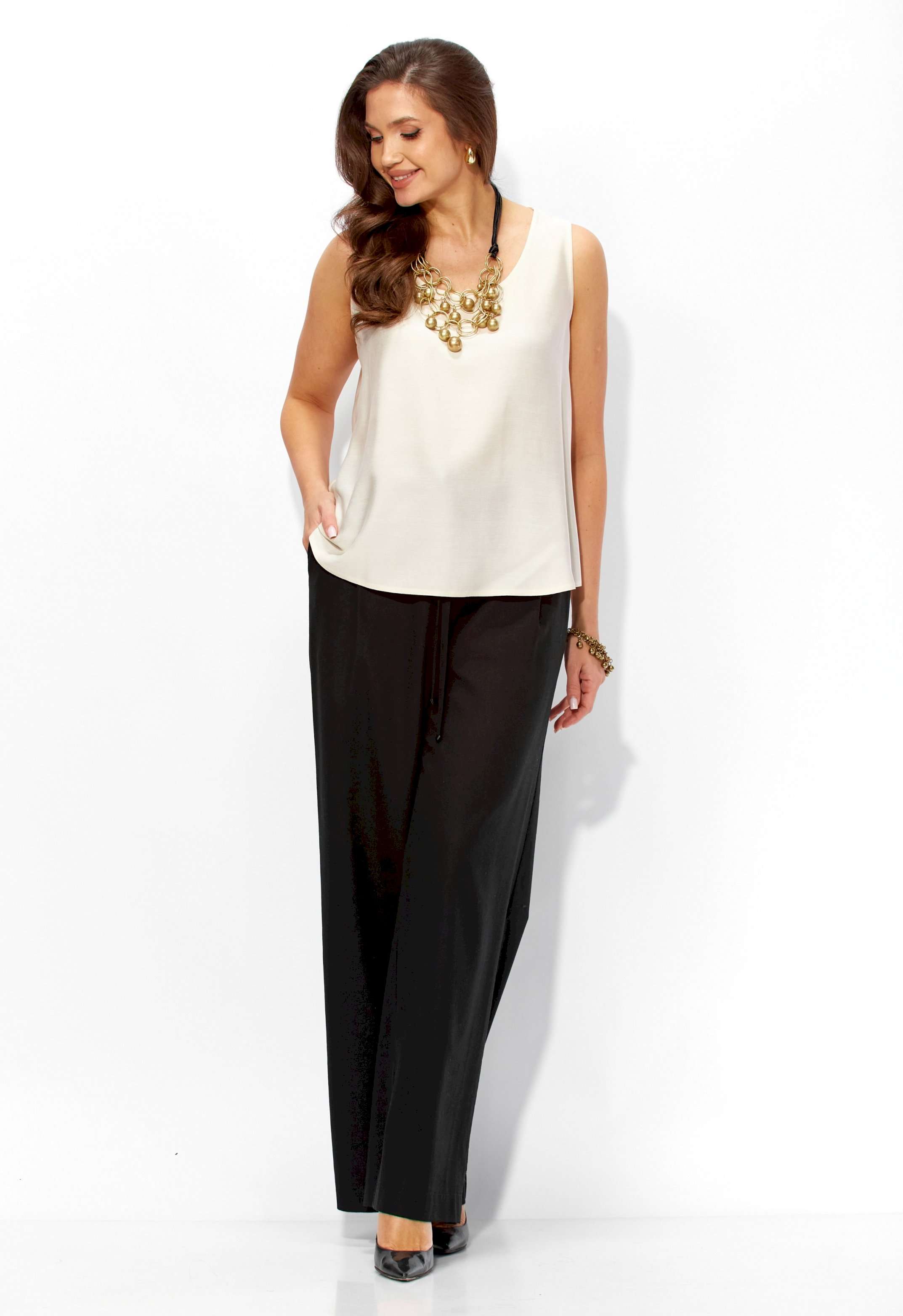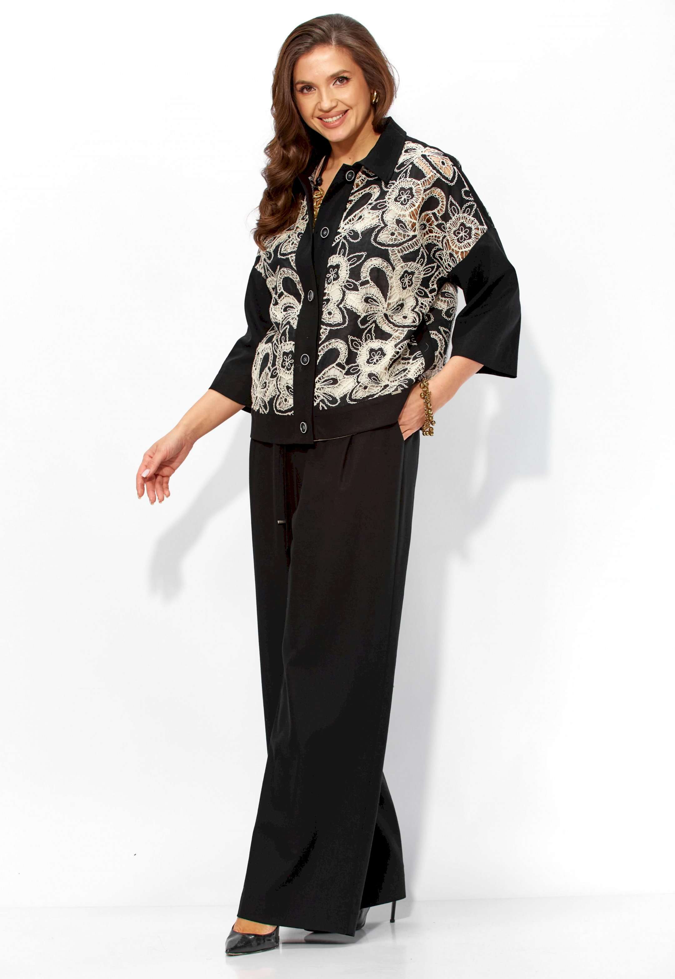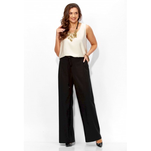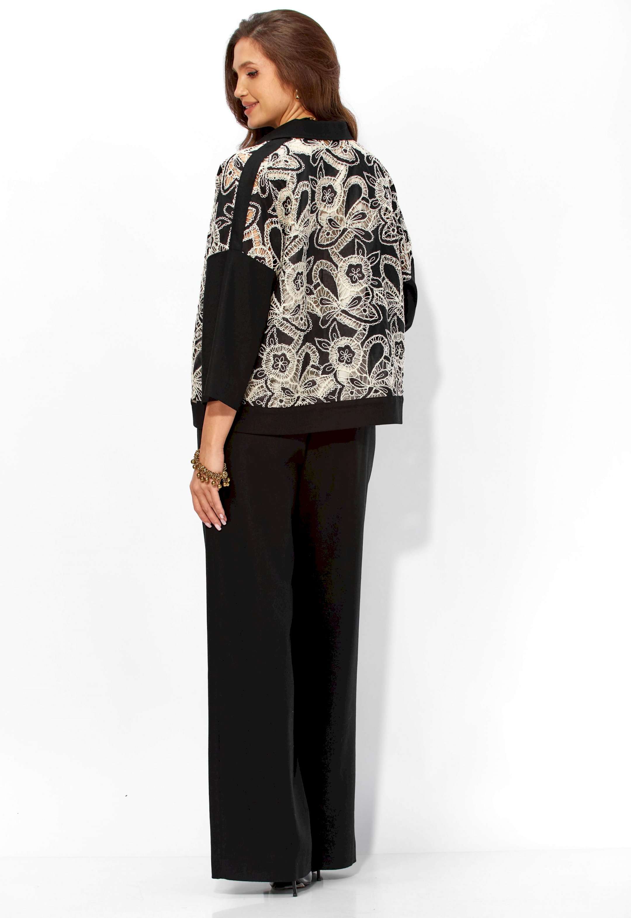 Комплект женский, 3х предметный, состоящий из жакета, топа и брюк. Жакет прямого силуэта, с рукавом длинной 3/4. Рукав со спущенной линией проймы. По плечевым и боковым швам узкие вставки. Воротник рубашечный. Застежка центральная, с отрезной планкой, на петли и пуговицы. По низу так же отрезная планка. Брюки широкие, прямые, спереди наклонные карманы. Застежка спереди на тесьму \"молния\" под гульфик. Пояс притачной с застежкой на петлю и пуговицу. Центральная часть пояса с кулисой, дальше, по спинке резинка. Топ прямого силуэта, без рукавов. Вырез горловины круглой формы, углубленный.