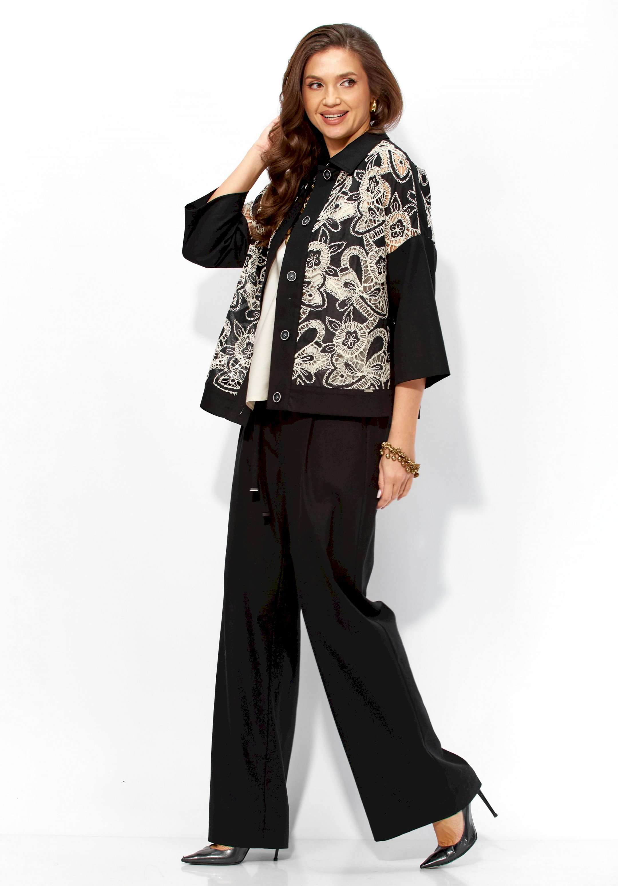 Состав: Жакет: хлопок 100%. Брюки: лен 70%, вискоза 30%. Топ: вискоза 75%, полиэстер 25%