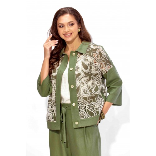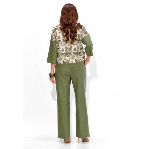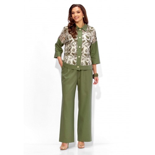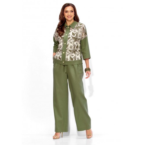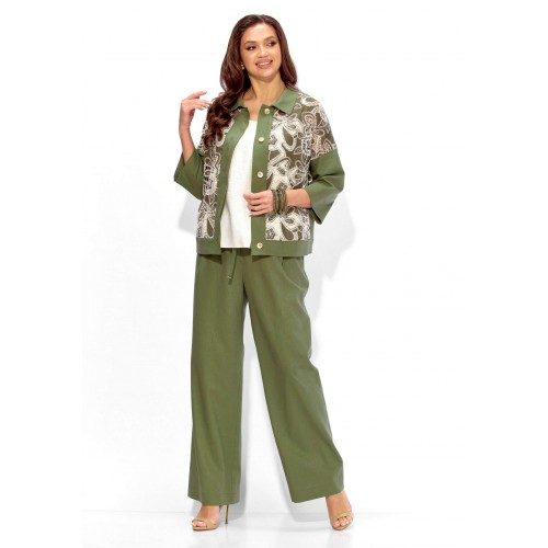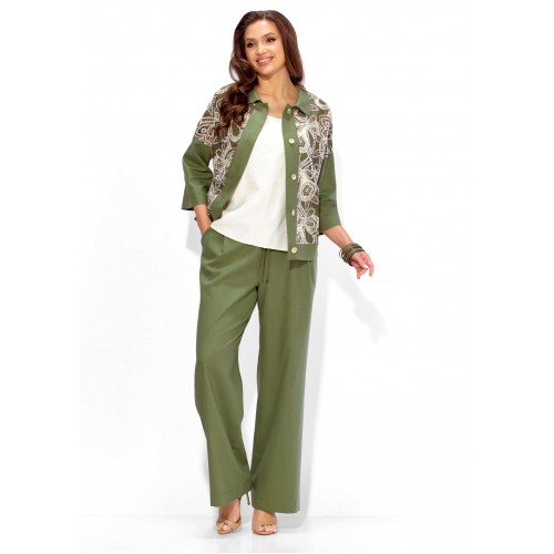 Комплект женский, 3х предметный, состоящий из жакета, топа и брюк. Жакет прямого силуэта, с рукавом длинной 3/4. Рукав со спущенной линией проймы. По плечевым и боковым швам узкие вставки. Воротник рубашечный. Застежка центральная, с отрезной планкой, на петли и пуговицы. По низу так же отрезная планка. Брюки широкие, прямые, спереди наклонные карманы. Застежка спереди на тесьму \"молния\" под гульфик. Пояс притачной с застежкой на петлю и пуговицу. Центральная часть пояса с кулисой, дальше, по спинке резинка. Топ прямого силуэта, без рукавов. Вырез горловины круглой формы, углубленный.