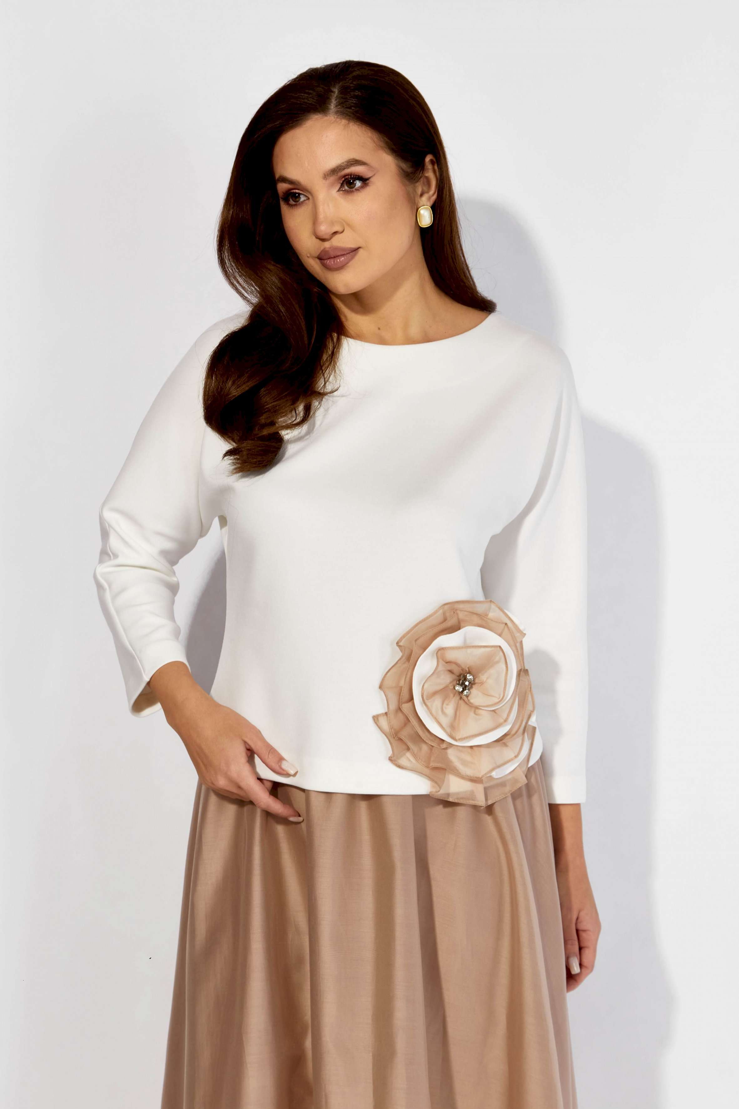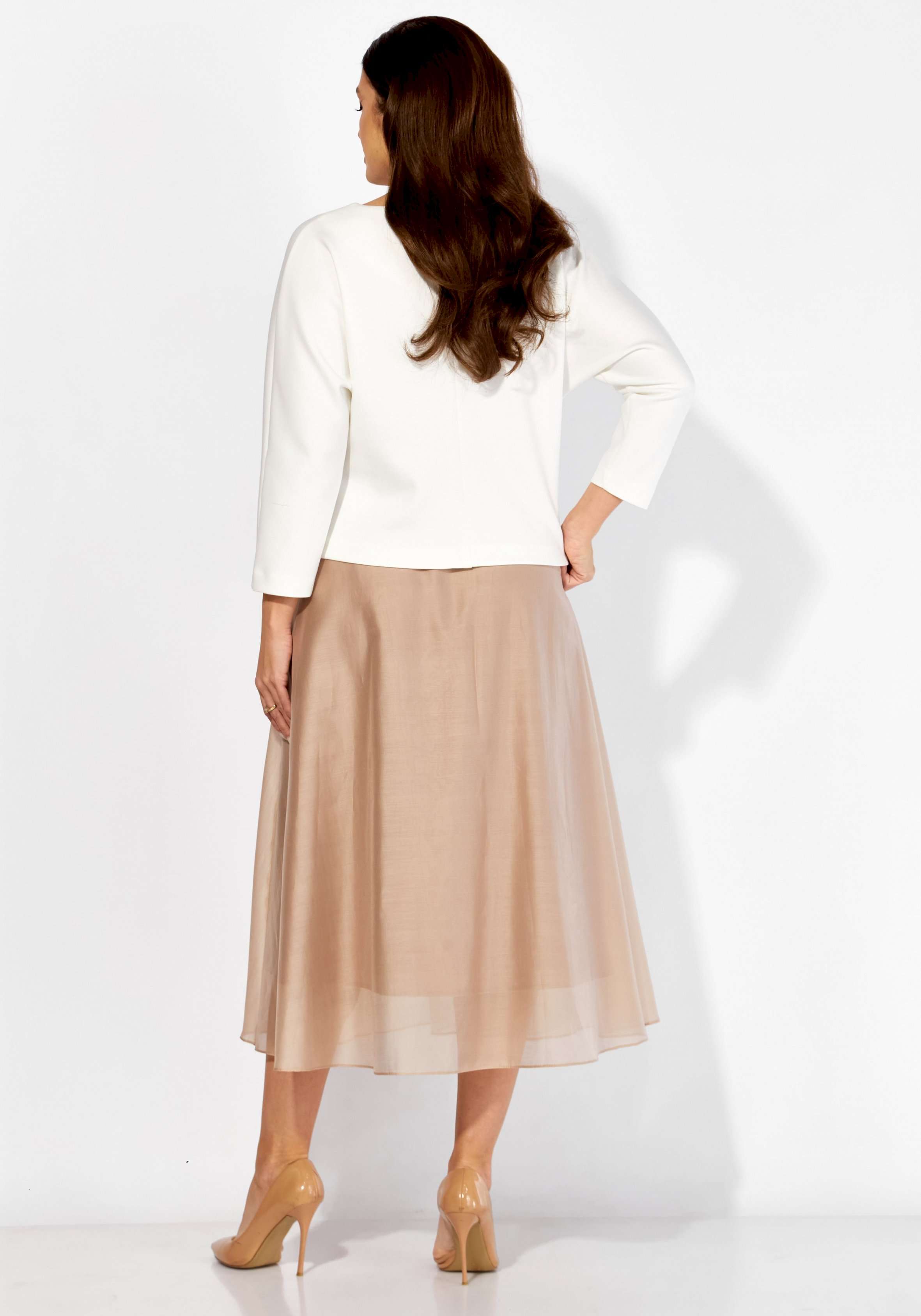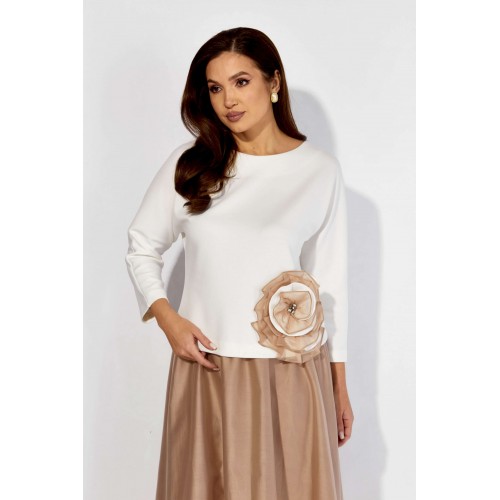 Комплект женский, 2х предметный, состоящий из блузки и юбки. Блузка полуприлегающего силуэта с цельнокройным рукавом длинной 3/4. Выполнена из трикотажного полотна \"ТЕНСЕЛ\". Вырез горловины \"лодочка\" По низу блузки, слева, декоративный элемент из рюши, в сочетании двух видов ткани. По спинке средний шов. Юбка широкая к низу, из текстильной ткани \"вуалька\" На подкладке. Пояс притачной с резинкой по кругу.